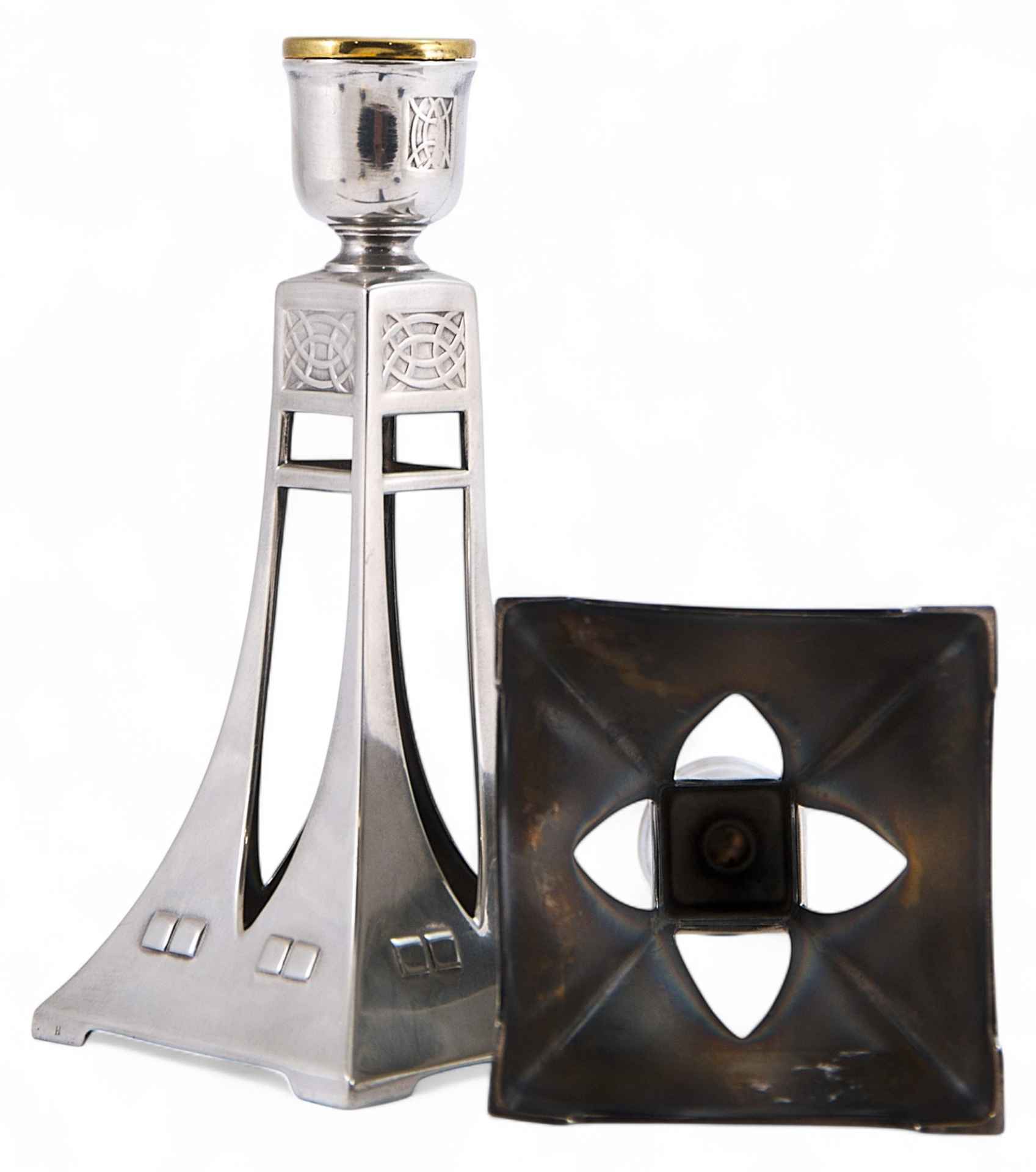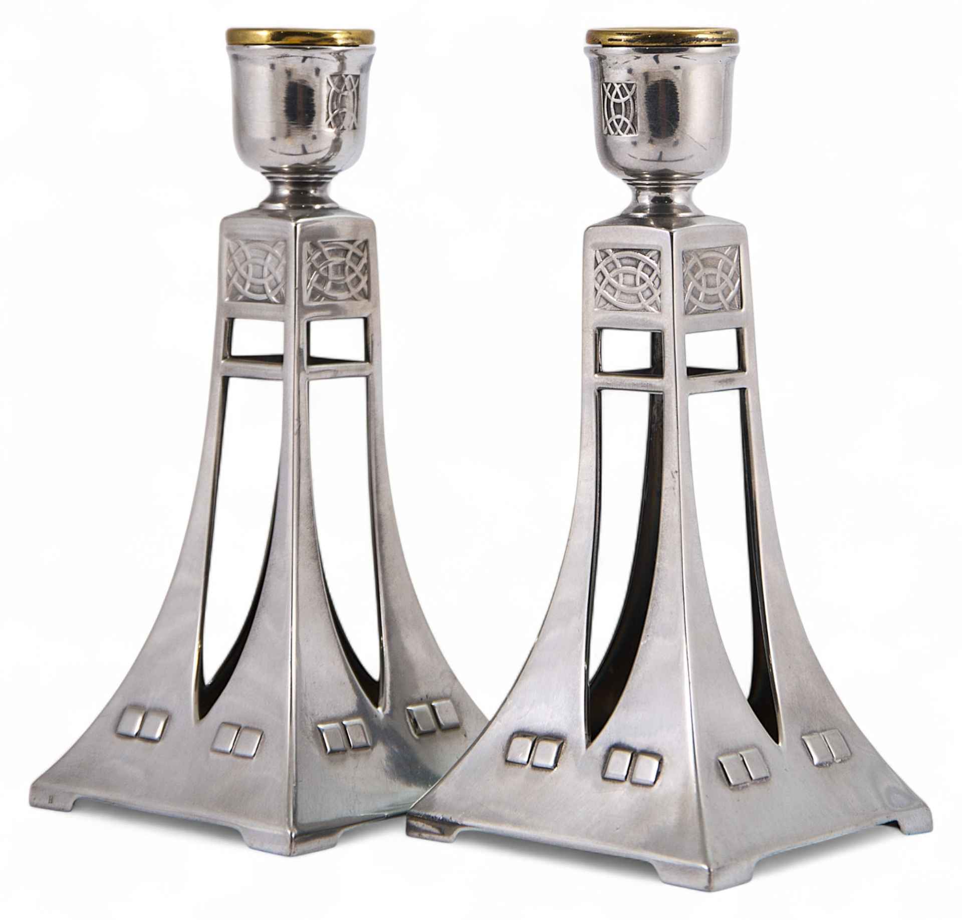 Парные подсвечники, художественное исполнение которых явно указывает на стилевые приемы искусства модерна, вероятнее всего немецкого югендстиля, активно проявившегося в дизайне металлических предметов бытового назначения среди продукции Вюртембергской металлообрабатывающей компании и фабрики А. Плевкевича (Варшава). Югендстиль - немецкое название модерна, или Art Nouveau, который в конце XIX - начале XX веков господствовал во всех странах Европы.