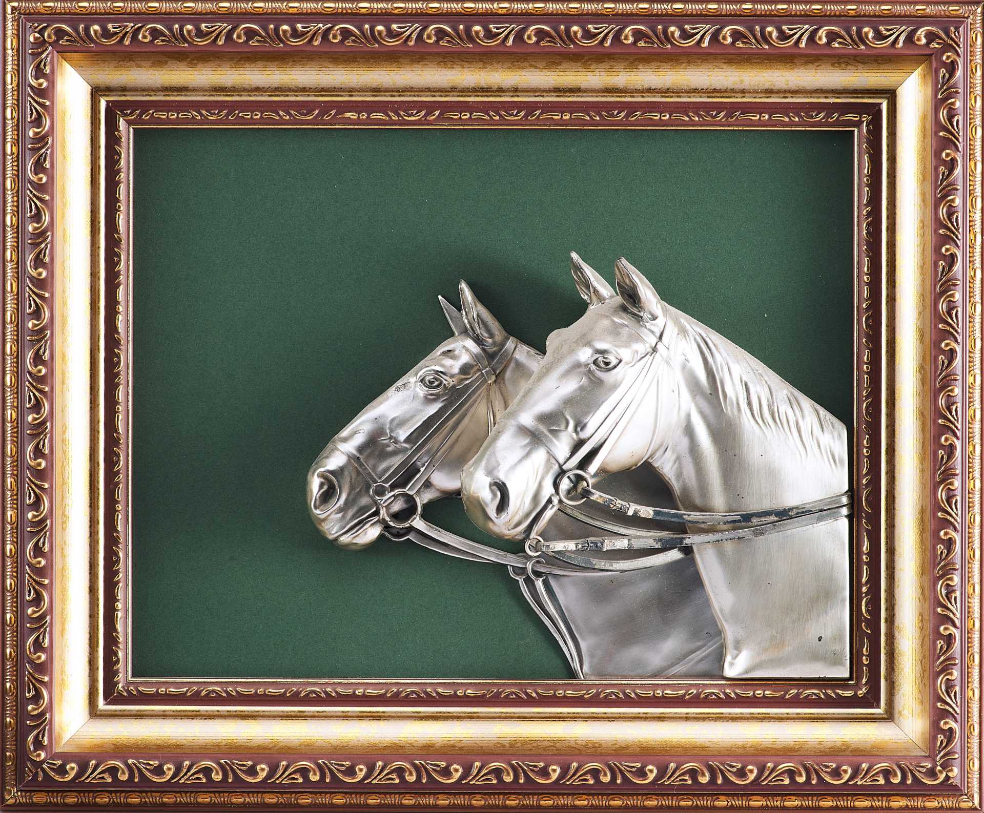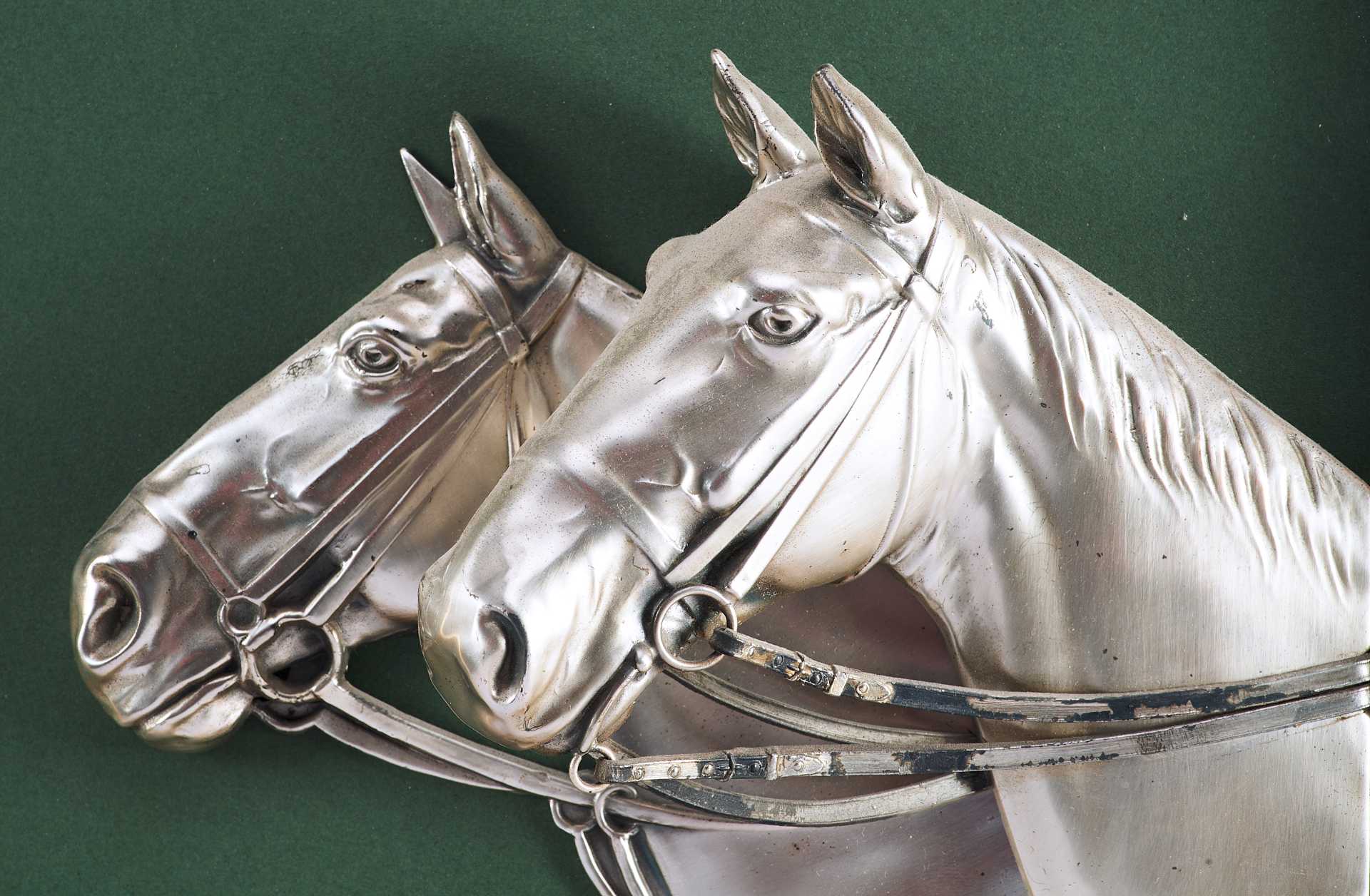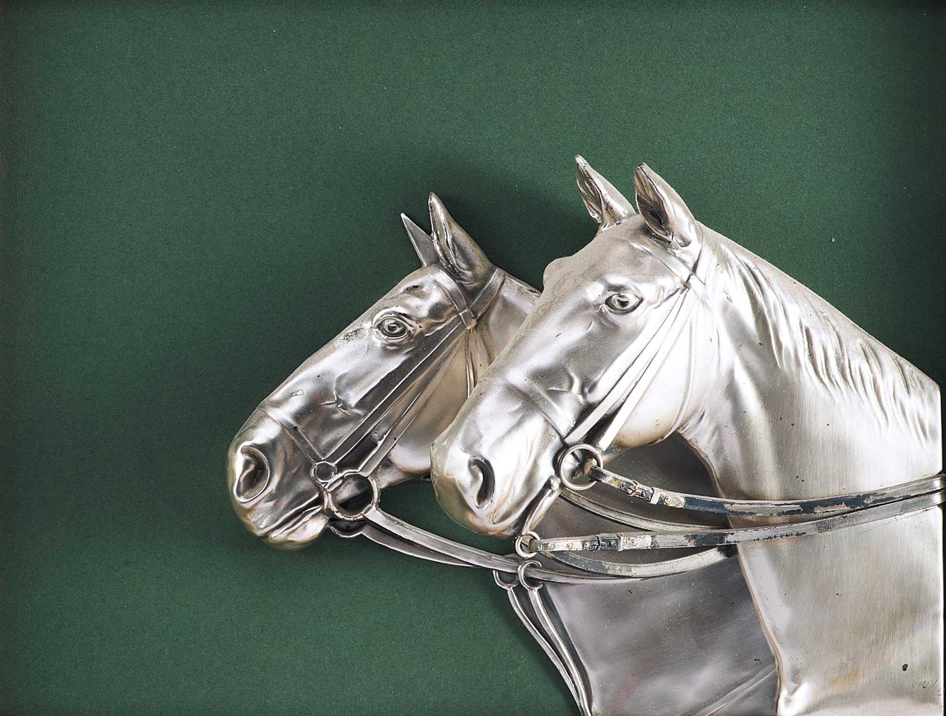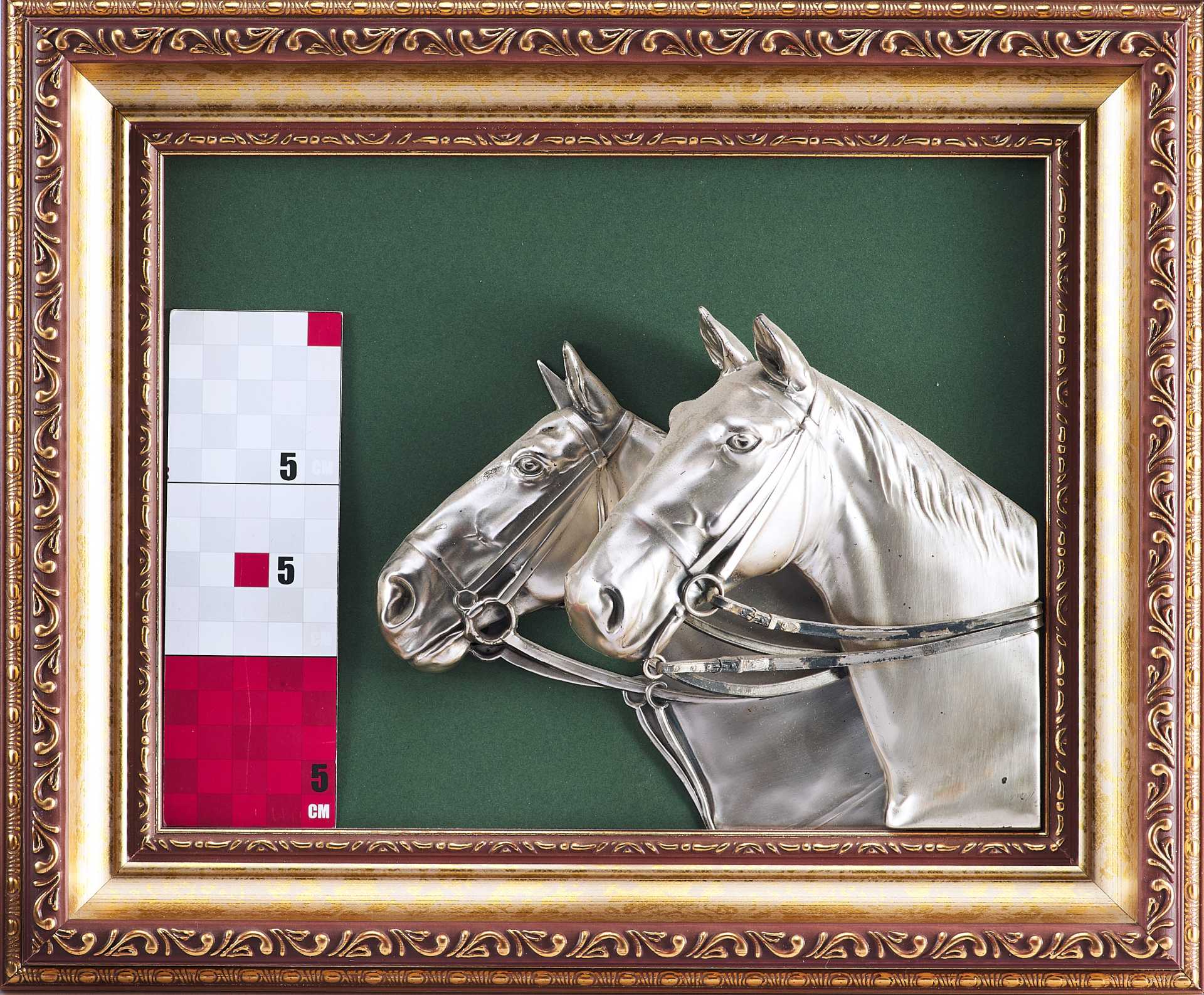 На прямоугольной пластине горельеф, изображающий головы двух запряженных лошадей. Тема изображения лошадей была