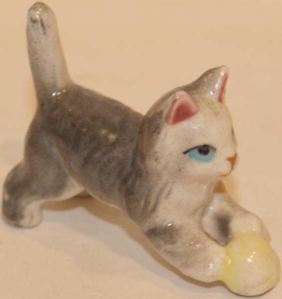 Скульптура полосатого котенка с мячом. Эта фигура относится к серии аналогичных скульптур изображающих кошек и котят в различных позах. Производство подобных фигурок животных (преимущественно кошек и собак) довольно широко распространено в европейском фарфоровом производстве (в особенности в Германии) в середине XX в.