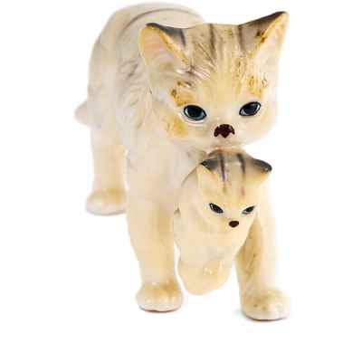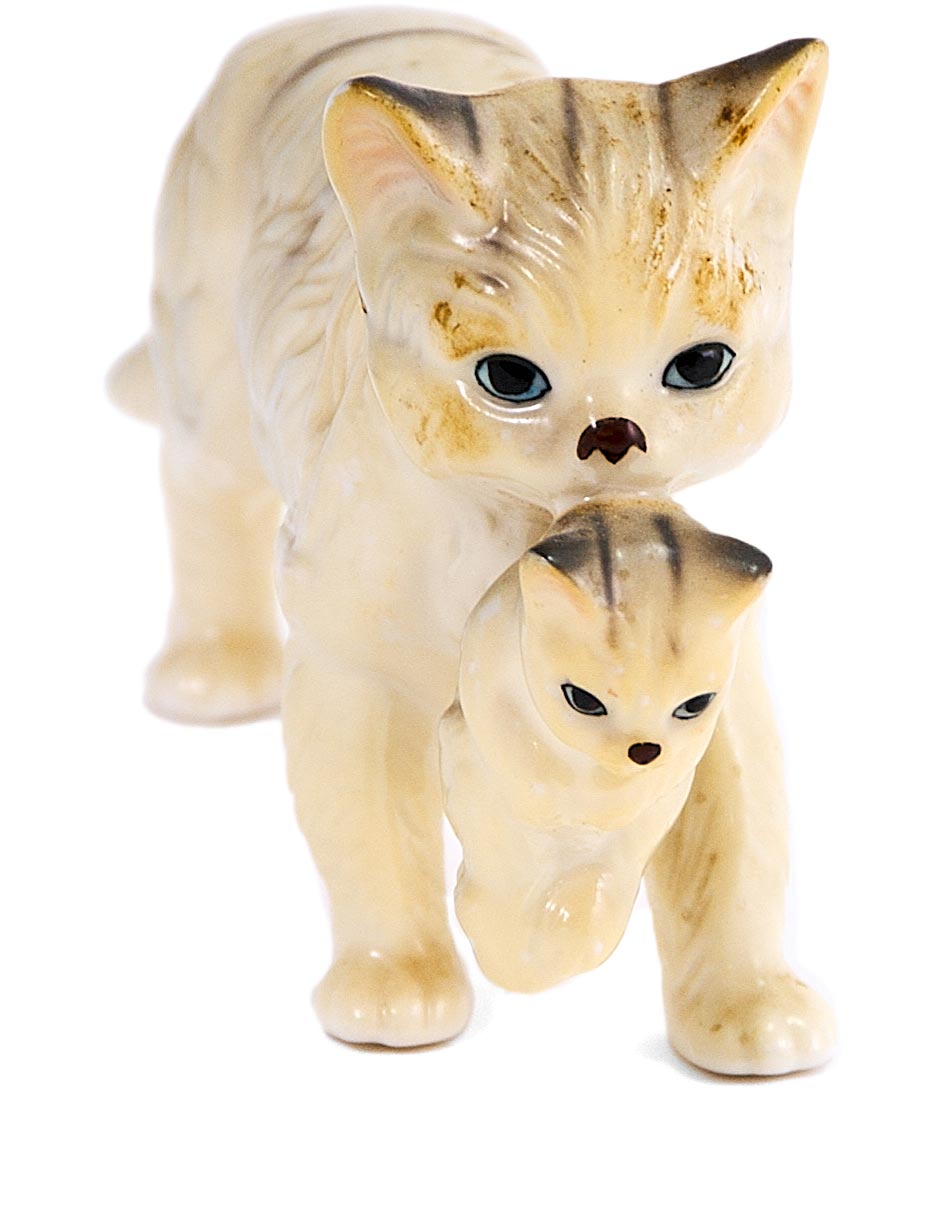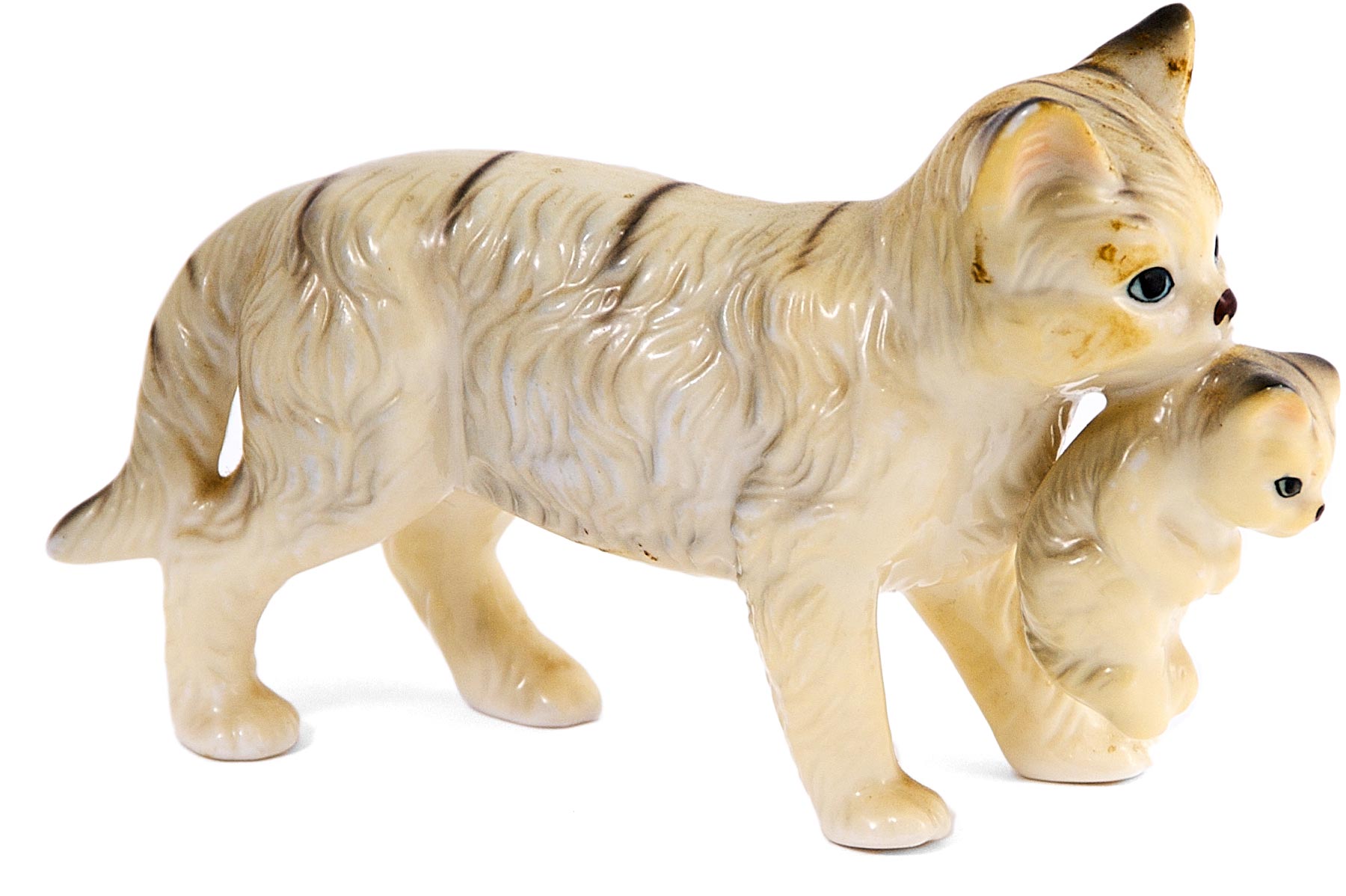Скульптура кошки держащей в зубах котенка. Эта фигура относится к серии аналогичных скульптур изображающих кошек и котят в различных позах. Производство подобных фигурок животных (преимущественно кошек и собак) довольно широко распространено в европейском фарфоровом производстве (в особенности в Германии) в середине ХХв. Фигура изготовлена на профессиональном уровне.