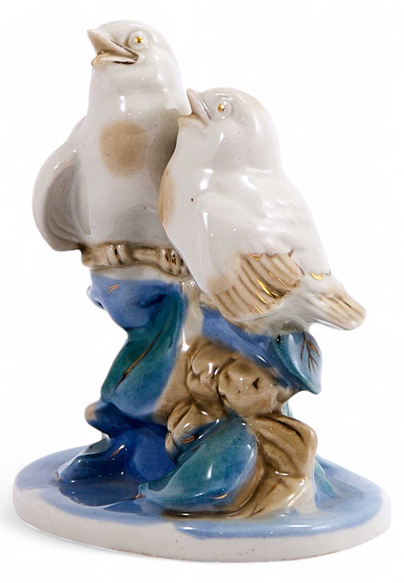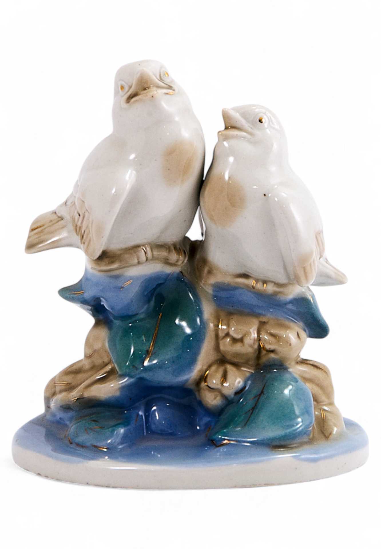 На дне скульптуры присутствует марка «ХК» в треугольнике (зеленая, печатная), ставившаяся в 1940-50-е гг. Скульптура выполнена в анималистическом жанре и представляет собой двух поющих птиц, сидящих на возвышении. Лаконичная, мягкая цветовая гамма, плавные округлые линии помогают передать трогательное настроение композиции. Скульптура проработана детально, выполнена на хорошем техническом уровне. Бессарабова Наталья Ивановна (1895-1981) - советский художник-керамист. Училась в воронежском Вхутемасе (1919-1922). В 1944-1955 работала в керамических мастерских института художественной промышленности (Москва). Способствовала возрождению гжельской керамики и скопинской керамики, создавая для них на основе изучения традиций этих промыслов образцы бытовых изделий и скульптуры из фарфора, майолики и терракоты. Выступала и как театральный художник. Клеймо подлинное. Его наличие позволяет установить, что скульптура была изготовлена в 40-50-е гг. XX века в указанной артели.