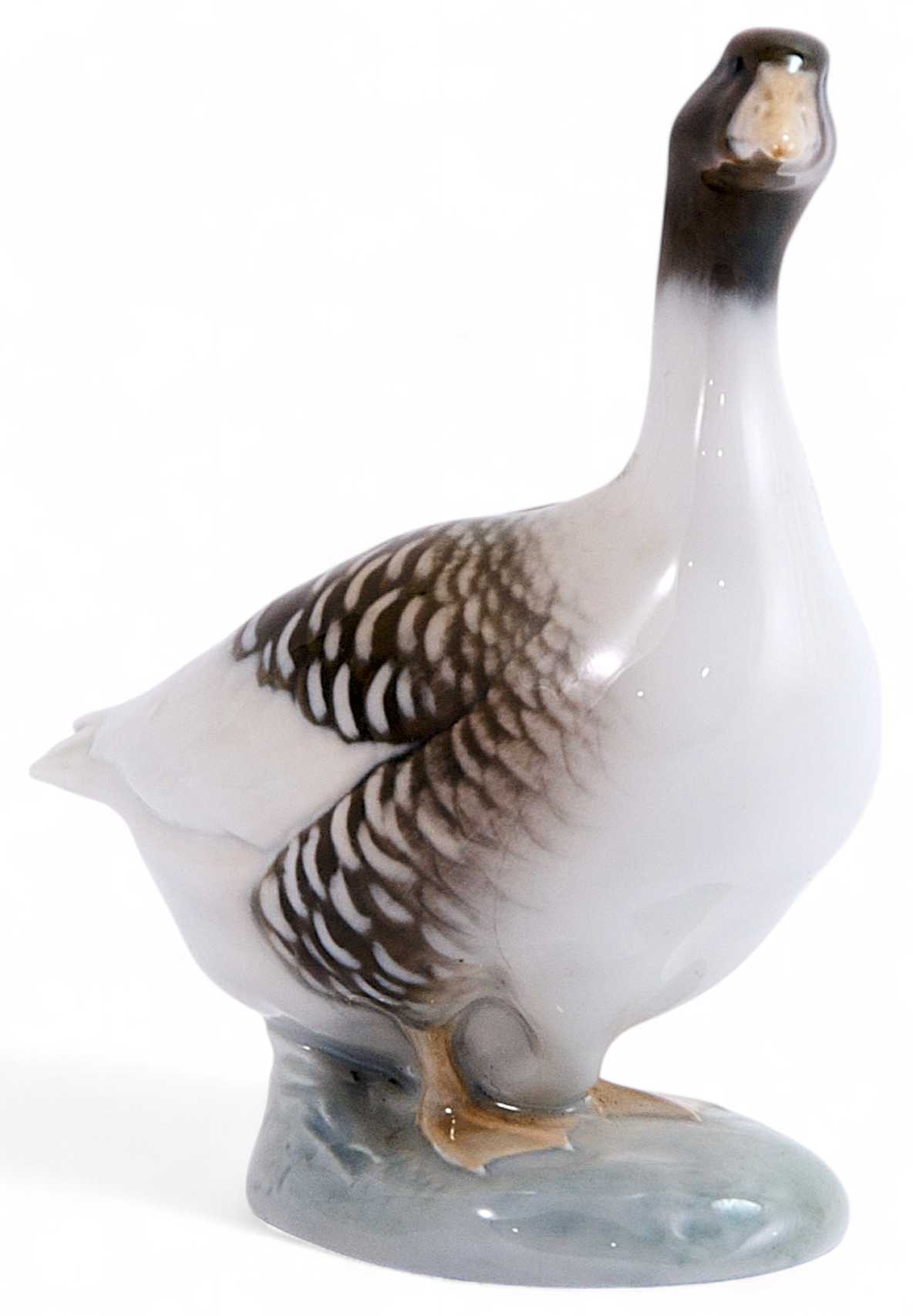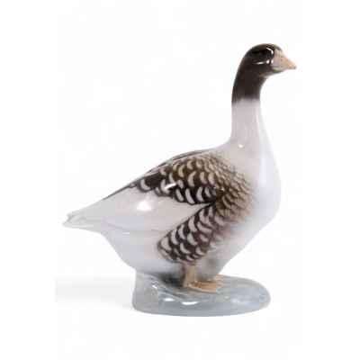 Скульптура гуся. На основании фигуры клеймо Королевской копенгагенской фарфоровой мануфактуры с указанием датировки. Royal Copenhagen Factory Основана в 1775 г. Франком Хенриком Мюллером. С конца XIX века выпускался фарфор высокого качества с а ’ * характерной подглазурной росписью в приглушённой гамме - одно из выдающихся достижений в стиле модерн. —----- Художественный руководитель Королевской фарфоровой мануфактуры Арнольд Эмиль Крог (1856-1931) разработал новый неповторимый художественный стиль, названный по месту его возникновения "копенгагенским". Этот стиль использовался и мастерами Императорского фарфорового завода. Для фарфоровых изделий с подглазурной росписью