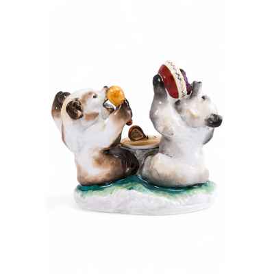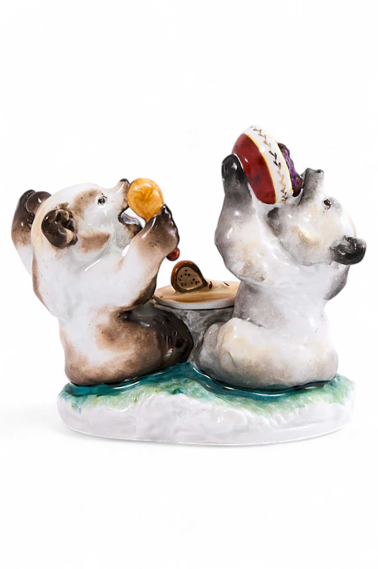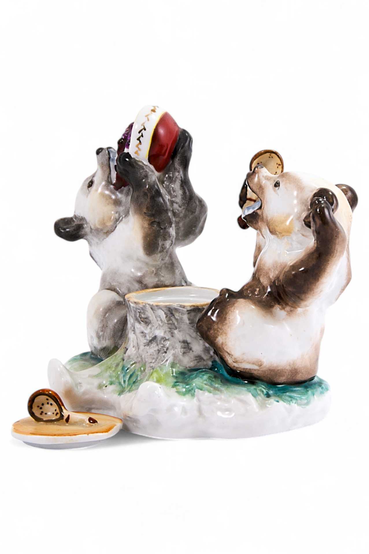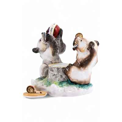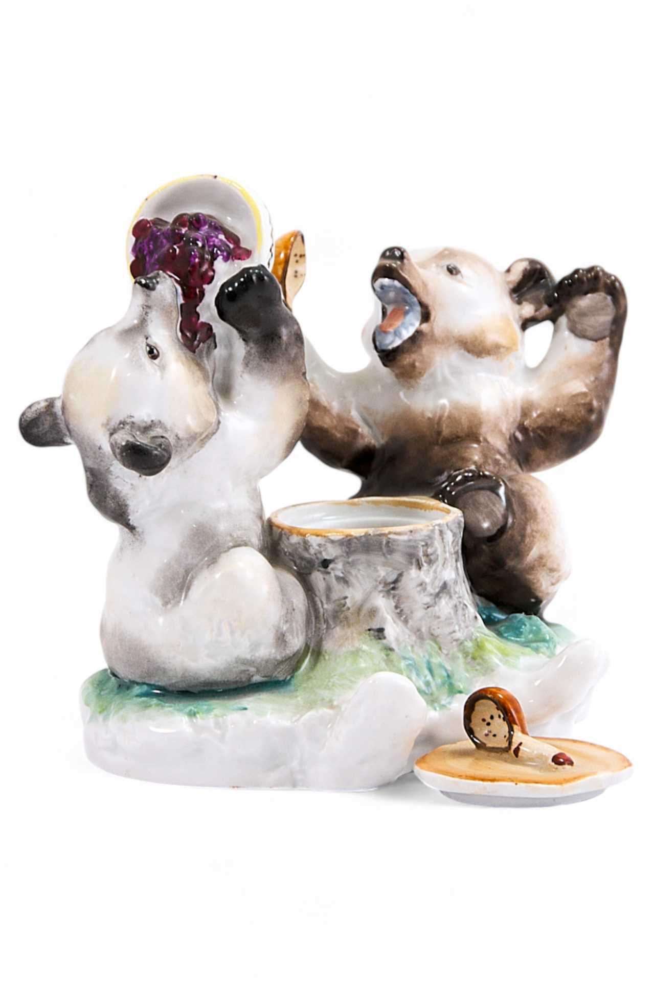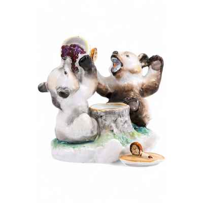На дне предмета есть клеймо ЛФЗ, которое ставили на заводе с 1936 г. (по настоящее время). Изделие опубликовано в каталоге «Художественный фарфор. ЛФЗ», Внешторгиздат, 1960 - е гг. Чернильница стилизована под двух веселых медвежат с ягодами; выполнена по модели известного графика и художника-анималиста, любителя русских сказок Е. И. Чарушина, отличается яркостью сказочных персонажей, вниманием к передаче образов, проработке деталей и росписи. Клеймо подлинное. Его наличие, а также стилистические особенности предмета и состояние материалов позволяют установить, что чернильница была изготовлена в 1950-60-е гг. на Ленинградском фарфоровом заводе.