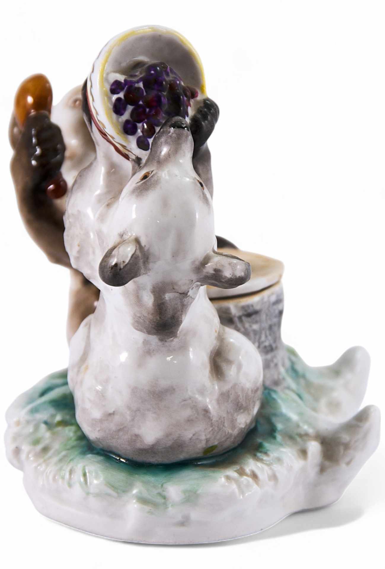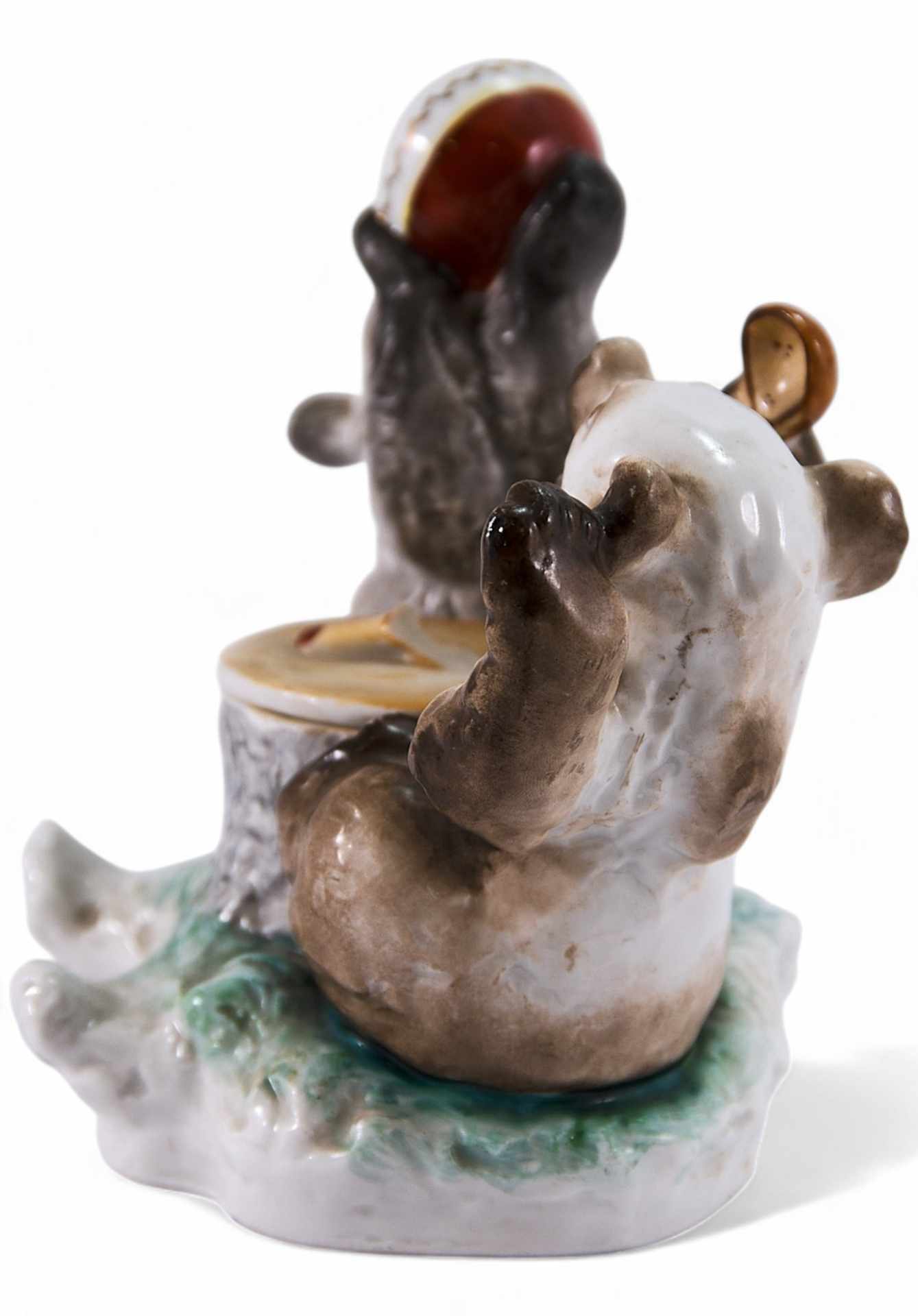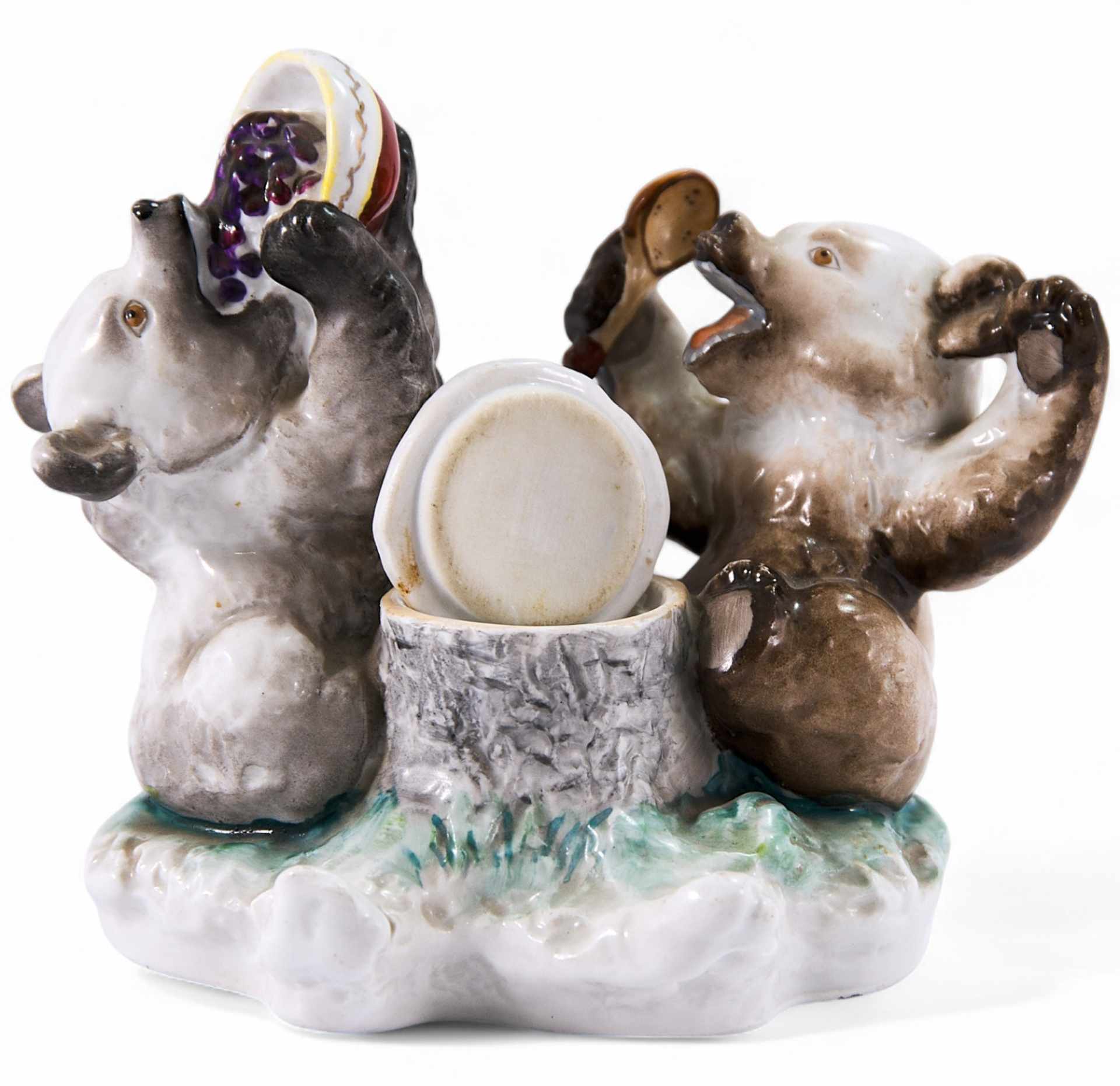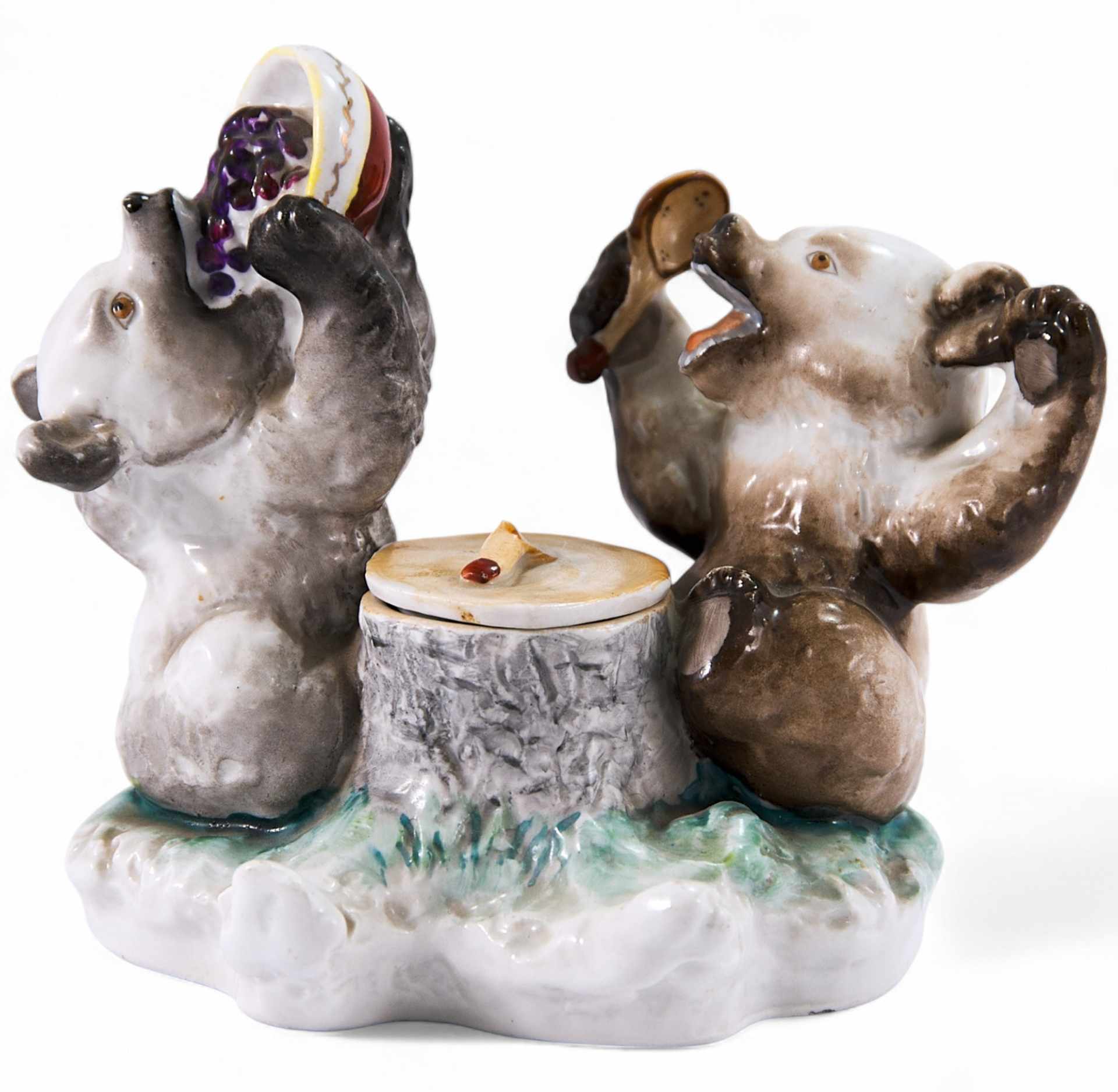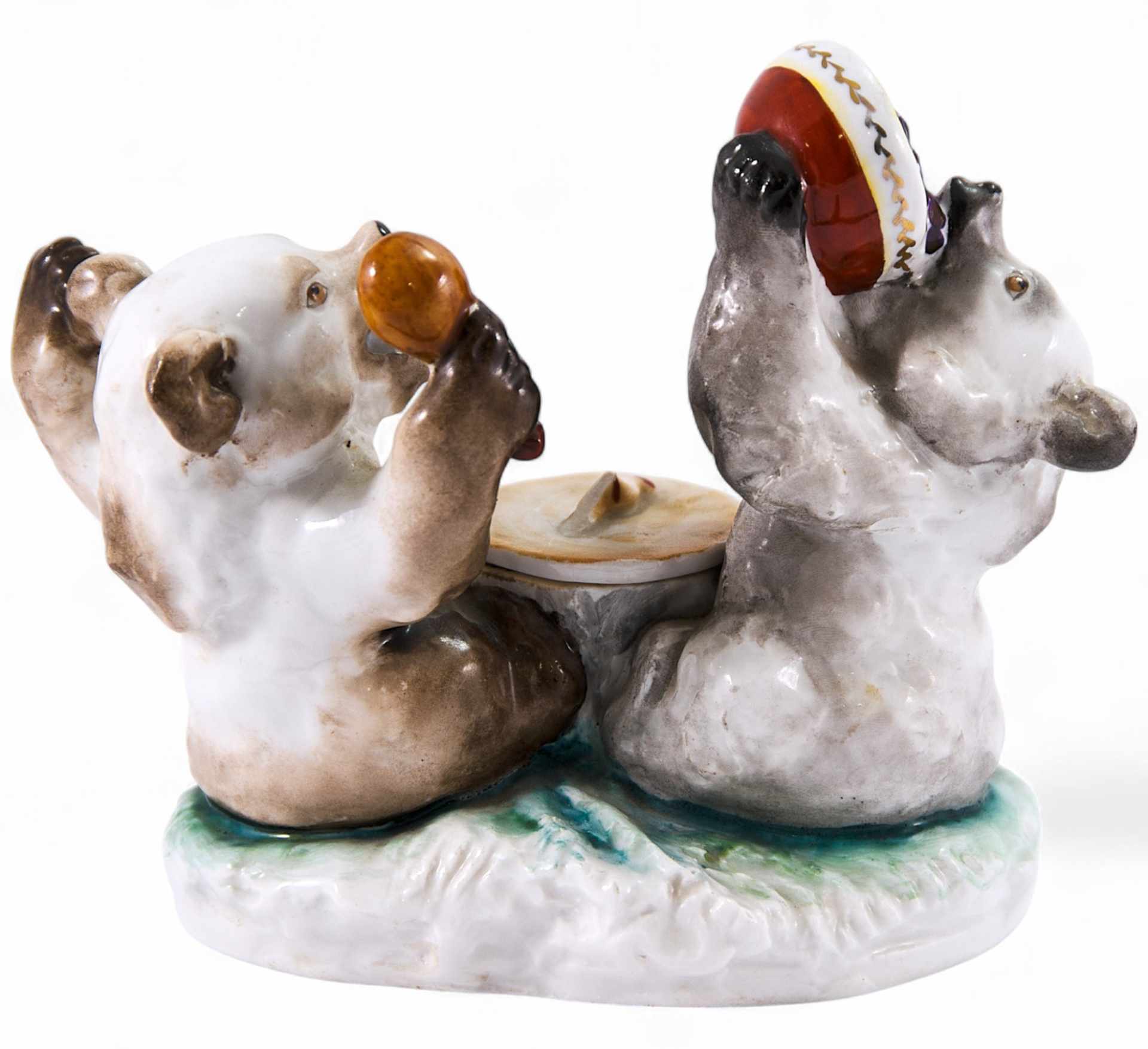 Чернильница стилизована под двух веселых медвежат с ягодами; выполнена по модели известного графика и художника-анималиста, любителя русских сказок Е. И. Чарушина, отличается яркостью сказочных персонажей, вниманием к передаче образов, проработке деталей и росписи. Скол ложки на крышке чернильницы.