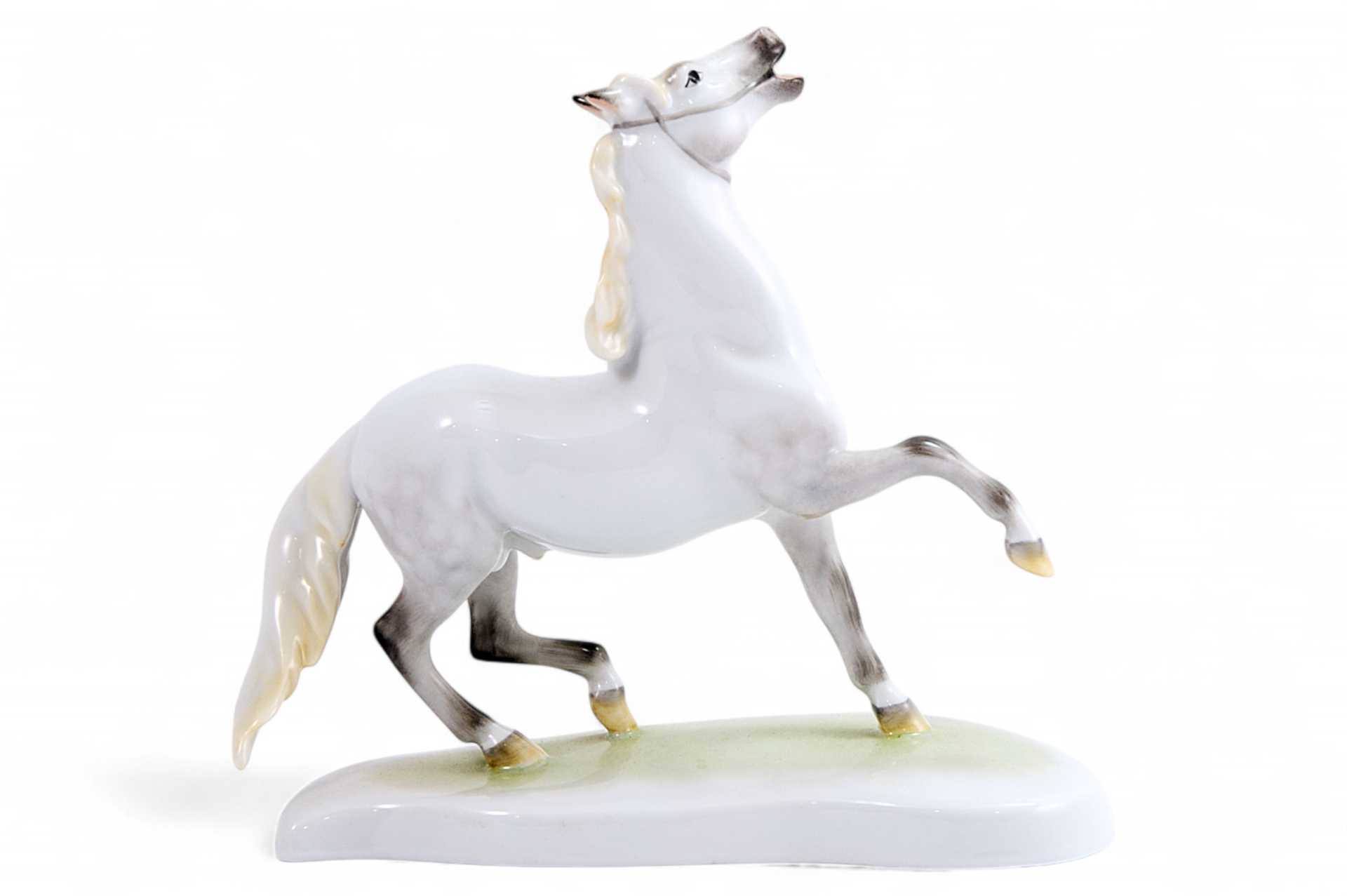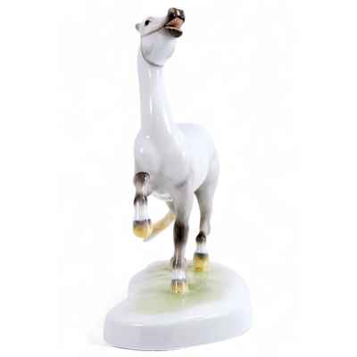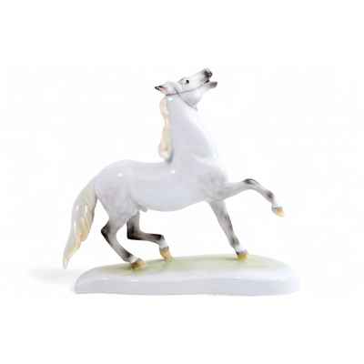 На невысокой овальной подставке фигура белого коня. Он изображён в движении: задние ноги подогнуты, правая передняя поднята и согнута, шея вытянута, голова слегка запрокинута назад. На основании синее надглазурное клеймо фарфоровой фабрики Херенд (Herend) которое ставилось в период с середины 1960-х гг. по начало 1970-х гг. В “тесте” клеймо “Herend” и номер “5277”. Фарфоровая фабрика Херенд (Венгрия) В 1826 году, в небольшой деревушке Херенд (Herend), расположенной на склоне горы, открылась мастерская, выпускавшая керамические изделия. В 1839 году владельцем мастерской стал Мор Фишер (Мог Fischer), и это стало началом нового периода в развитии будущей фабрики. Фишер взял огромные ссуды на