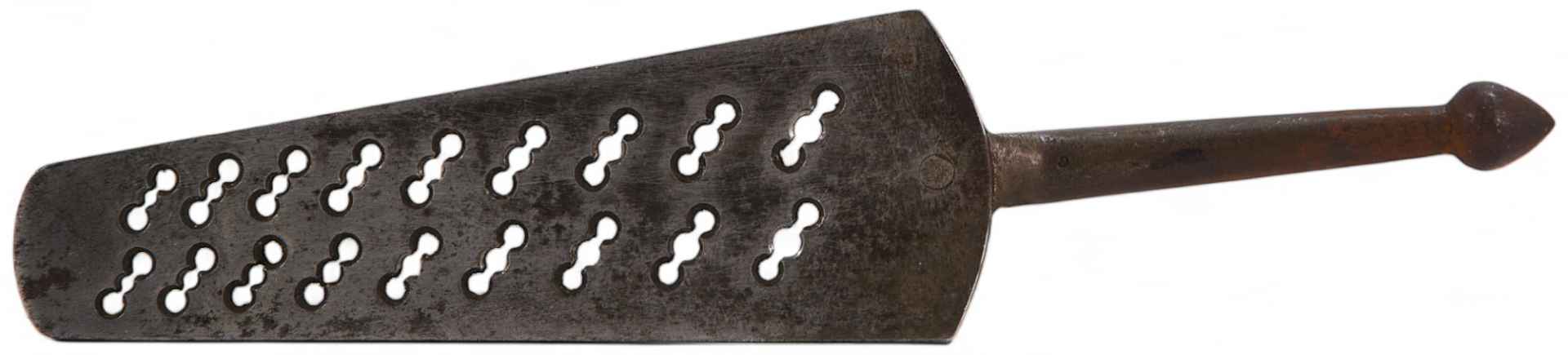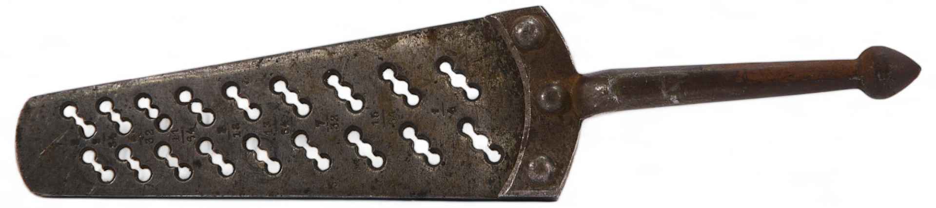 Винтовальная доска. На доске имеются отверстии определенного диаметра с числовыми обозначениями: 1/8, 9/64, 5/32,11/64, 3/16, 13/64, 7/32, 15/64 и 1/4. Винтовальная доска - слесарный инструмент, служащий для нарезания вручную мелких винтов, диаметром от 17а мм до 10—12 мм. Является не чем иным, как набором цельных винторезных плашек различи, размеров, нарезающих резьбу за один проход. Представляет собой стальную планку, в которой высверлено определенное число (от 9 до 20) отверстий, снабженных двумя боковыми вырезами для получения режущей грани и нарезанных метчиком; первые витки резьбы винтовальной доски несколько стачиваются на конус, для того чтобы при нарезке винтов резьба нарезалась постепенно; после этого доска закаливается. Точной нарезки винтовальная доска дать не может, но она удобна для ремонтных работ, т.к. очень компактна и дает возможность нарезать винты от 9 до 20 различных диаметров. На рукоятке изделия имеется клеймо: Т в двойном круге, заключенном в треугольник — клеймо ТОЗ (Тульский оружейный завод), с 1928 по 1990 гг.