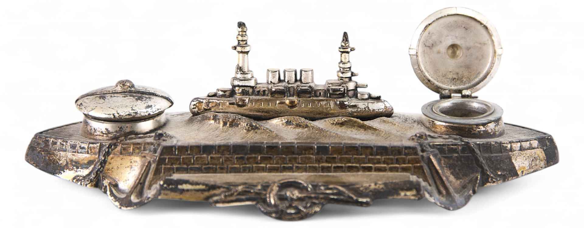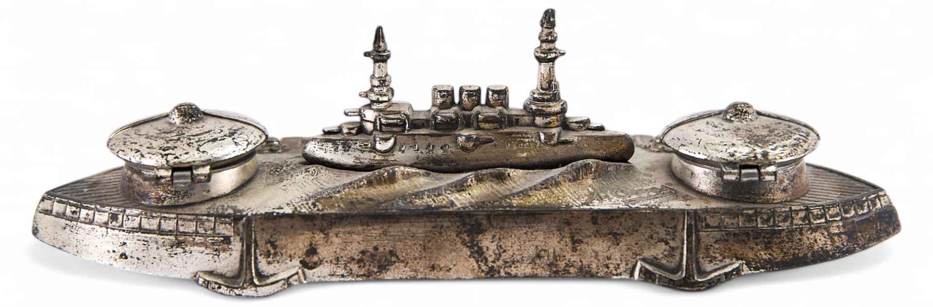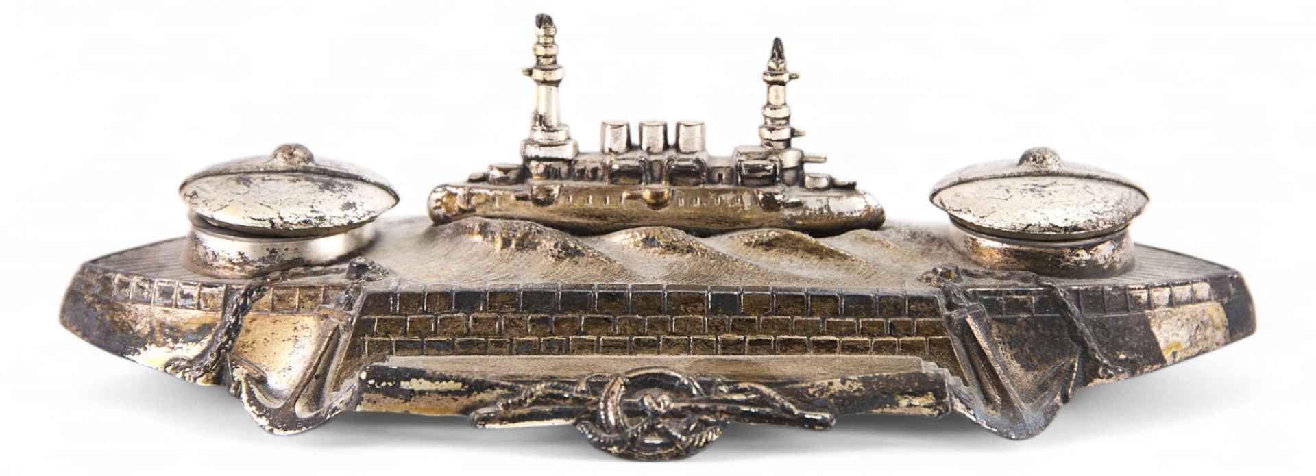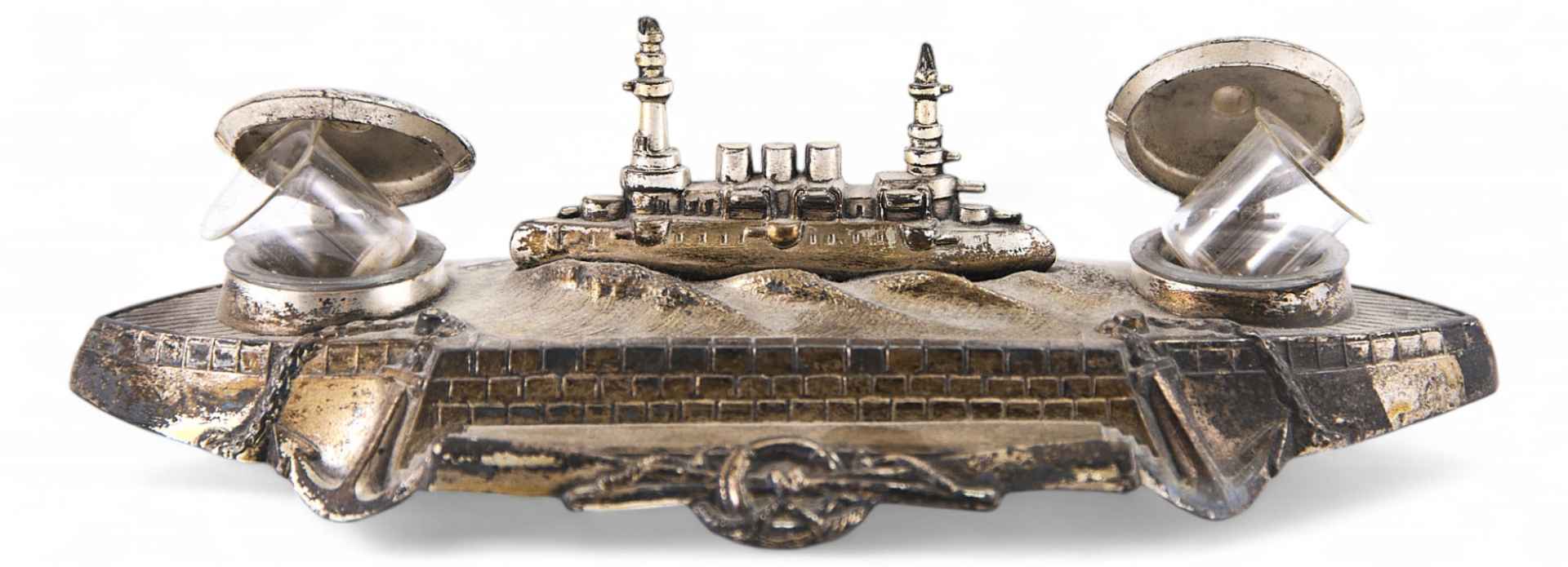 Письменный прибор в виде композиции на военно-морскую тему. Центром композиции является фигура броненосца, башни которого одновременно выполняют функцию подставки под перо. По бокам композиции две симметрично расположенные французские морские бескозырки - крышки чернильниц.