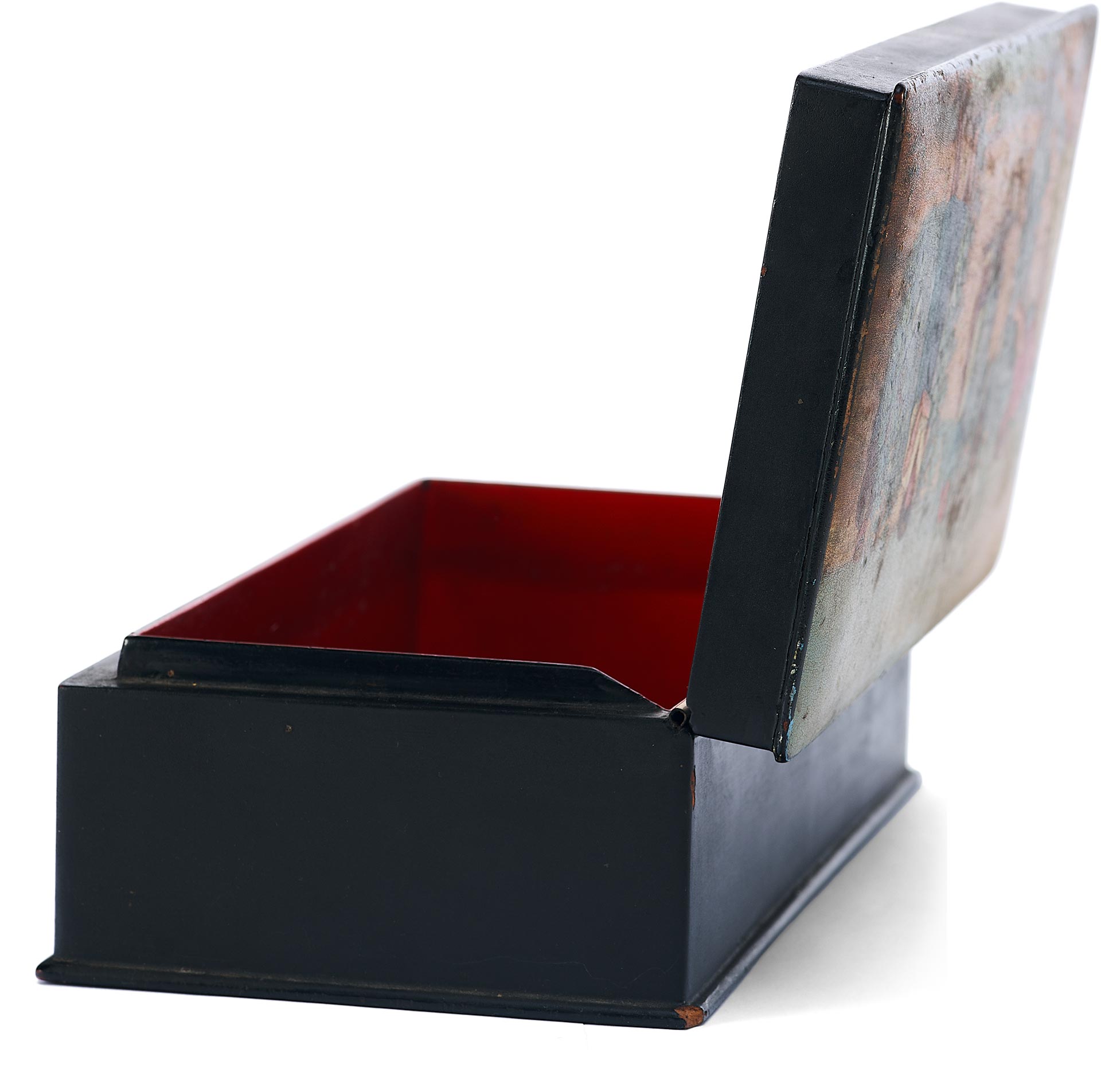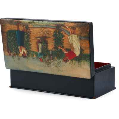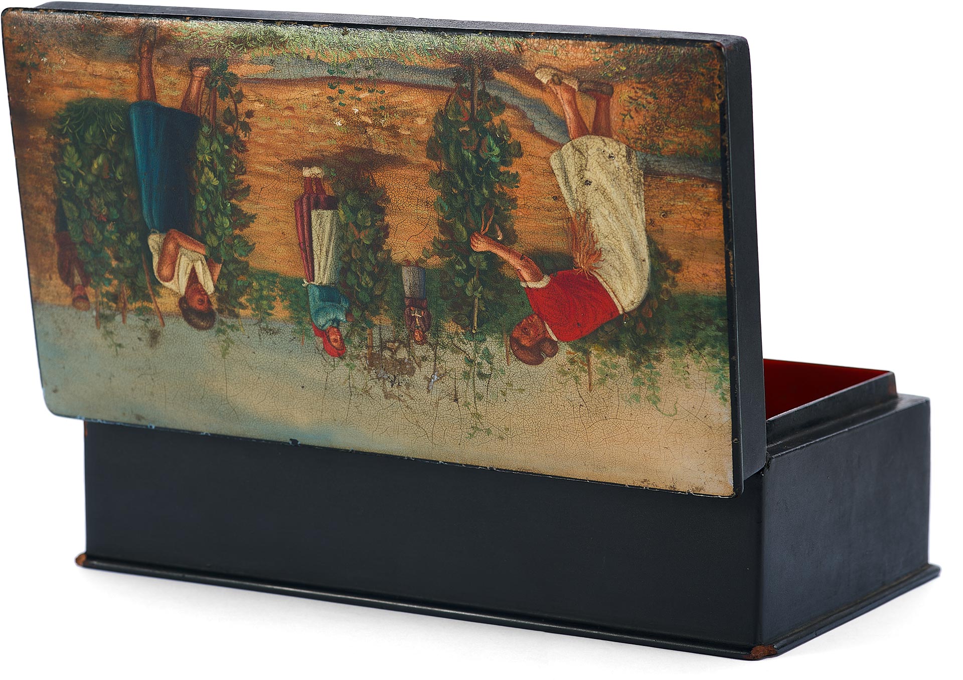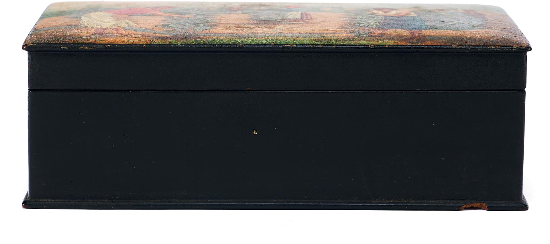 Шкатулка выполнена из папье-маше, а изображение нанесено масляными красками с последующим покрытием многослойным прозрачным лаком и тщательной полировкой. Подобная техника позволяла достичь насыщенности цвета, глубины композиции и особого блеска поверхности. Размер изделия — 7,3 × 22,1 × 12,0 см — делает его удобным для хранения мелких предметов, но в первую очередь оно ценно как объект искусства.