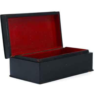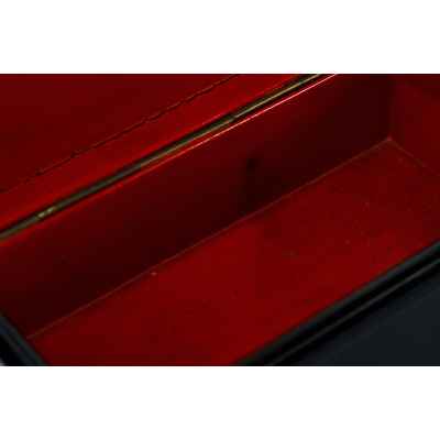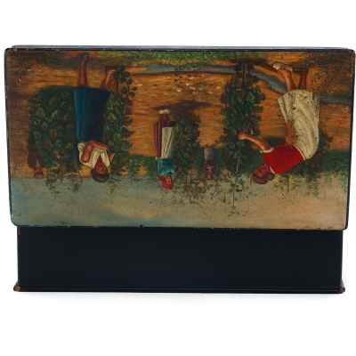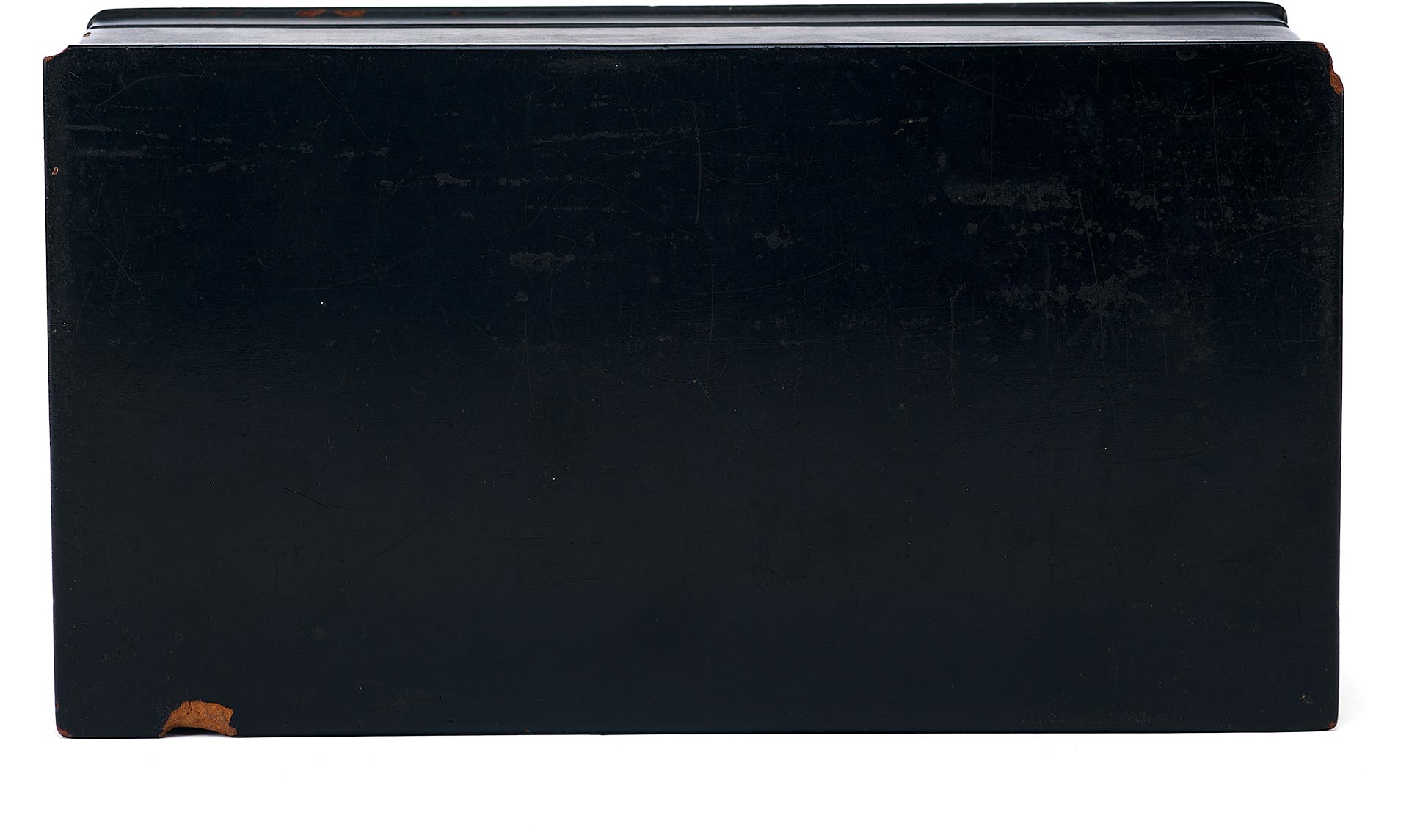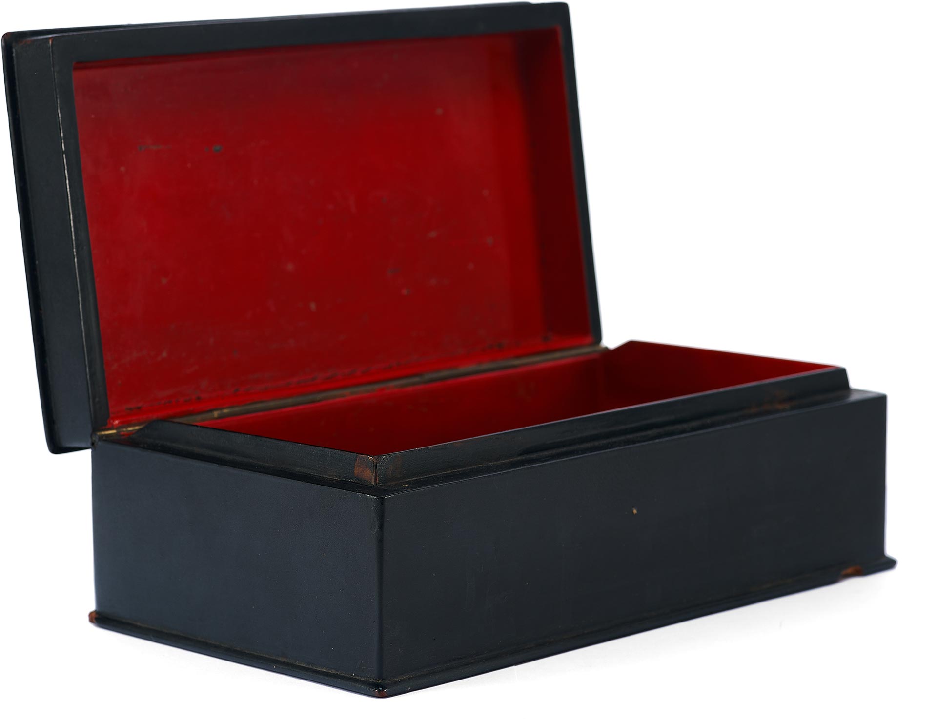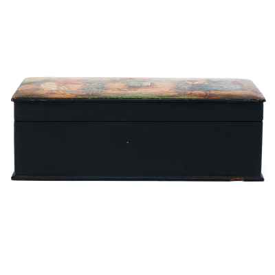 Шкатулка выполнена из папье-маше, а изображение нанесено масляными красками с последующим покрытием многослойным прозрачным лаком и тщательной полировкой. Подобная техника позволяла достичь насыщенности цвета, глубины композиции и особого блеска поверхности. Размер изделия — 7,3 × 22,1 × 12,0 см — делает его удобным для хранения мелких предметов, но в первую очередь оно ценно как объект искусства.