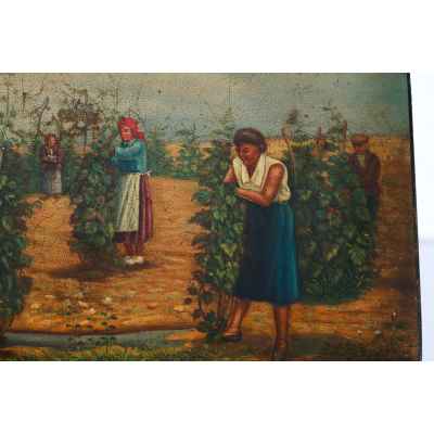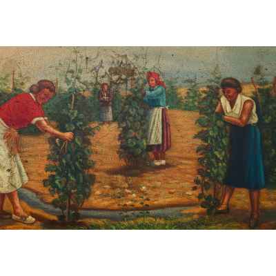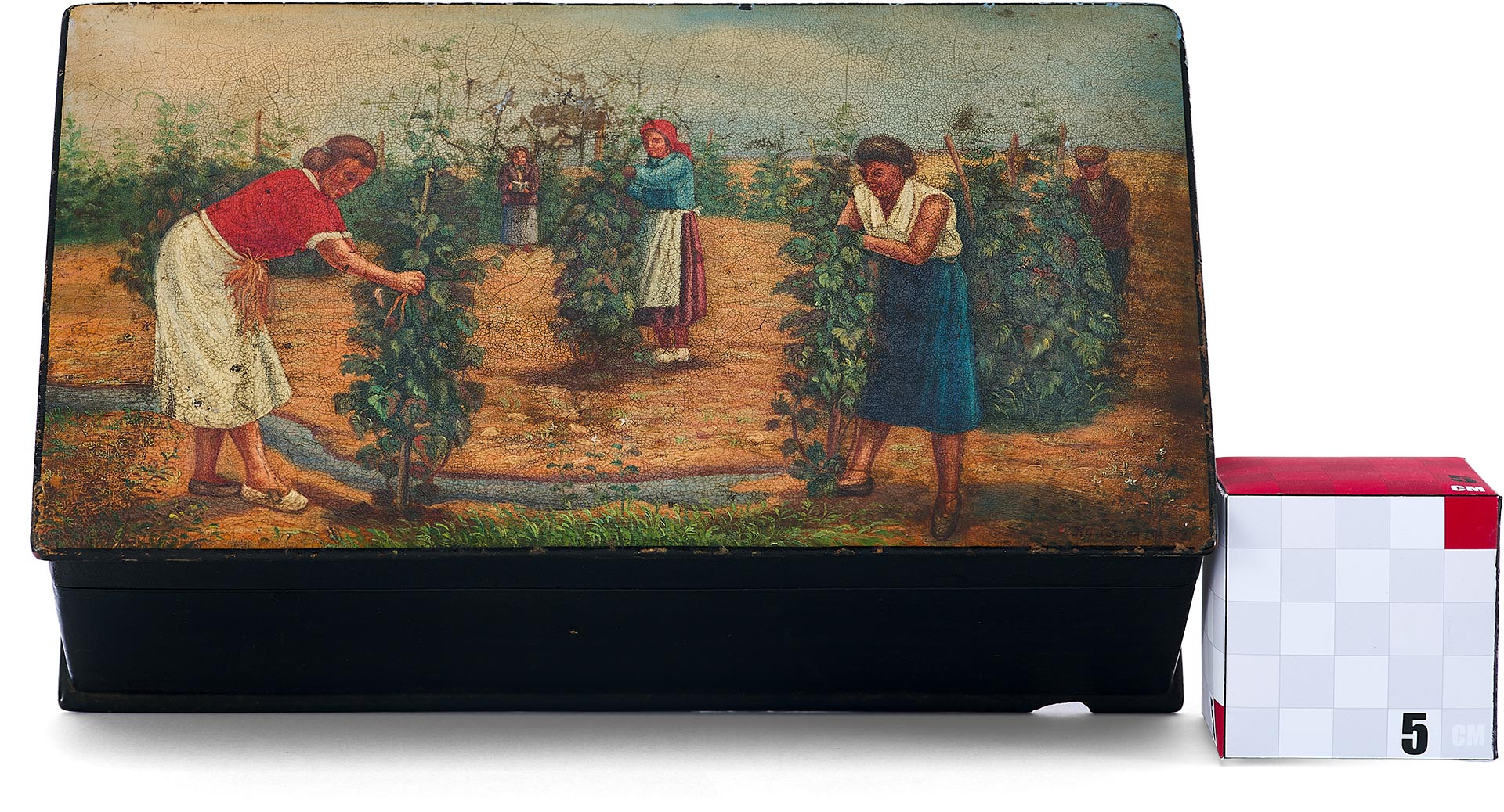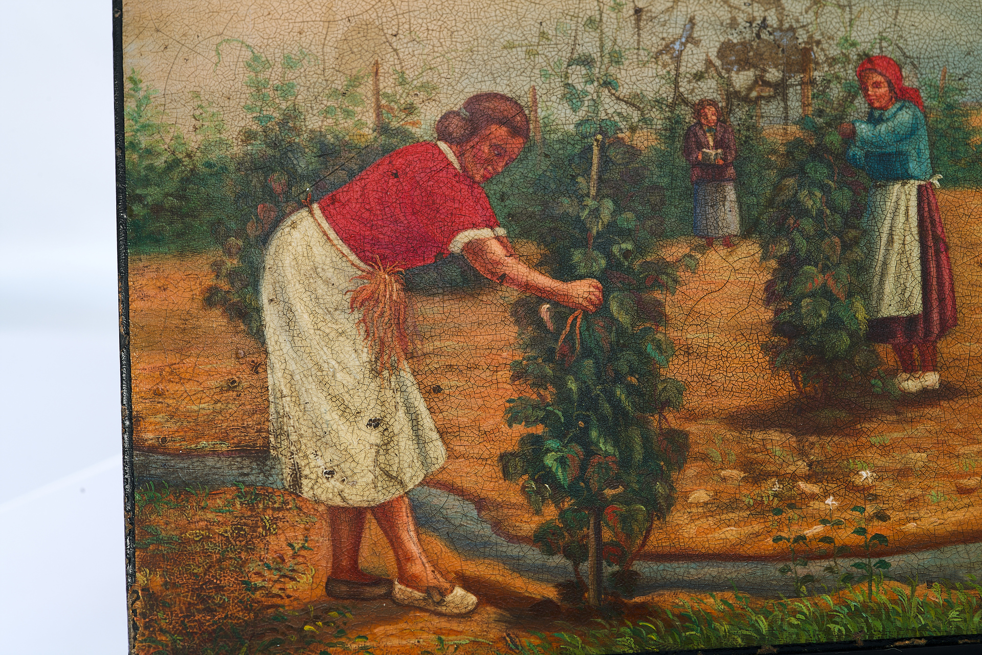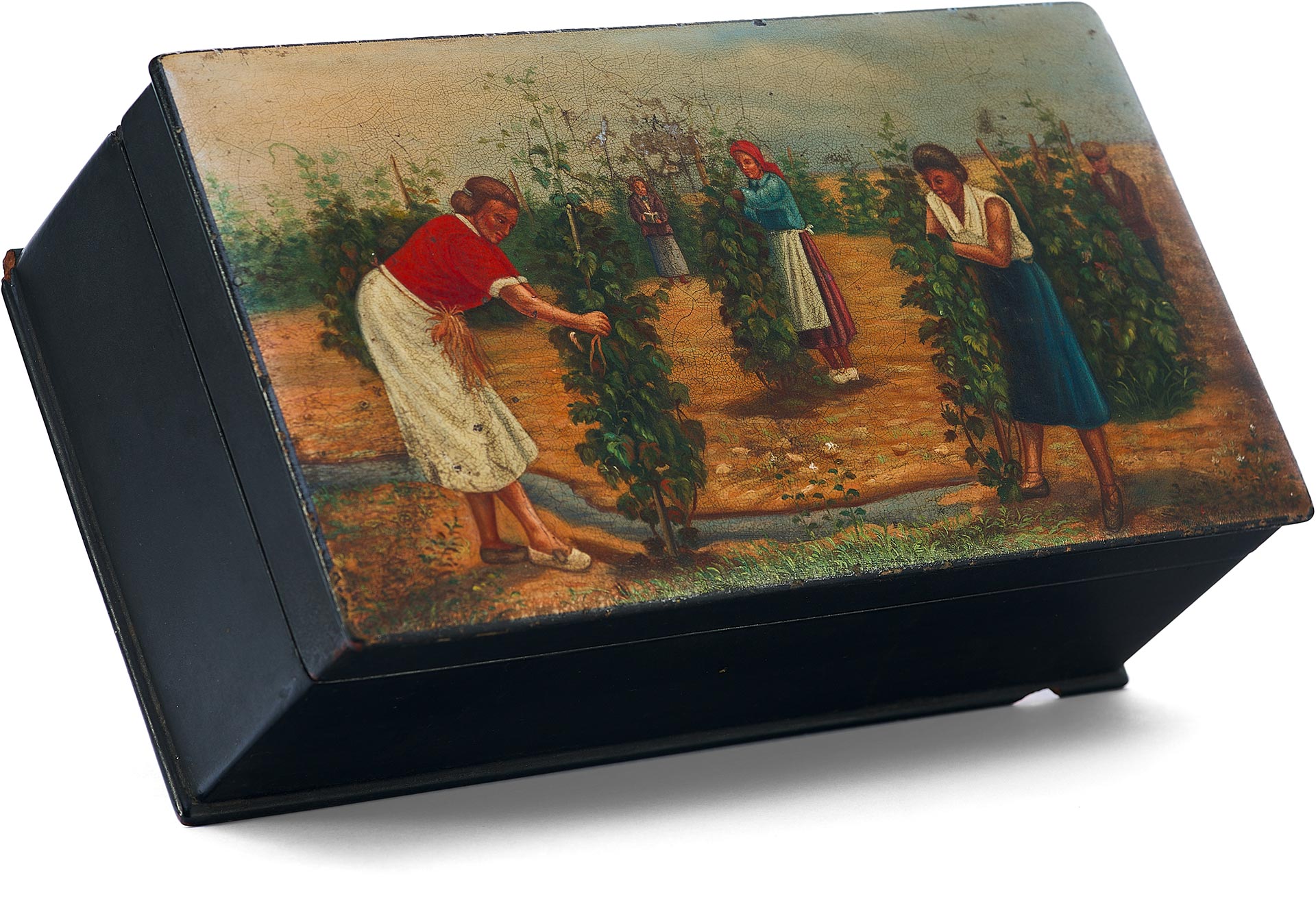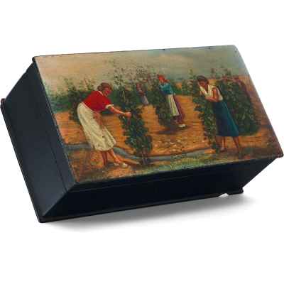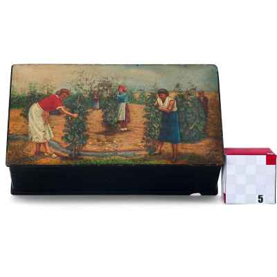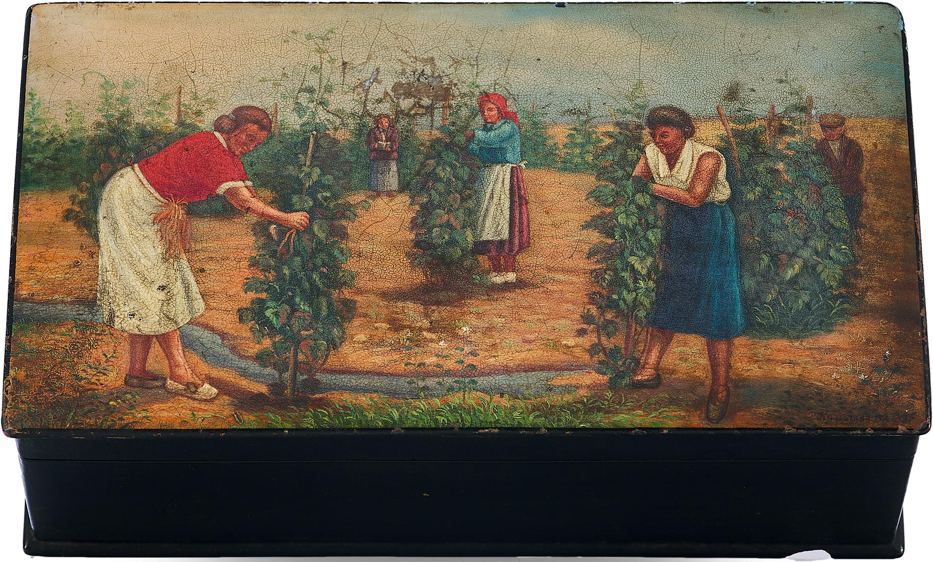 Перед нами — лакированная шкатулка «Молодые побеги», созданная в 1938 году в Федоскине, одном из старейших центров русской миниатюрной живописи на папье-маше. Крышка оформлена в виде живописной миниатюры, изображающей колхозниц, подвязывающих молодые побеги растений. Композиция выполнена в традициях социалистического реализма, художественного направления, доминировавшего в официальном советском искусстве 1930-х годов. Подобные сцены восхваляли труд, коллективизм и участие женщин в созидательной деятельности.