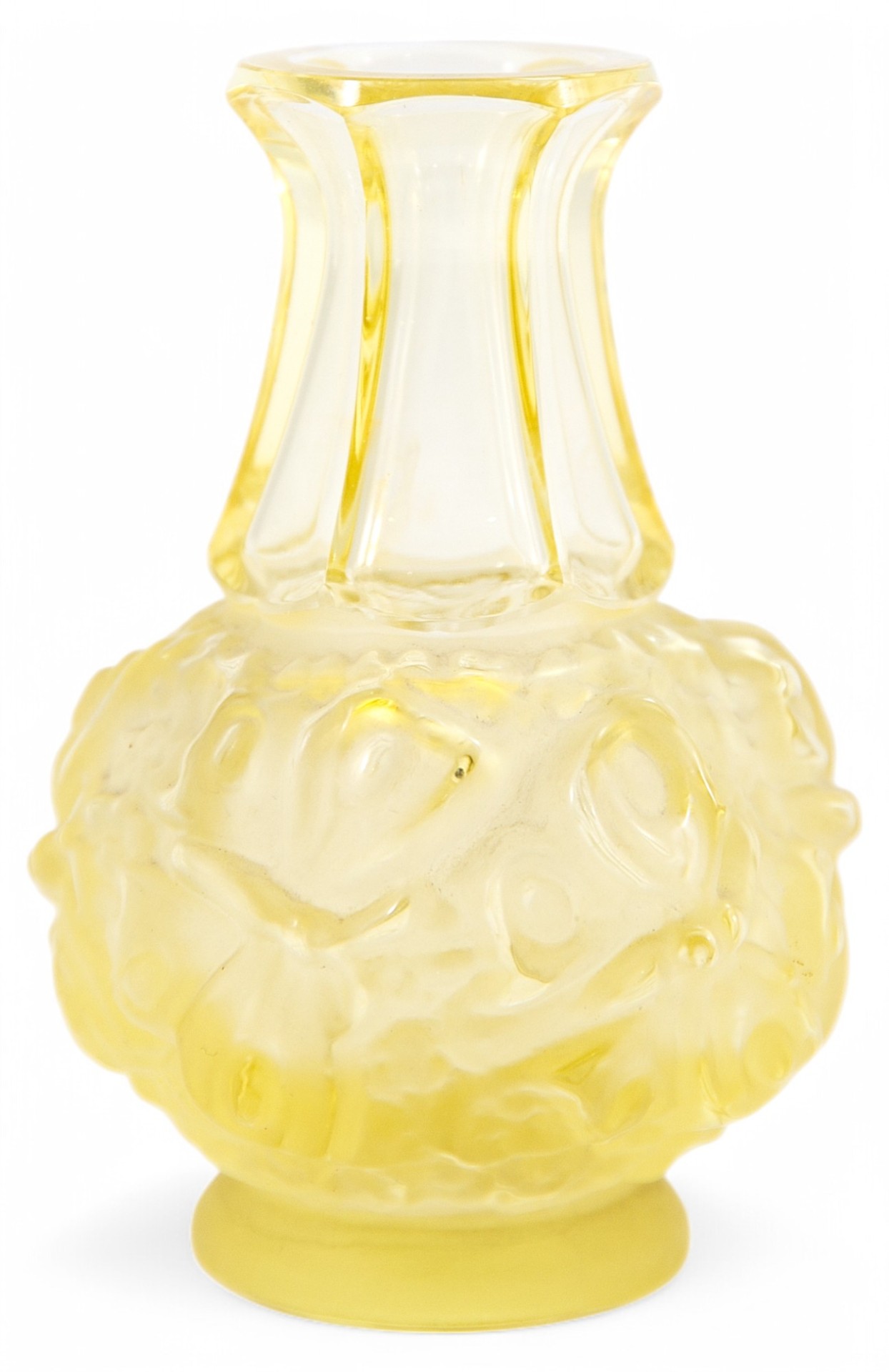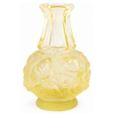 Декоративная вазочка небольшого размера выполнена из желтого стекла с использованием «ледяного» эффекта, достигнутого методом травления. Форма грушевидная, с расширением книзу и вытянутым узким горлышком. Поверхность тулова украшена рельефным растительным декором в стиле «модерн» (стиль в искусстве конца XIX в. — нач. XX в., отличается динамикой и текучестью форм, отказом от прямых линий и углов в пользу более естественных, натуральных линий). Высококачественное богемское стекло с очень малым процентом содержания оксидов свинца было и остается чистым, прозрачным и сияющим. Наряду с французским и американским стеклом в стиле модерн конца XIX века - начала XX века, чешское стекло в том же стиле принадлежит к самому лучшему, что было создано в мире. Стеклозавод ’’Й.Лётц” из Клаштерского Млина, удостоенный многих призов на всемирных выставках (например, в Париже в 1900 г.), занимает ведущее место в производстве стекла в стиле модерн. Ключевое значение для достижения успеха чешским стеклом в стиле модерн конца XIX - начала XX века имело сотрудничество стеклозаводов с лучшими художниками. Небывалый расцвет художественное творчество в стиле модерн принесло стеклозаводу ’’Мозер” в Карловых Варах.
