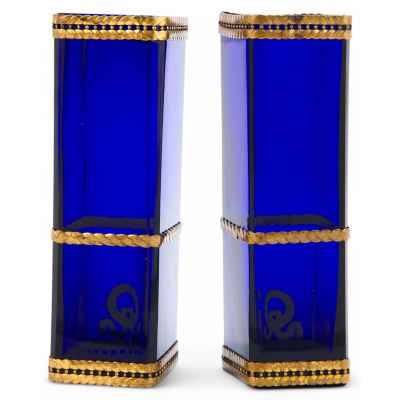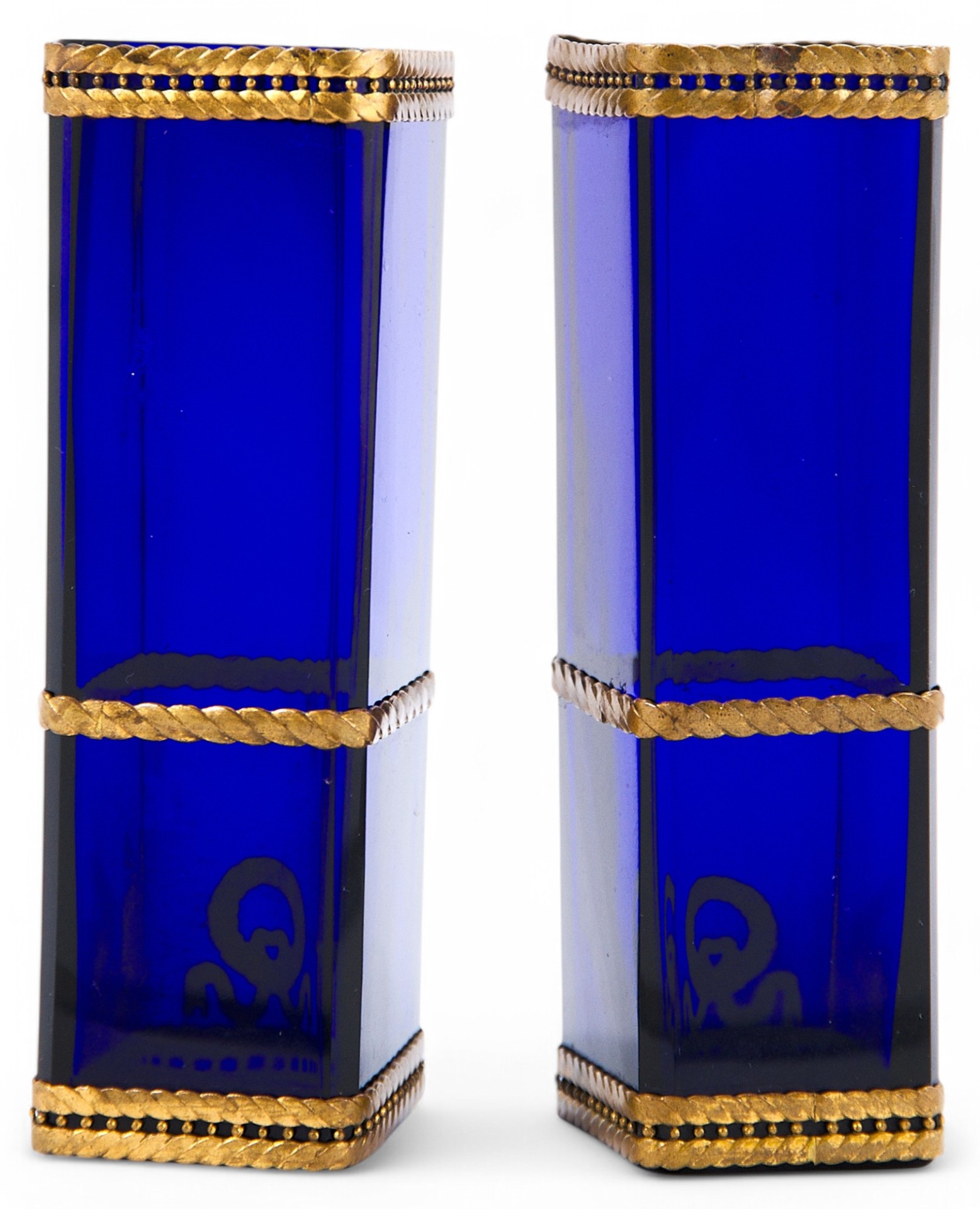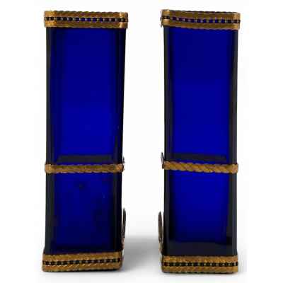 Парные вазы в стиле неоклассицизма – это антикварные предметы, выполненные в традициях неоклассицизма, который был популярен в Европе во второй половине XIX века. Вазы были изготовлены в Богемии из цветного стекла с добавлением латуни. Эти вазы имеют прямоугольную форму с плоским дном, украшены латунными накладками с рельефным узором, имитирующим скрученные ленточки, и венками из лавровых листьев у основания. Размер ваз составляет 13,0x4,2x4,2 см.