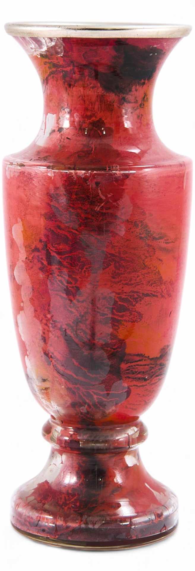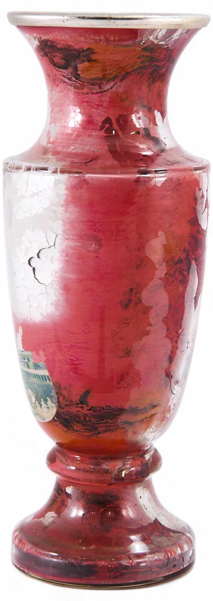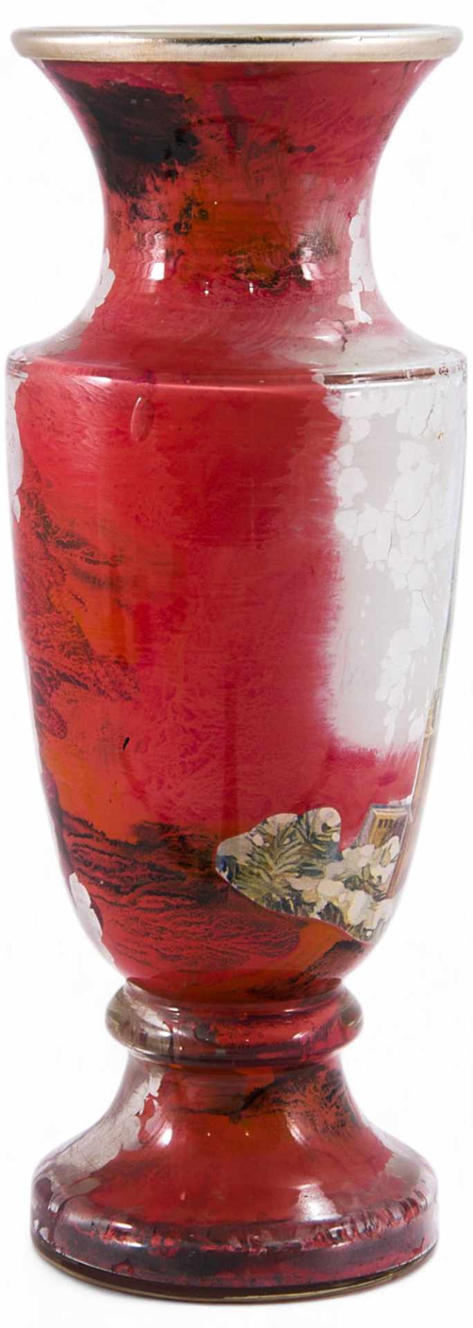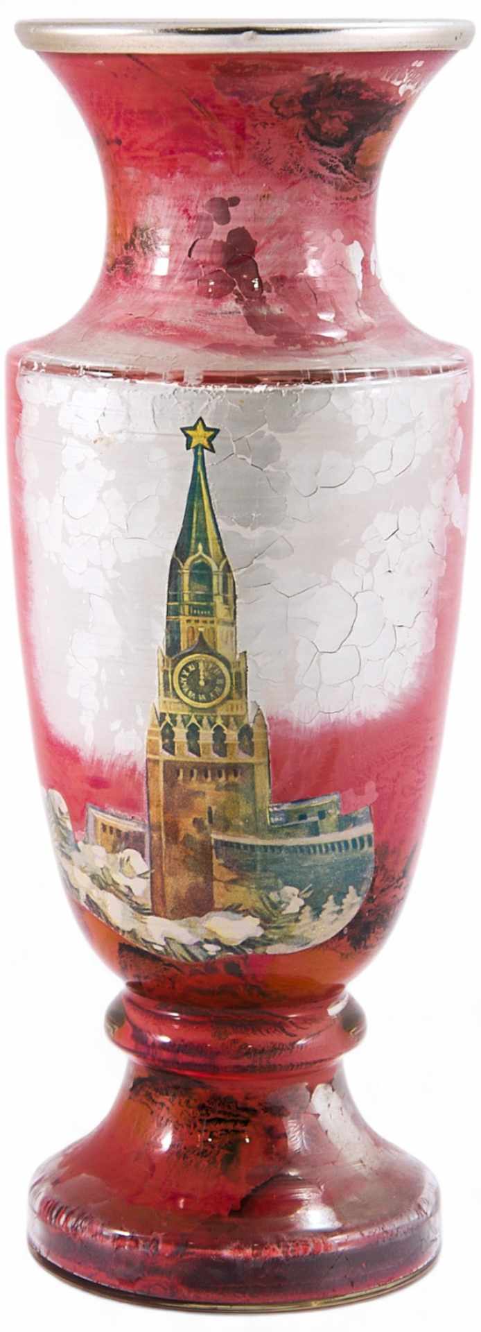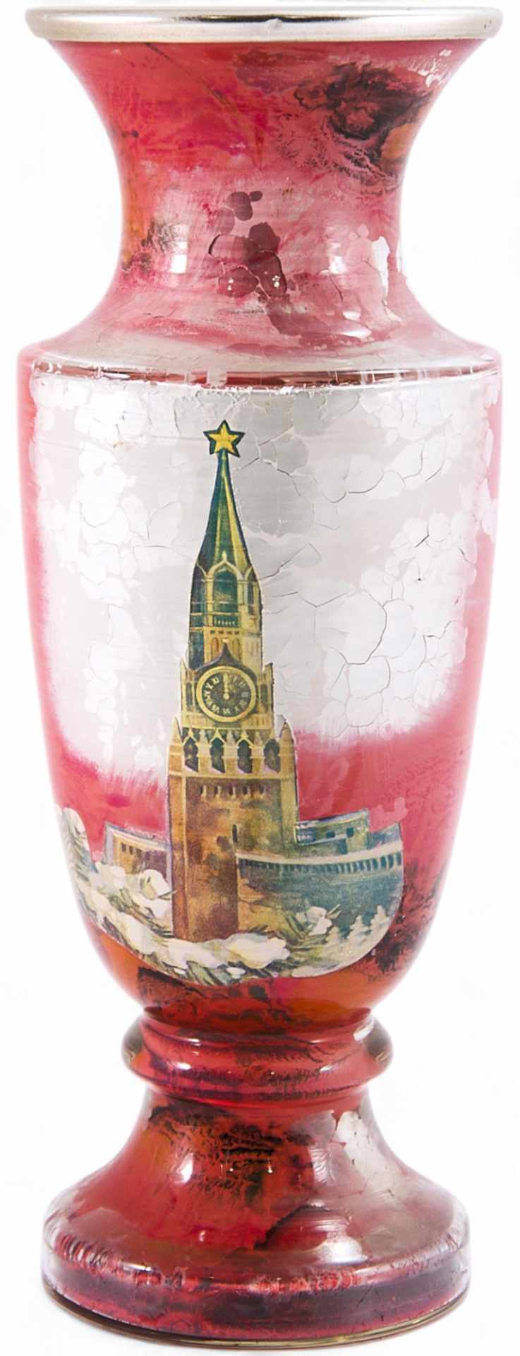 Представленная ваза классической формы амфоры декорирована изнутри. Насыщенный пурпурный фон украшен классическим советским пейзажем с изображением Спасской башни зимнего Кремля. Рисунок нанесен методом деколи. Расширяющееся горлышко вазы отделано металлом. Предмет выполнен на хорошем техническом уровне, имеются утраты в красочном слое.