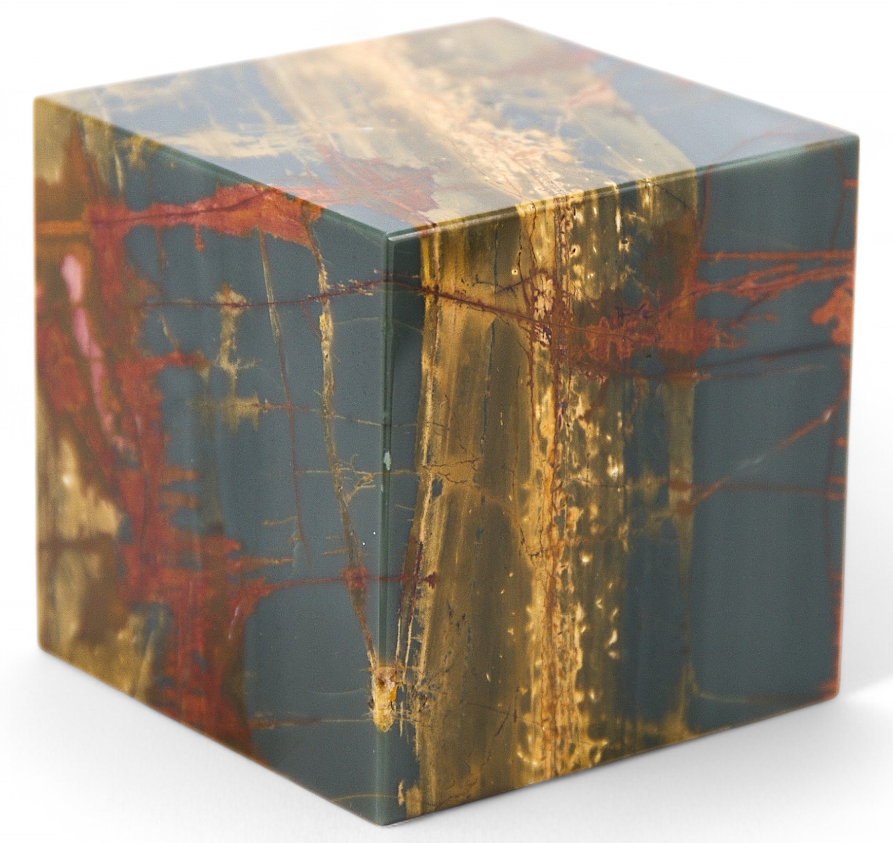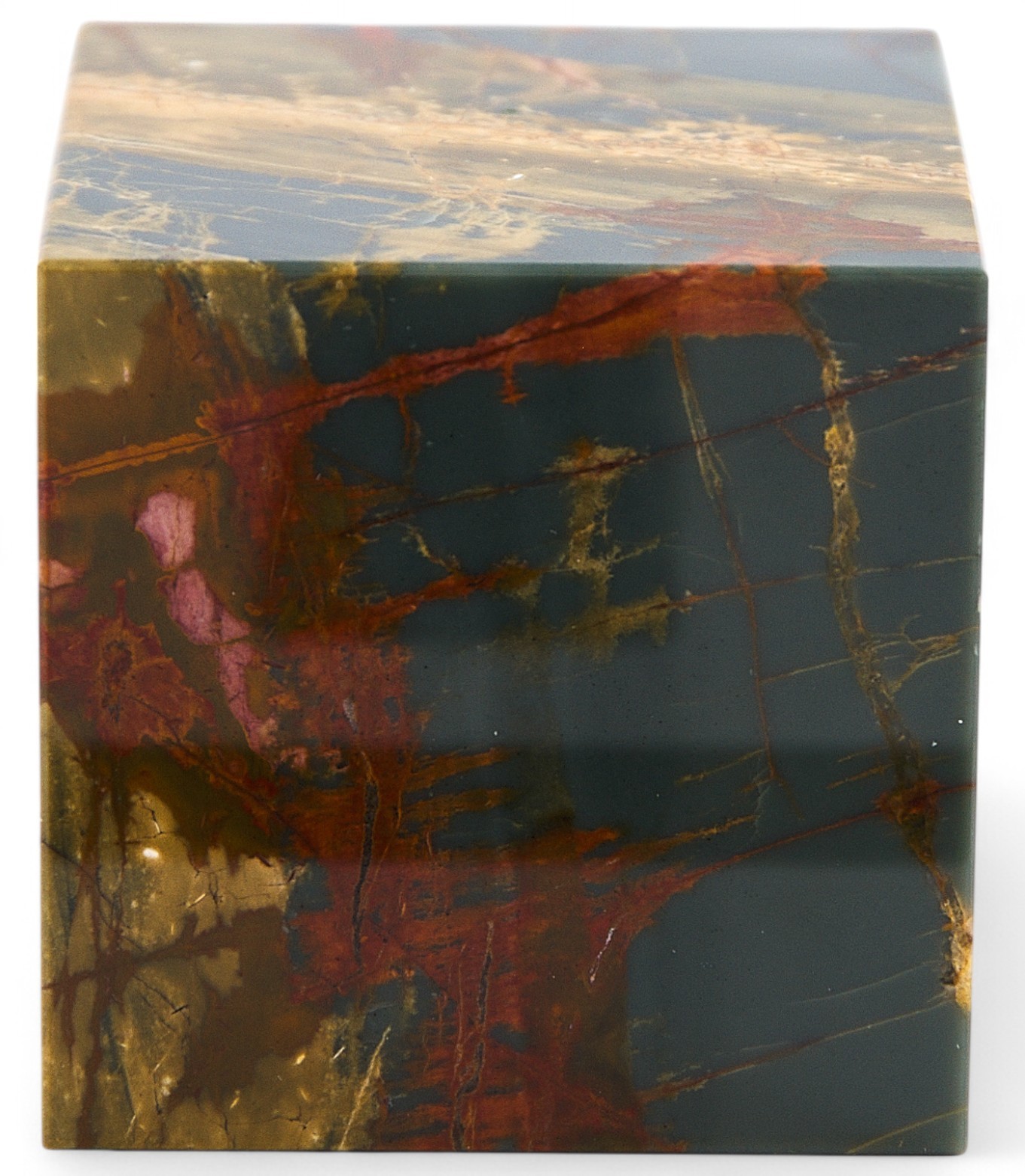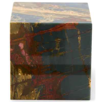 Пресс изготовлен из яшмы Пикассо в форме куба.Яшма Пикассо получила свое название за необычную расцветку, напоминающую рисунки позднего Пикассо в стиле абстракционизма. Такие, хаотично расположенные линии, невероятное сочетание цветов, рассеянных форм и цветовых пятен, имеющих неопределенные очертания, сделали популярным поделочным камнем еще в эпоху Возрождения, новое свое название камень получил значительно позже. Этот камень встречается в месторождениях на Южном Урале, США, Южной Африке, Индии и Китае.