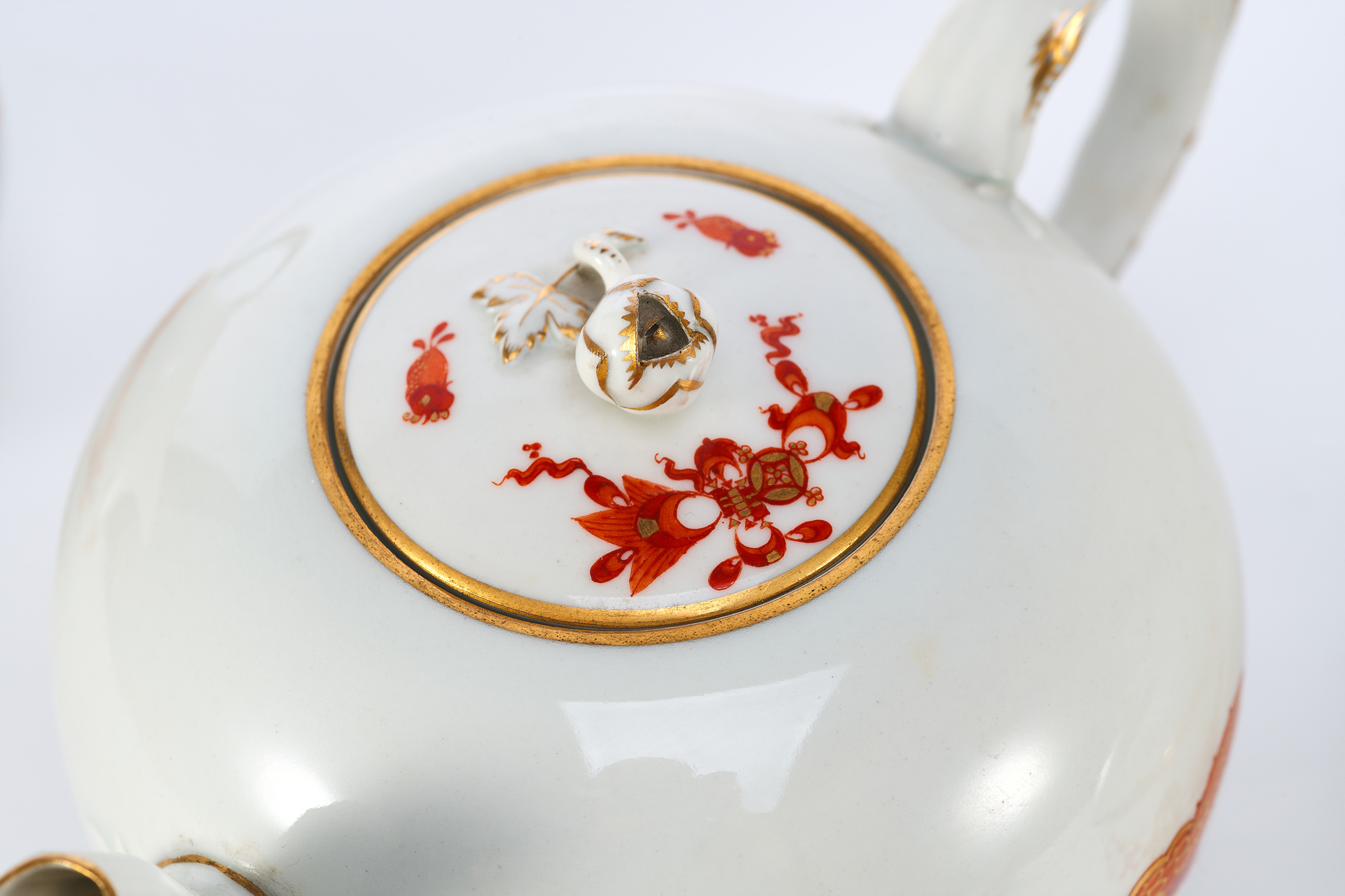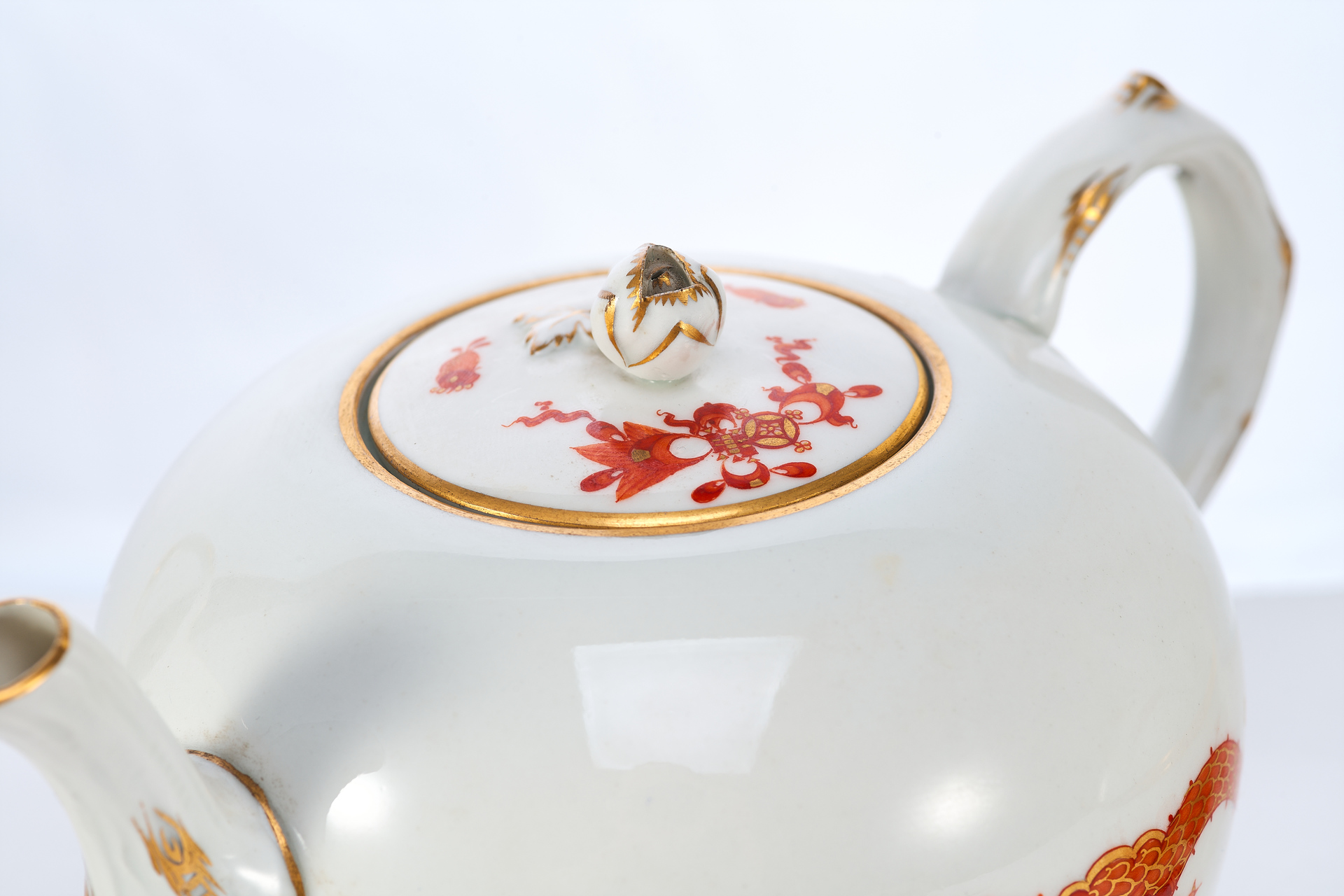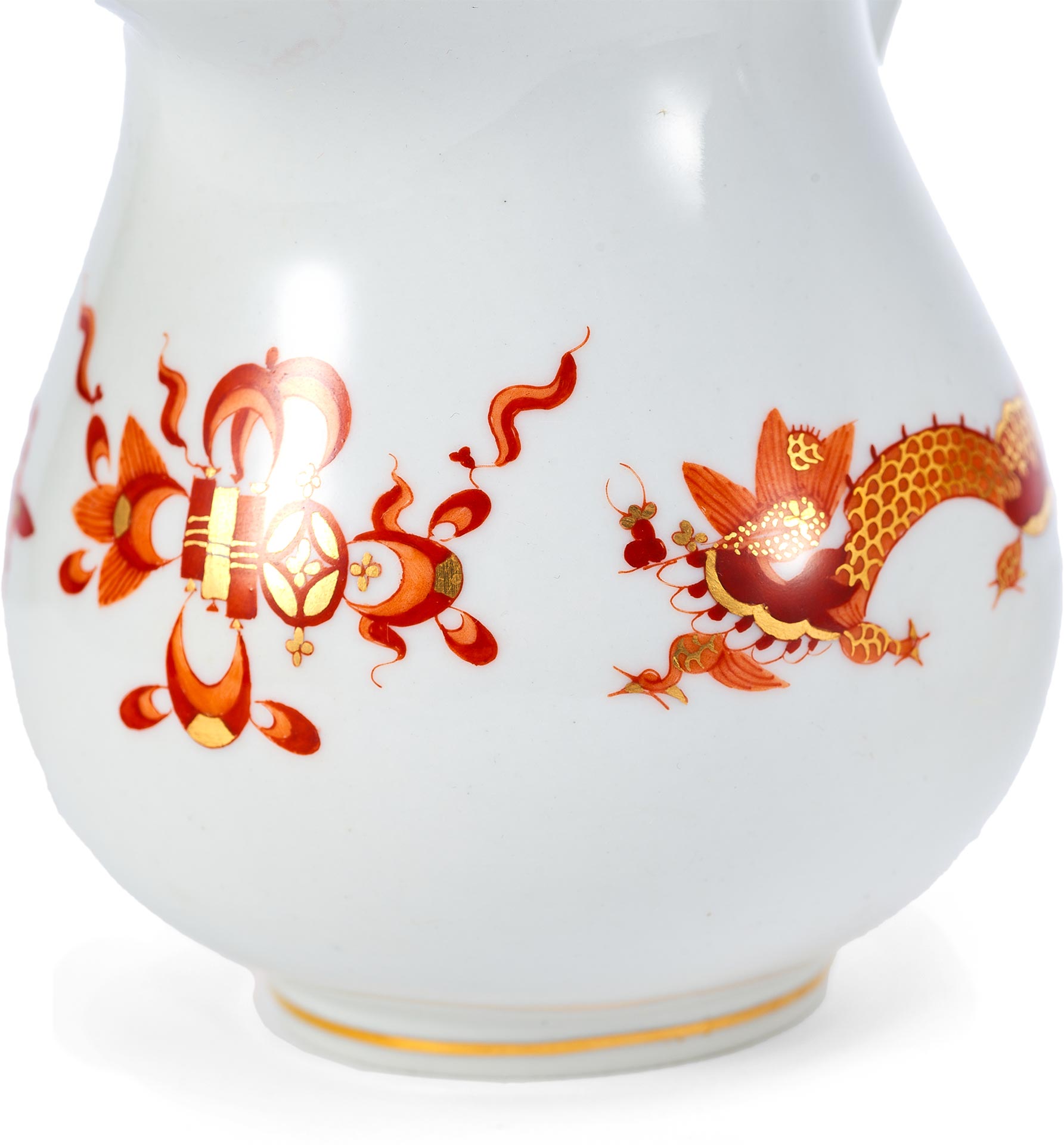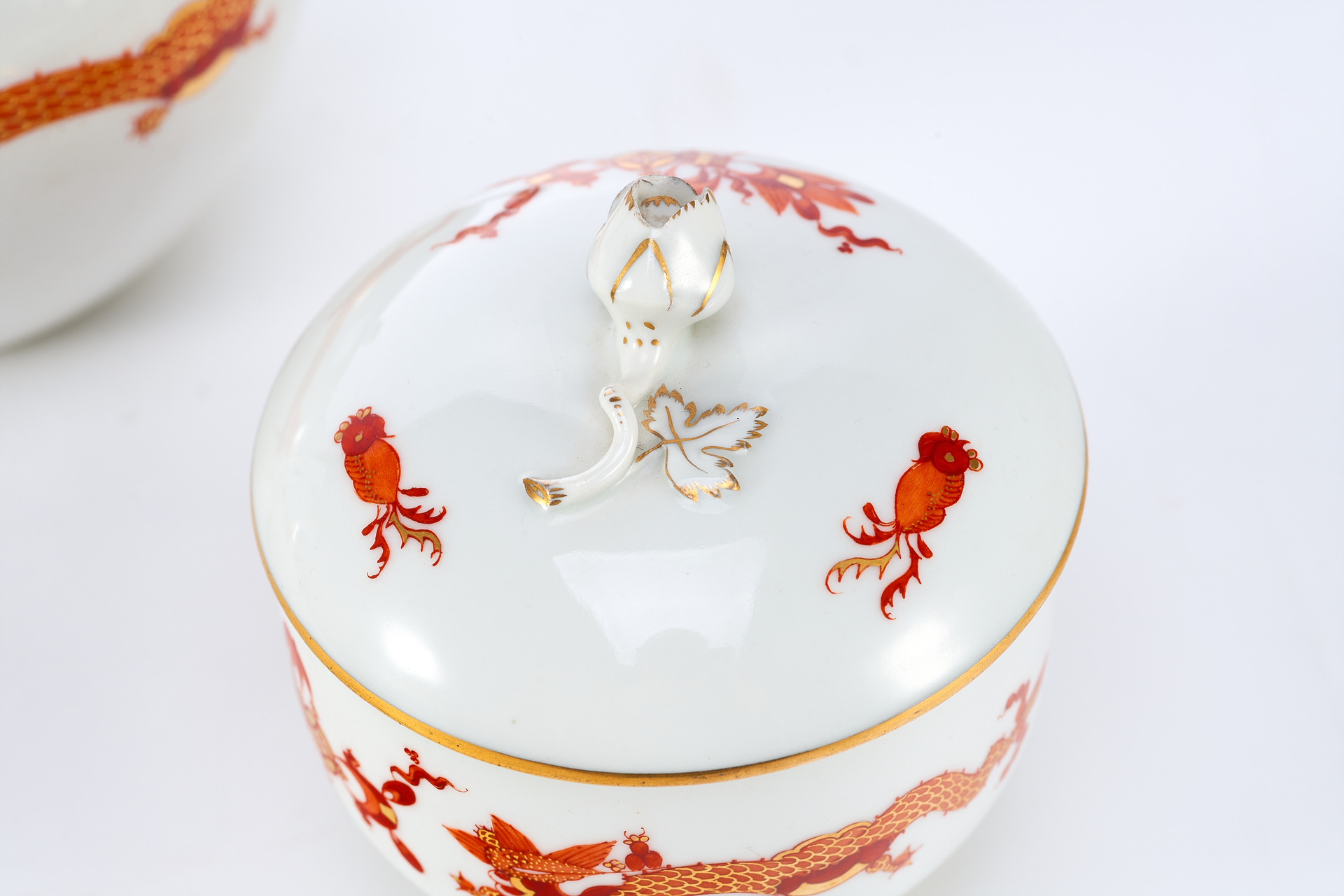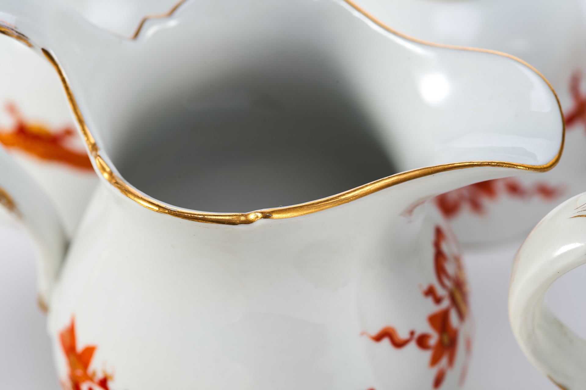 Чайный сервиз, изображённый на фотографии, представляет собой изысканный ансамбль из фарфора, произведённый в 1930-е годы на фабрике Meissen – одном из наиболее влиятельных центров европейской керамики. Комплект включает в себя 20 предметов, среди которых: чайник, сливочник, сахарница, пять чайных пар, шесть десертных тарелок и большое сервировочное блюдо. Все изделия выполнены в едином декоративном стиле и украшены характерной орнаментальной росписью, объединяющей мотивы шинуазри, с изображением китайских драконов и восточных узоров. Роспись выполнена вручную с применением золочения, а подчёркнутые золотом края и стилизованные декоративные элементы придают ансамблю особую утончённость.