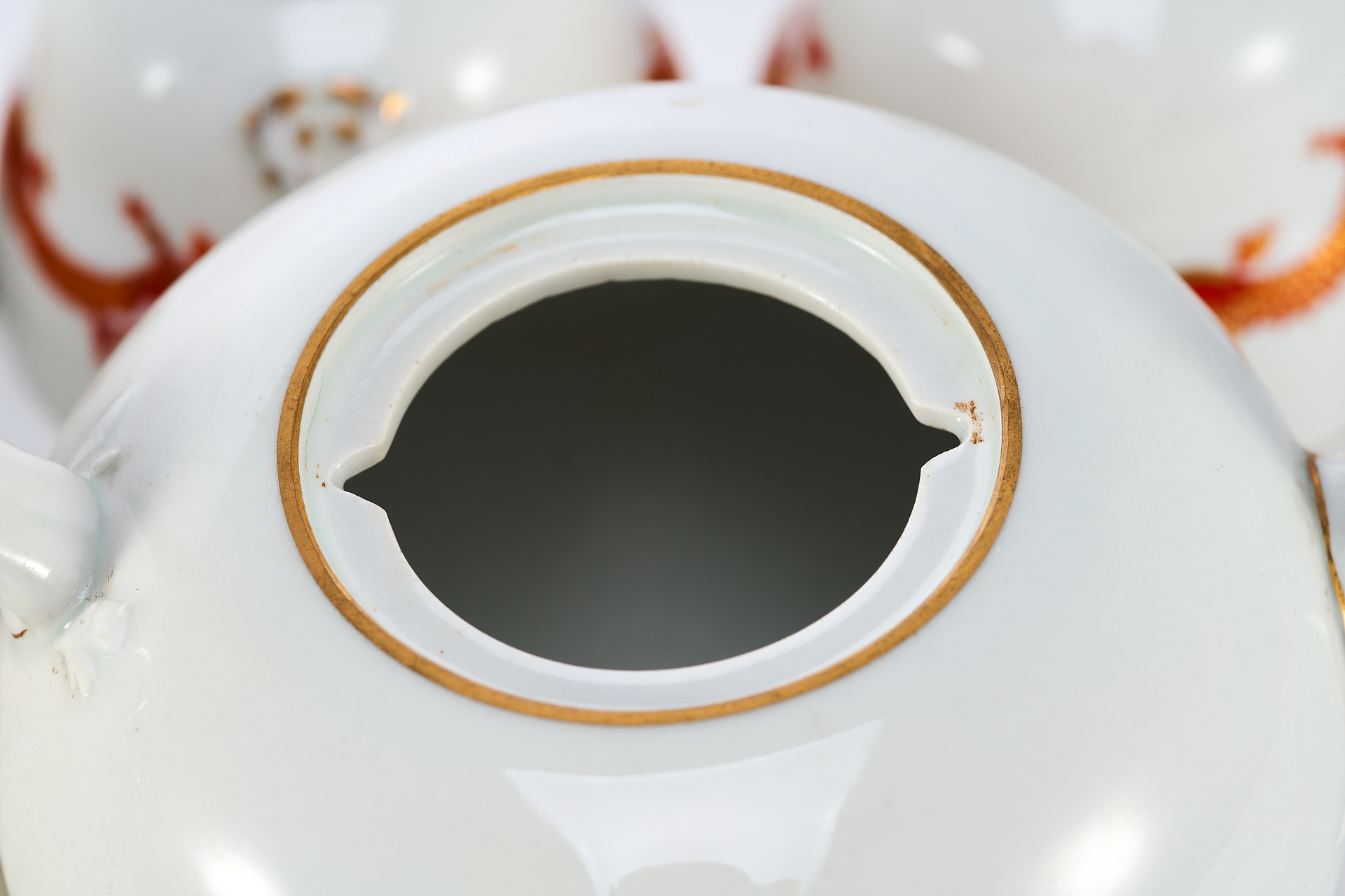Декоративные особенности сервиза выражены в сдержанном, но изысканном орнаменте, выполненном в красно-золотой гамме. Основными элементами декора стали мифологические животные, такие как драконы, и стилизованные восточные символы, унаследованные от художественного стиля шинуазри, популярного в Европе XVIII–XIX веков и пережившего новый виток популярности в межвоенный период.