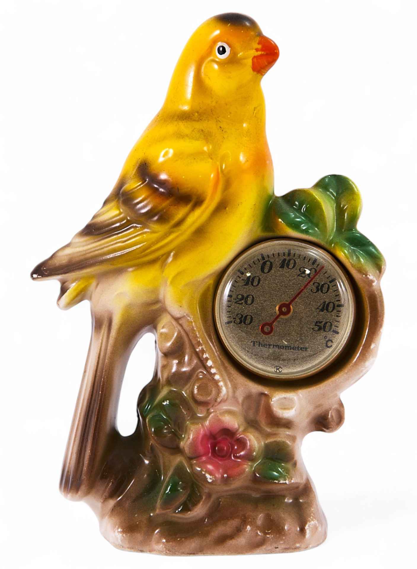 Комнатный настольный термометр круглой формы, вмонтированный в фаянсовую скульптуру, K(имитирующую ствол цветущего дерева, на ветке которого сидит желтый попугайчик. Скульптуры со схожей пластикой изготавливались на венской фабрике «Keramos» (Wiener Kunst-Keramik und Porzellan manufaktur). Внешний вид предмета и состояние использованных материалов не противоречат указанной датировке. «Keramos» (Wiener Kunst-Keramik und Porzellanmanufaktur)1919-1982 rr. Венская фабрика художественной керамики и фарфора была основана в 1919 году несколькими пенсионерами, финансово поддержанными государством. Затем фабрика преобразуется в открытое акционерное общество с директором Отто Коллером и Рудольфом Вольфом и Генрихом Вольфом. Компания находилась в знаменитом Хофбурі е (ранее зимней резиденции Габсбургов). Производство находилось в Вене, на Schleiergass : 17. В 1932 году в компании насчитывается более 50 сотрудников. Компания пользуется большим ассортиментом моделей скульптора Эдуарда Клаблена и несколькими моделям і Wiener Werkstätte (Венские мастерские). Компания производила предметы роскоши из фаянса, майолики (статуэтки, скульптуры животных, светильники, вазы, брелоки, шкатулки). Со своим ассортиментом она была представлена на художественной выставке в Париже в 1925 г., где получила серебряную медаль. В течение 1960-х годов рынки сбыта фигурной керамики становились все более трудными. Таким образом, производство все больше перемещалось на хозяйственную керамику, поскольку керамические фигуры перестали быть современными из-за меняющегося вкуса и духа времени. В конечном итоге экономическая ситуация в Керамосе становилась все более и более сложной, и директор Клаус Матис, сменивший своего отца Роберта Матиса в управлении производством в начале 1970-х годов, инициировал ликвидацию компании в конце 1982 года.