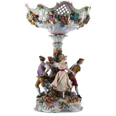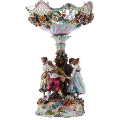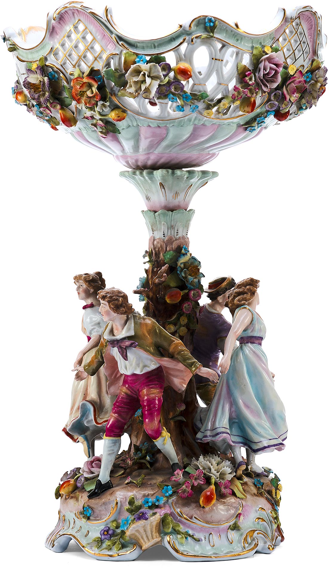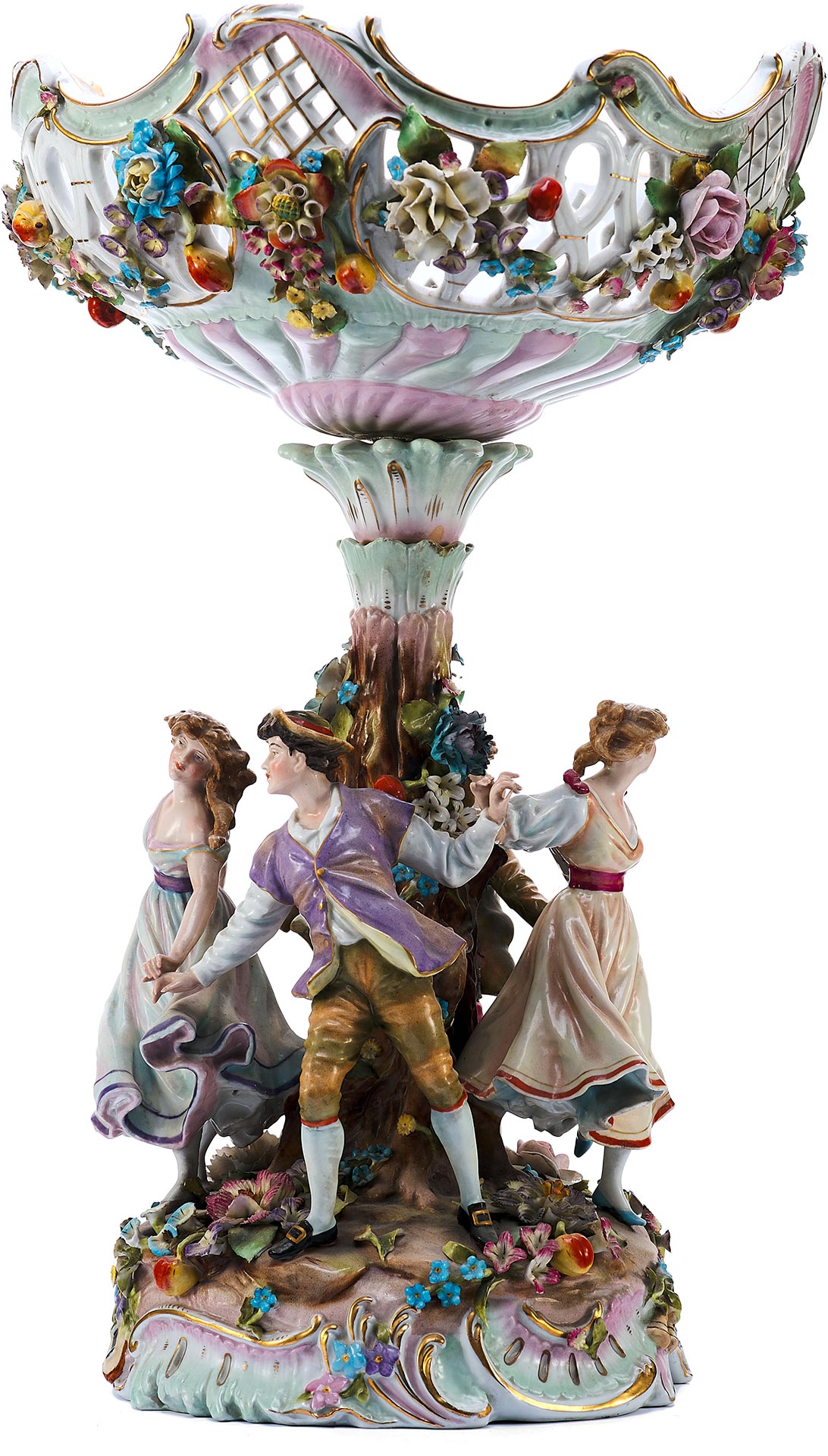Ваза для фруктов «Хоровод» представляет собой выразительный образец немецкого декоративного фарфора конца XIX — начала XX века, созданный на фабрике в Плауэ, расположенной в Тюрингии. Это изделие сочетает в себе черты рокайльного стиля с характерной тягой к декоративной избыточности, пасторальной тематике и стилизации под галантную эпоху XVIII века.
