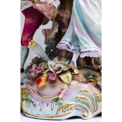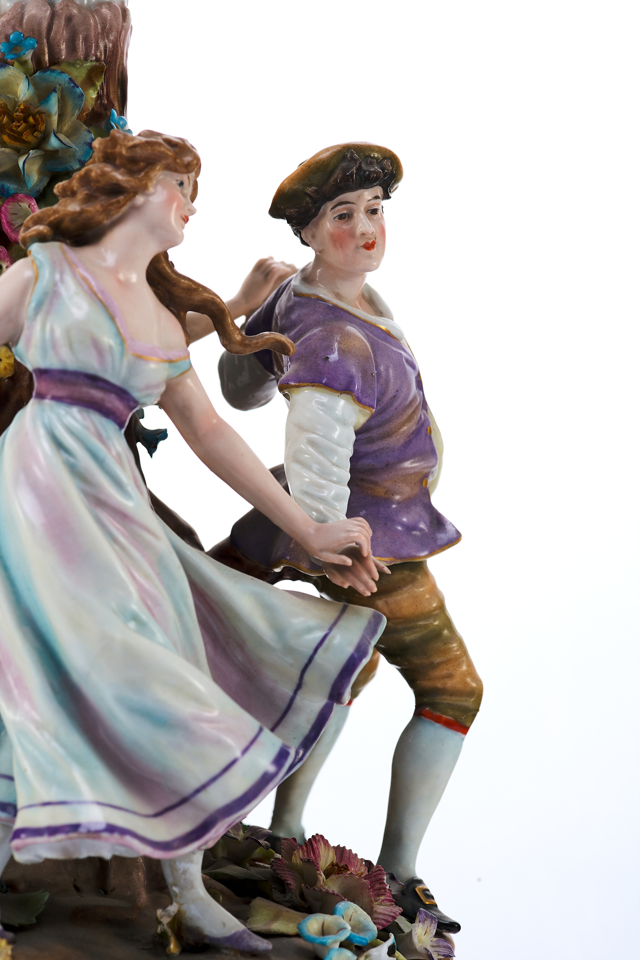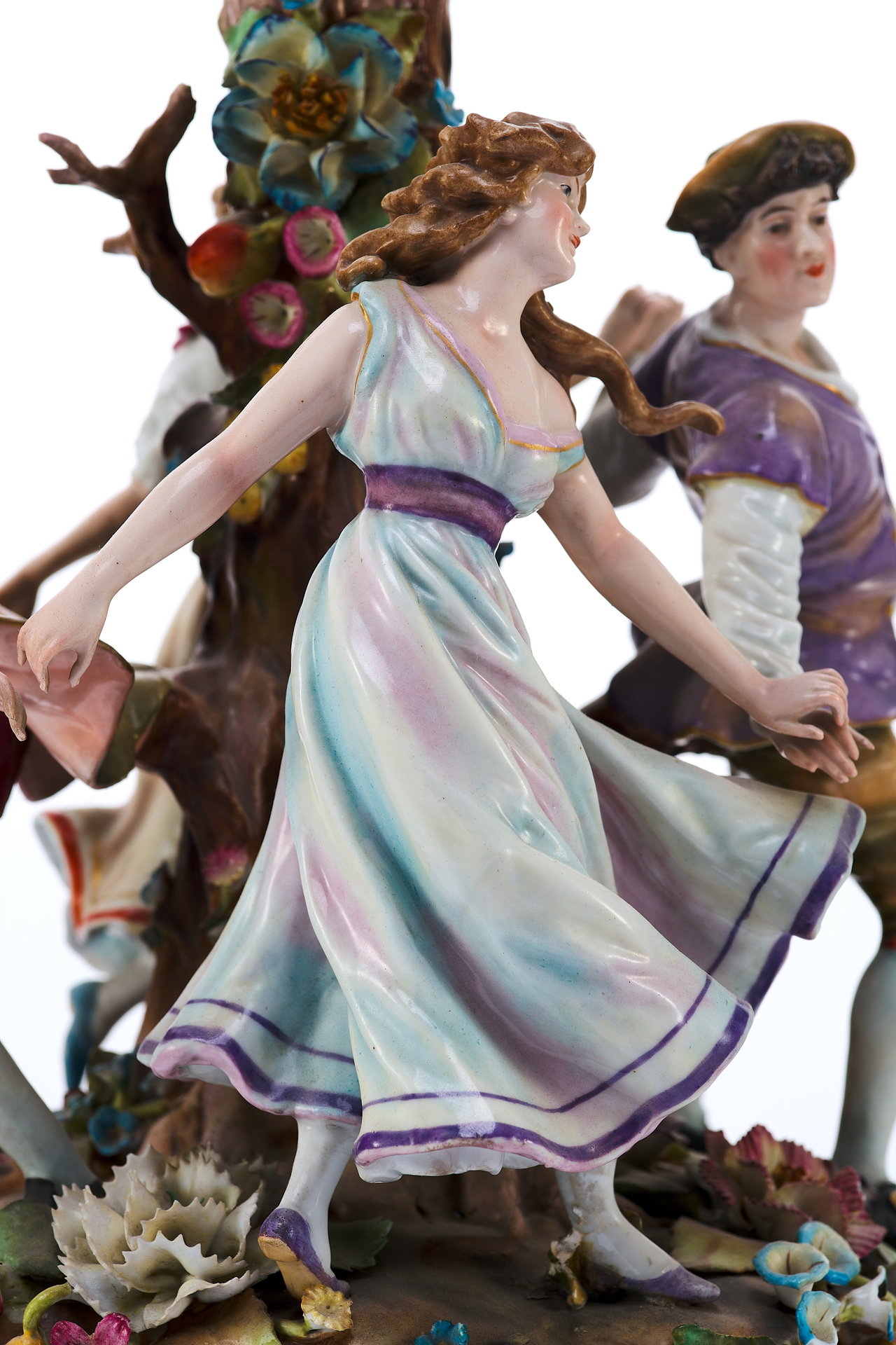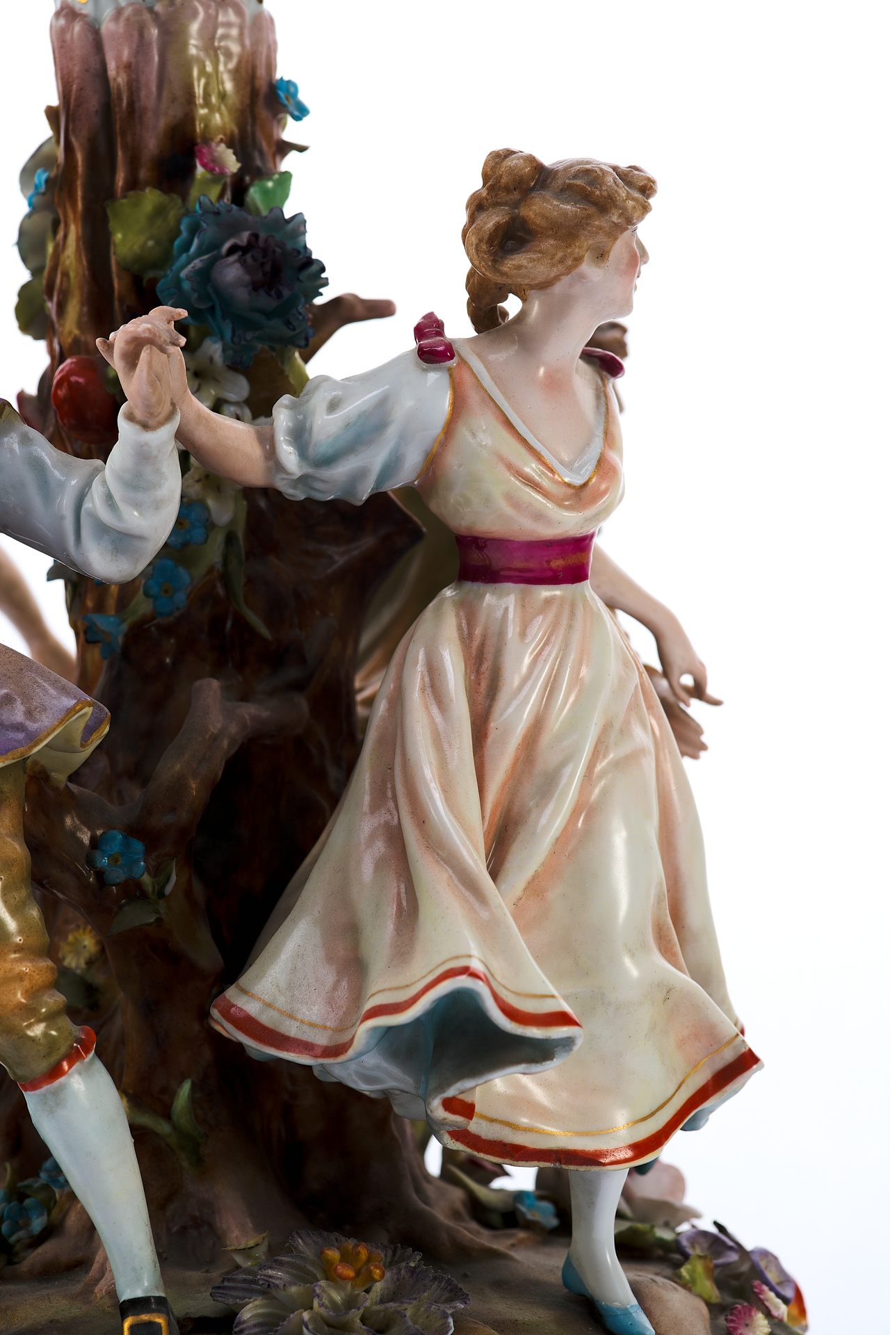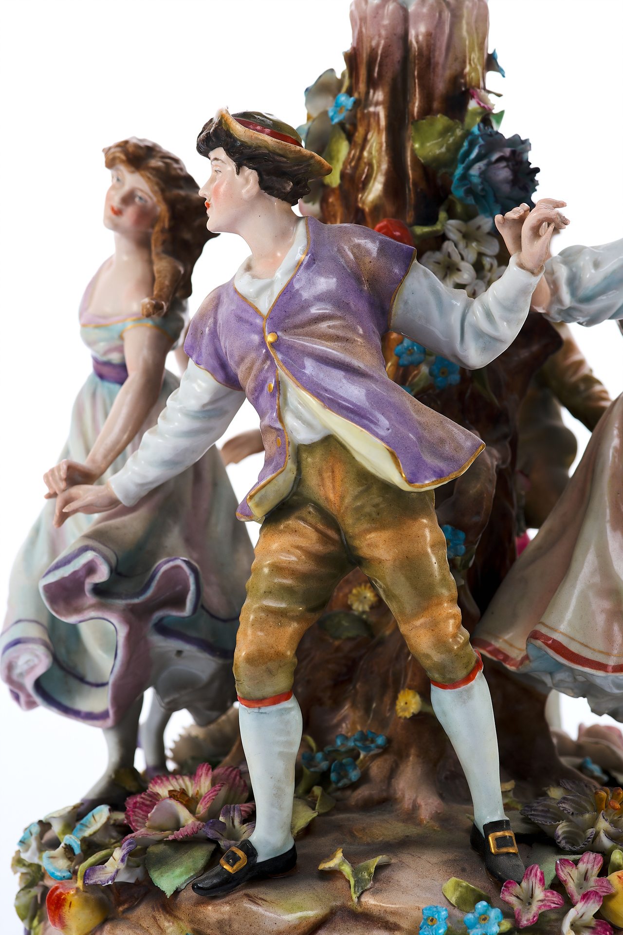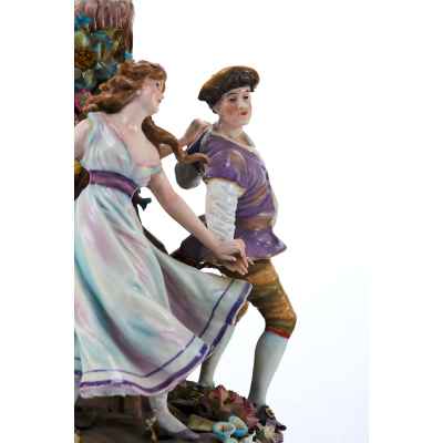 Скульптурная основа выполнена в виде стилизованного дерева, у подножия которого размещены юноши и девушки, объединённые в хоровод. Их наряды отсылают к моде второй половины XVIII — начала XIX века, что подчёркивает декоративную стилизацию и театральность композиции. Персонажи переданы с живой мимикой и пластикой движений, их одежда развевается в динамике танца, создавая эффект оживлённой сценки. Фигуративная лепка выполнена с большой тщательностью, характерной для продукции мануфактуры фон Ширхольца, особенно в период её расцвета после 1900 года.