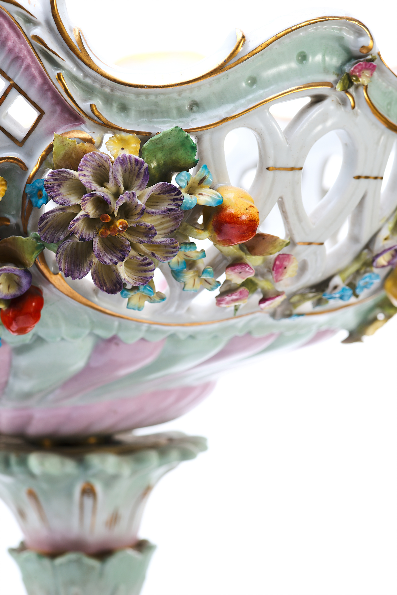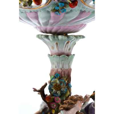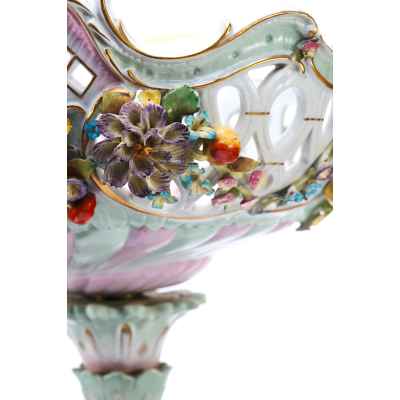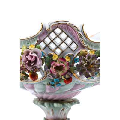 Фарфор окрашен в мягкие пастельные тона с использованием надглазурной полихромной росписи, обогащённой позолотой. Верхняя часть вазы — ажурная чаша — оформлена гирляндами из цветов и фруктов, выполненными в технике объемной лепки. Их насыщенные цвета и фактурность создают ощущение праздничного изобилия, усиливая декоративную функцию предмета. Стилизация под корзину и обилие цветочных элементов подчёркивают влияние стиля рококо, особенно популярного в реминисценциях конца XIX века.