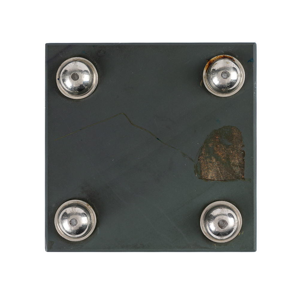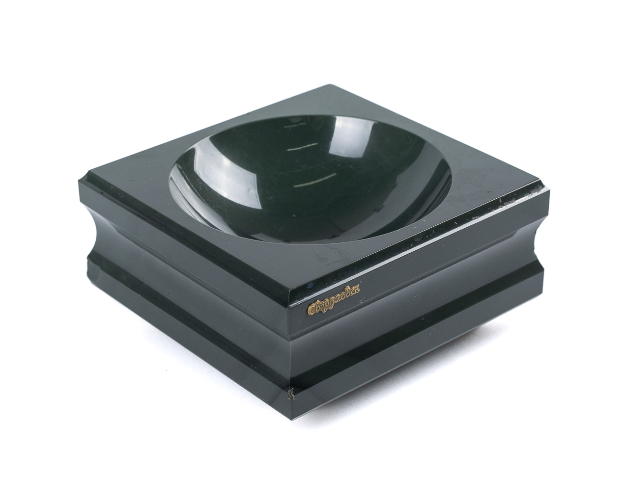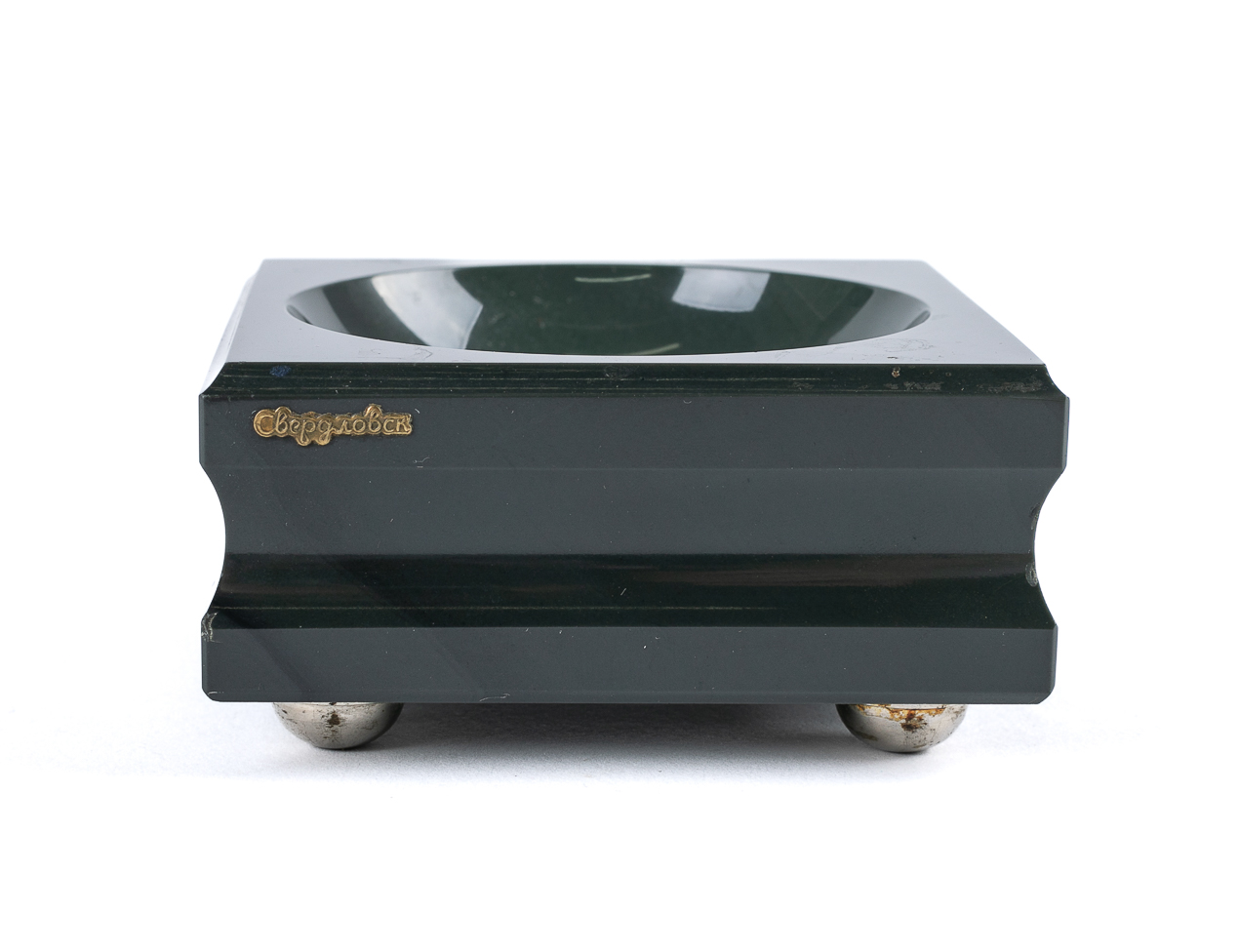 Пепельница квадратной формы, с профилированным основанием. На верхней торцовой части пепельницы укреплена металлическая надпись: «Свердловск». На основании укреплены 4 круглые металлические ножки. Настольные приборы и отдельные предметы из поделочного камня такого образца изготавливались на Урале с 1970-х годах. КАЛКАНСКАЯ ЯШМА — яшма Южного Урала нежно-зеленого, темносерого и стального цвета. Месторождение: вблизи оз. Калкан, на горе Сабинде.