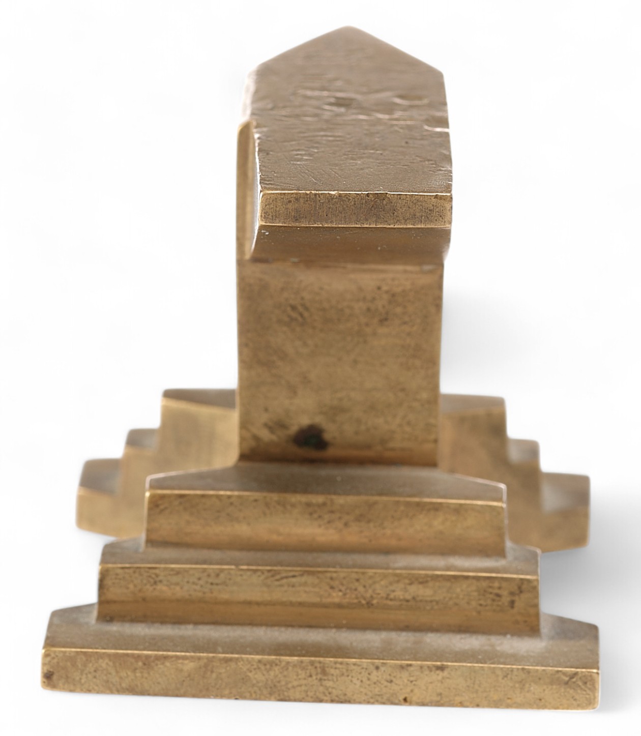Пресс-папье изготовлено из бронзы методом литья, что придаёт ему прочность и долговечность. Поверхность предмета отличается тщательной обработкой, характерной для высококачественных литых изделий первой половины XX века. Размеры составляют 5,5 × 12,0 × 6,8 см, что делает его удобным для использования в качестве настольного аксессуара.