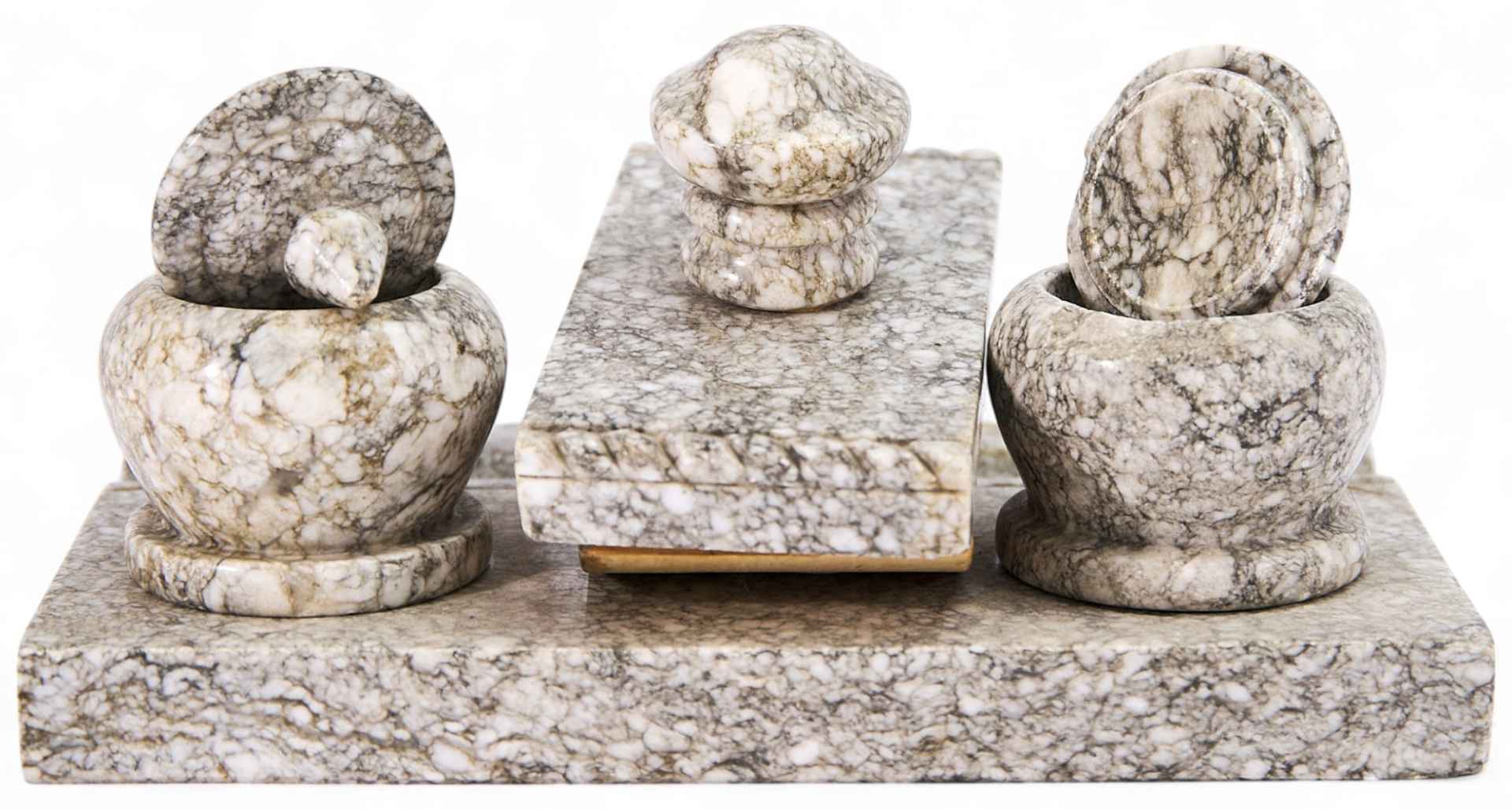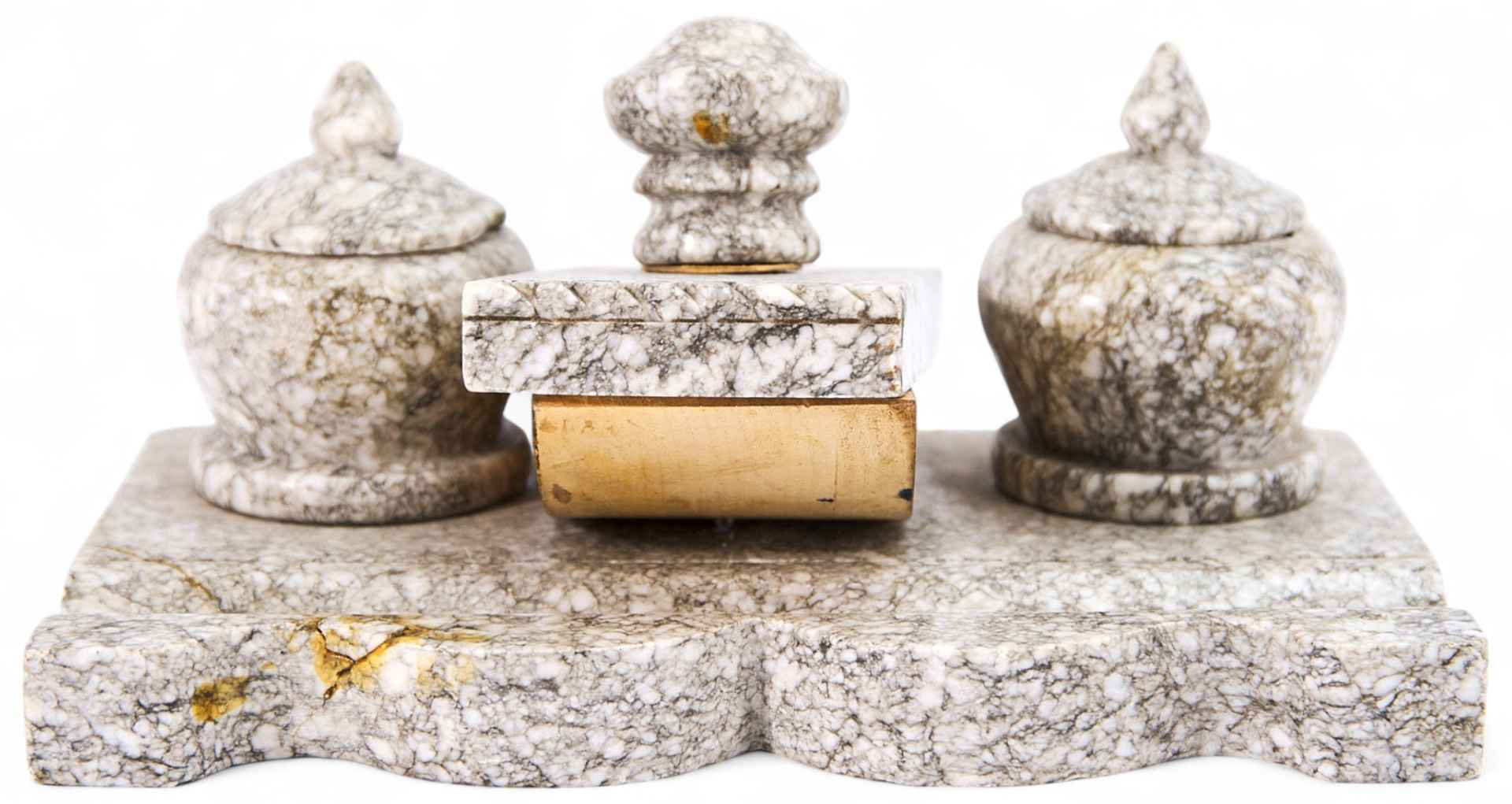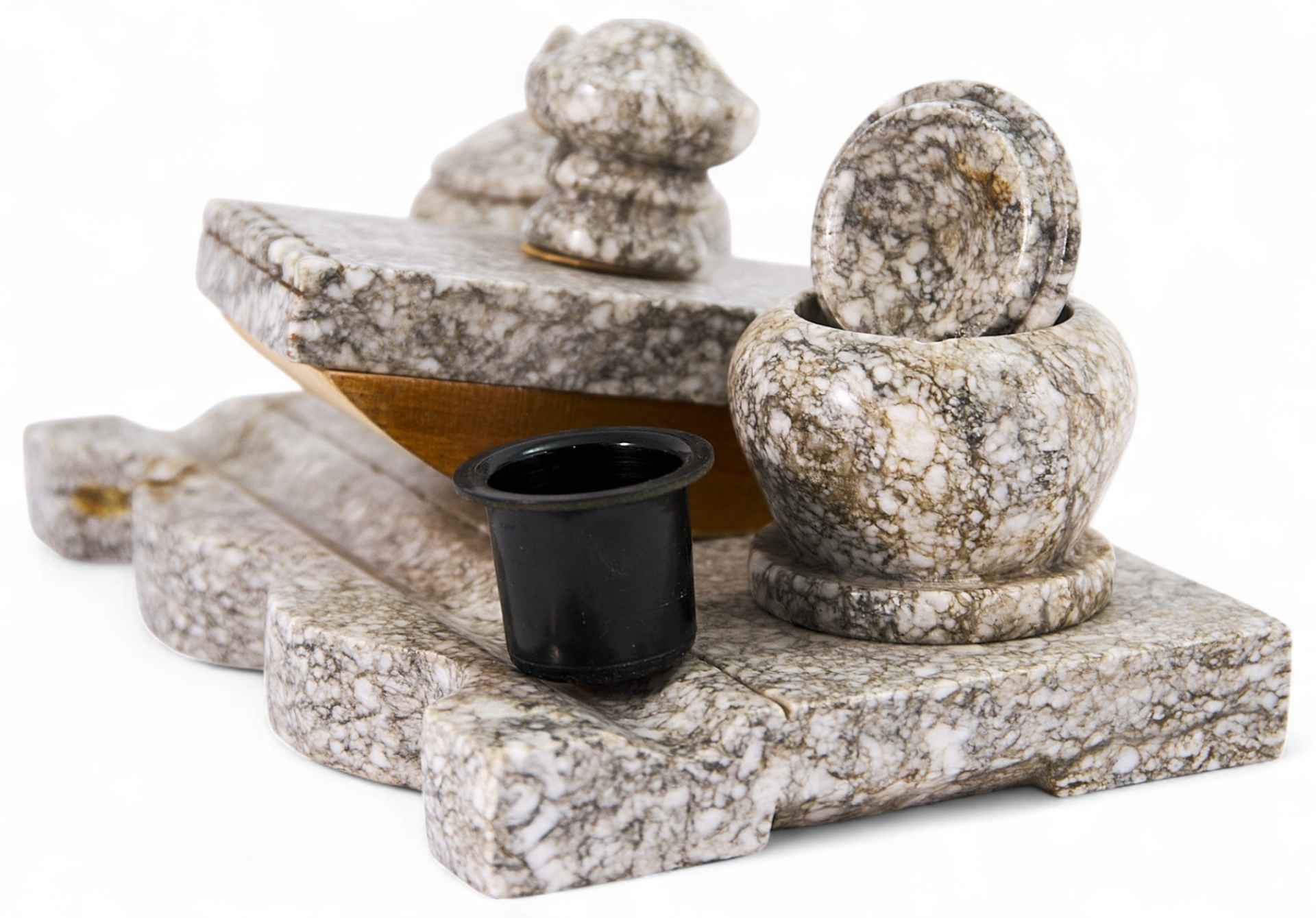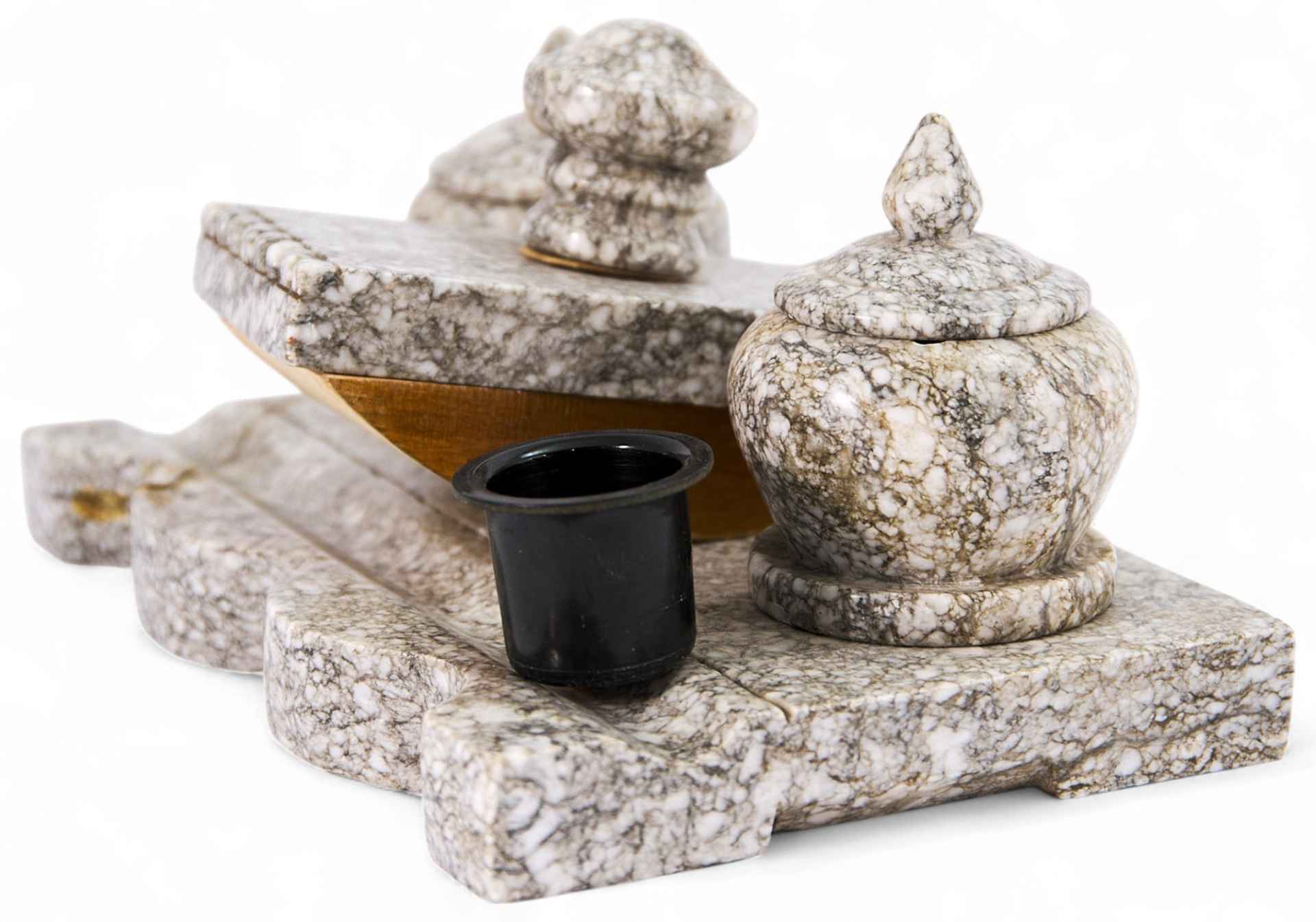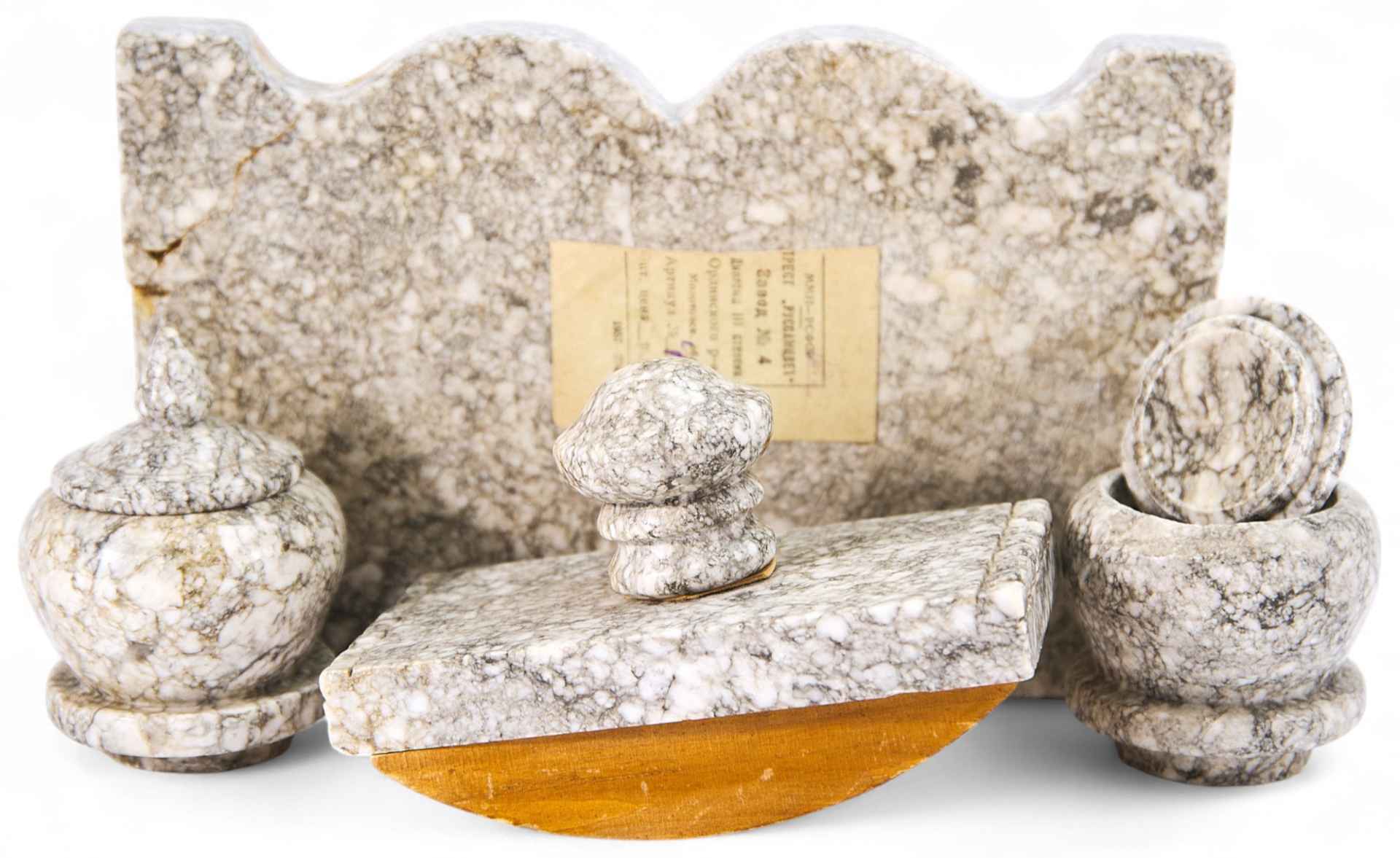 Представлен письменный набор состоящий из: двух чернильниц, подставки с ложбинкой для пера и пресс-бювара. Все предметы вырезаны из камня. На основании подставки бумажная наклейка треста «Русские самоцветы», завода М4.