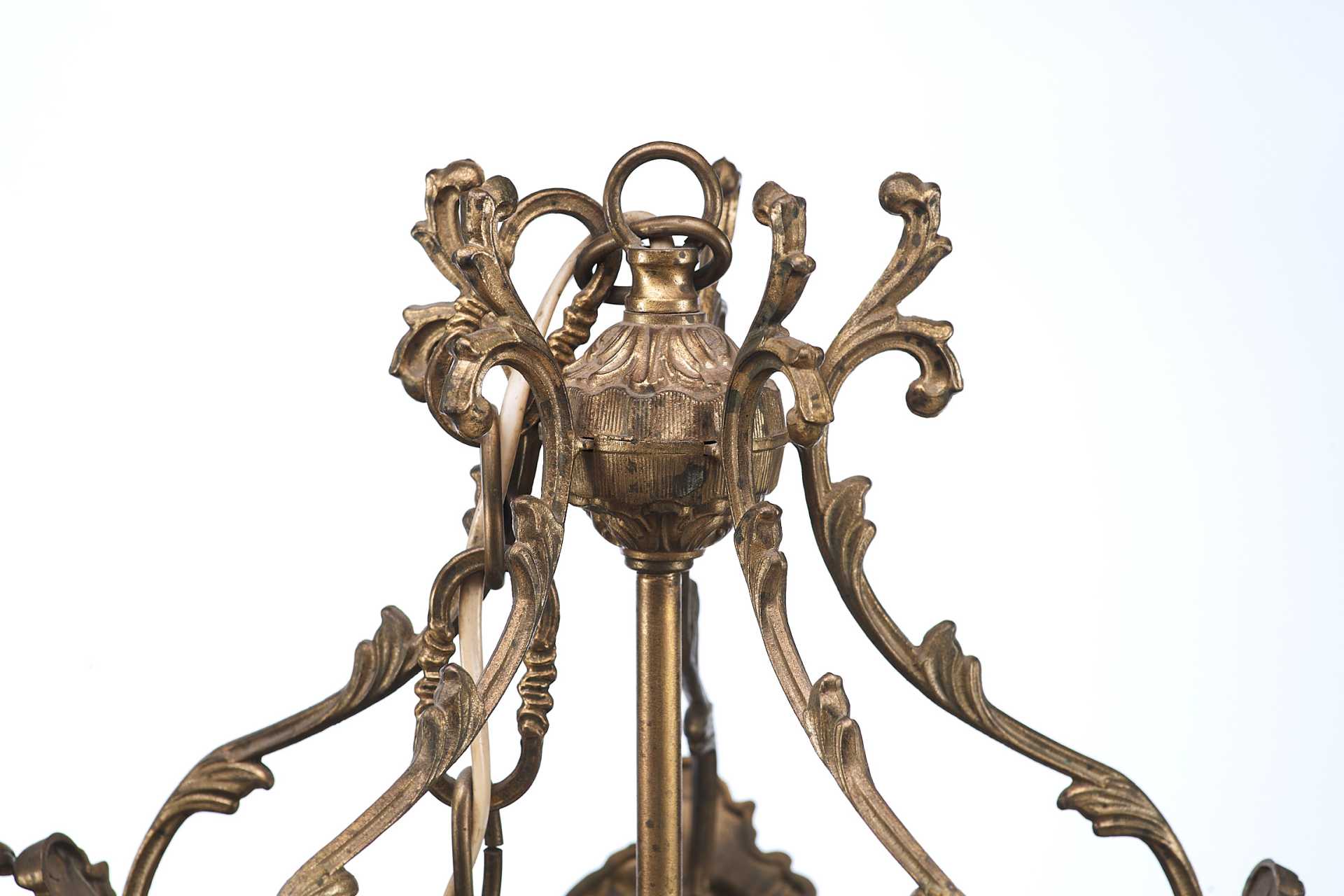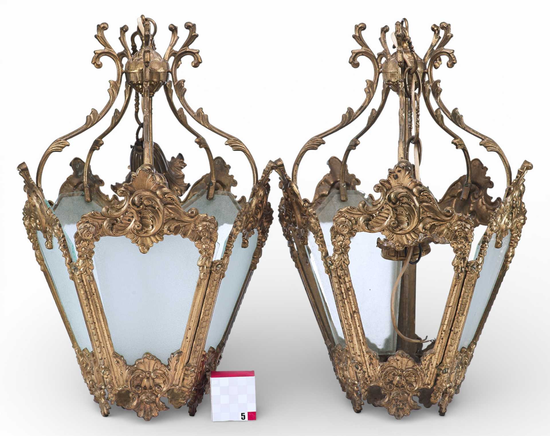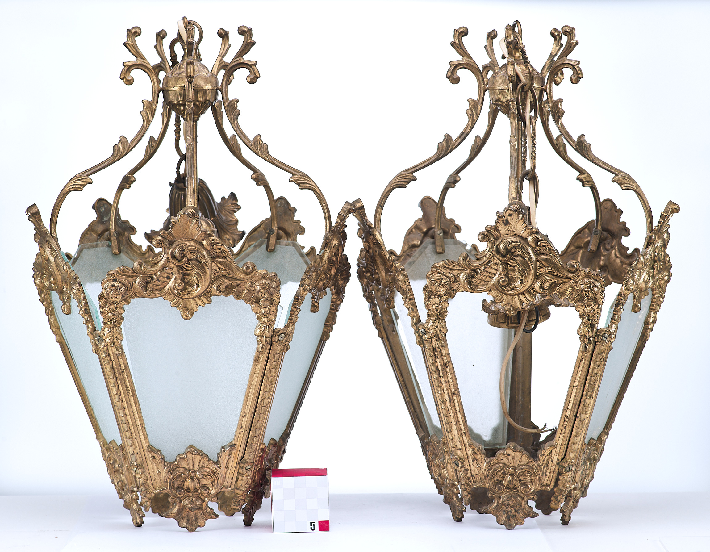 Бронзовые части светильника обильно украшены ажурными завитками-рокайлями, характерными для позднего варианта стиля «рококо» (третьего, распространенного в 1860-1870-е гг.). Фонарь — светильник (свечной, масляный, керосиновый, газовый, электрический), в котором огонь защищен со всех сторон от сквозняков или ветра стеклом (слюдой).