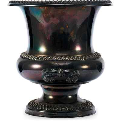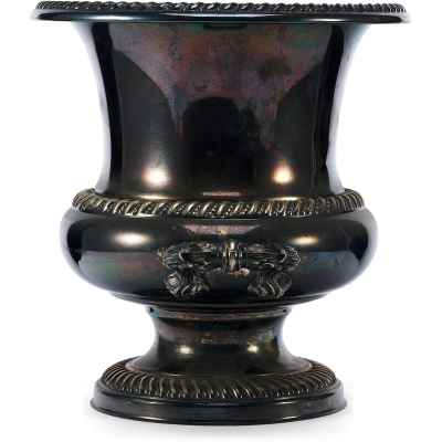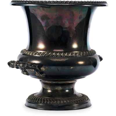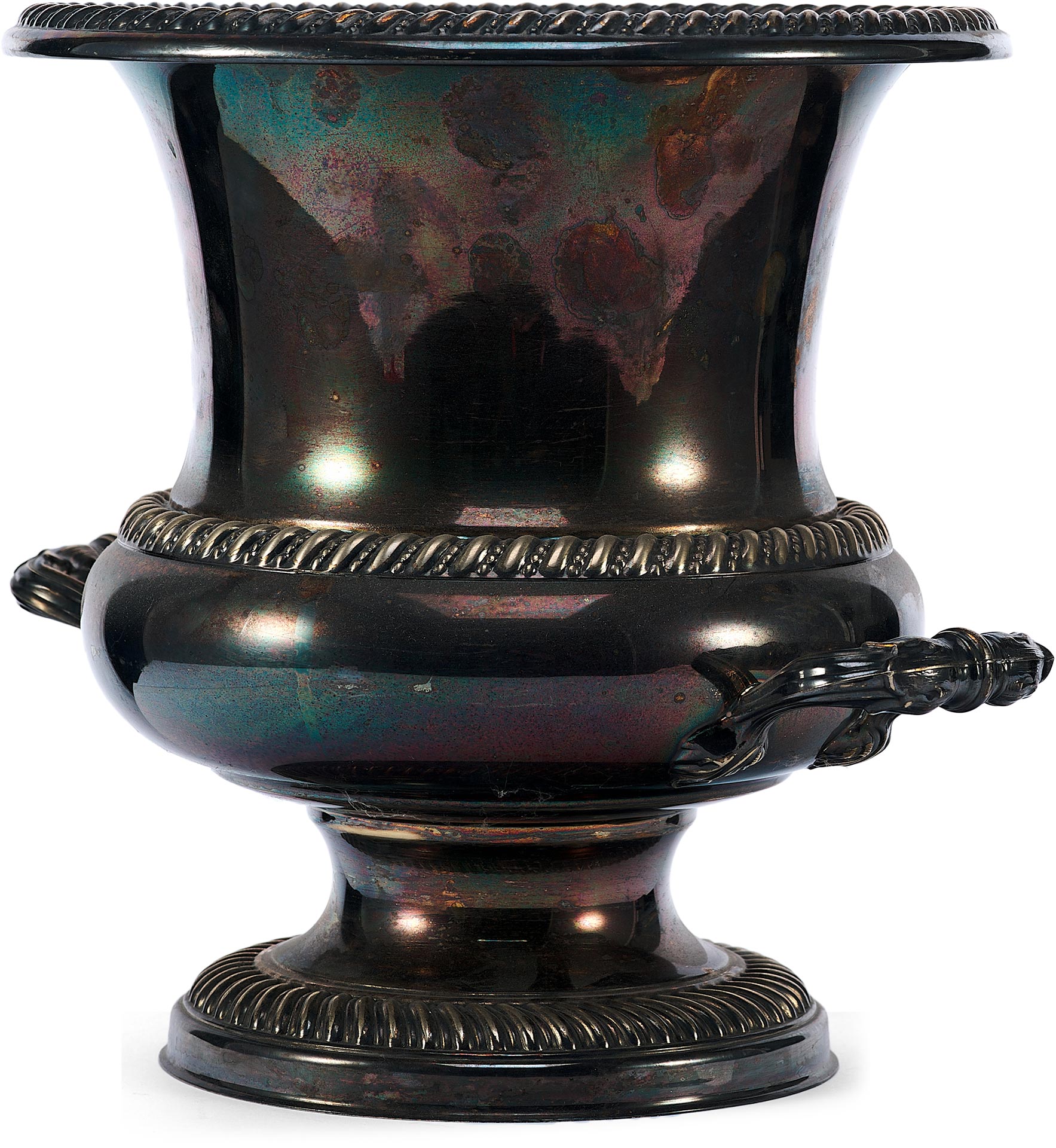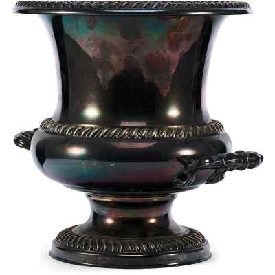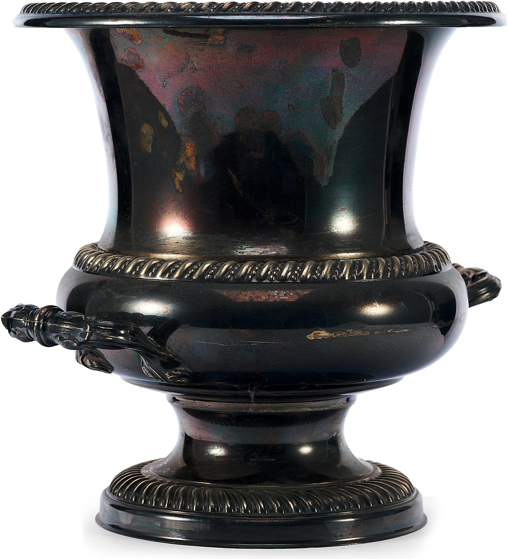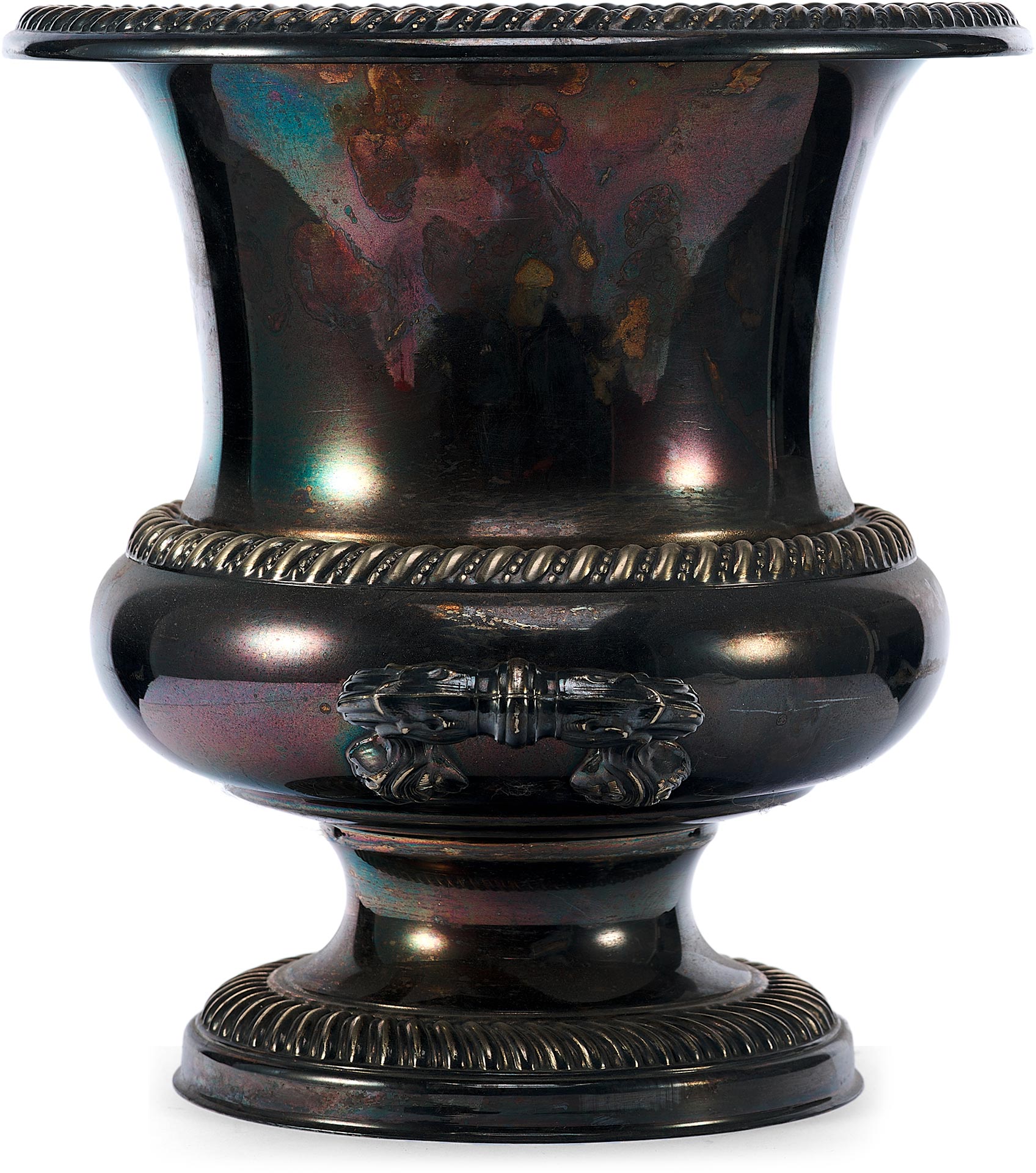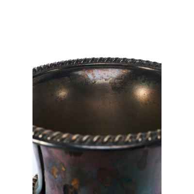 Это ведерко для охлаждения шампанского и вина выполнено в классической форме Медичи, восходящей к античным прототипам сосудов с высокой воронкообразной формой. Такой тип изделий обычно использовался в изысканных сервировках стола, особенно при подаче охлаждённых напитков в торжественной обстановке. Масштабная и симметричная форма подчёркнута рельефными каннелюрами и витиеватыми ручками, что придаёт предмету выразительную декоративность.