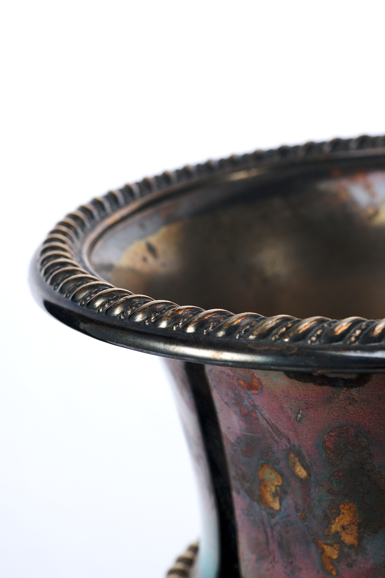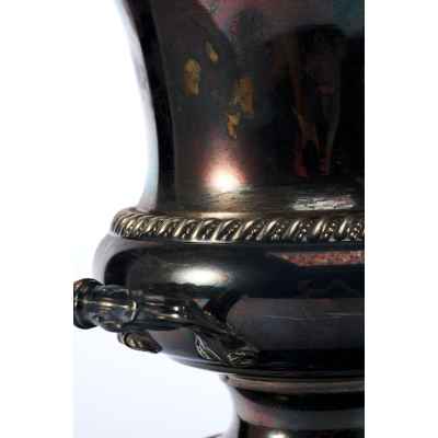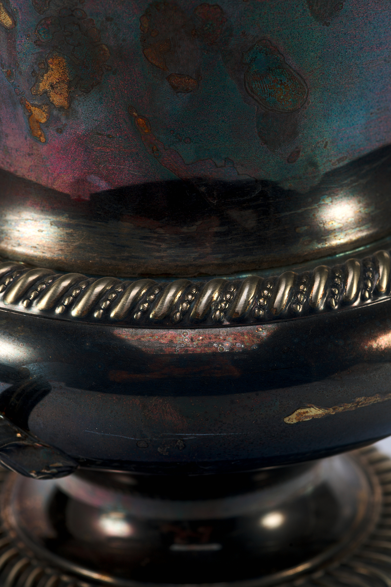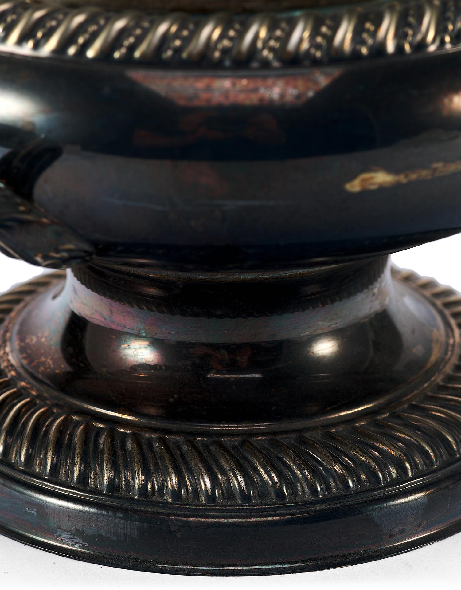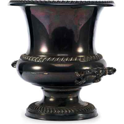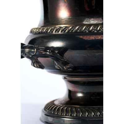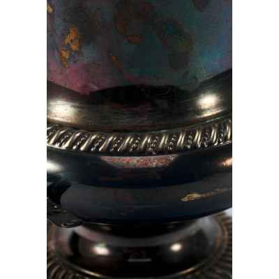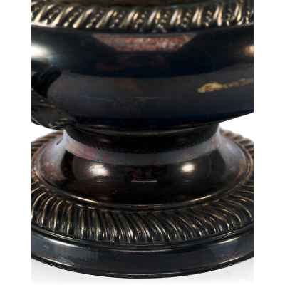 Это ведерко для охлаждения шампанского и вина выполнено в классической форме Медичи, восходящей к античным прототипам сосудов с высокой воронкообразной формой. Такой тип изделий обычно использовался в изысканных сервировках стола, особенно при подаче охлаждённых напитков в торжественной обстановке. Масштабная и симметричная форма подчёркнута рельефными каннелюрами и витиеватыми ручками, что придаёт предмету выразительную декоративность.