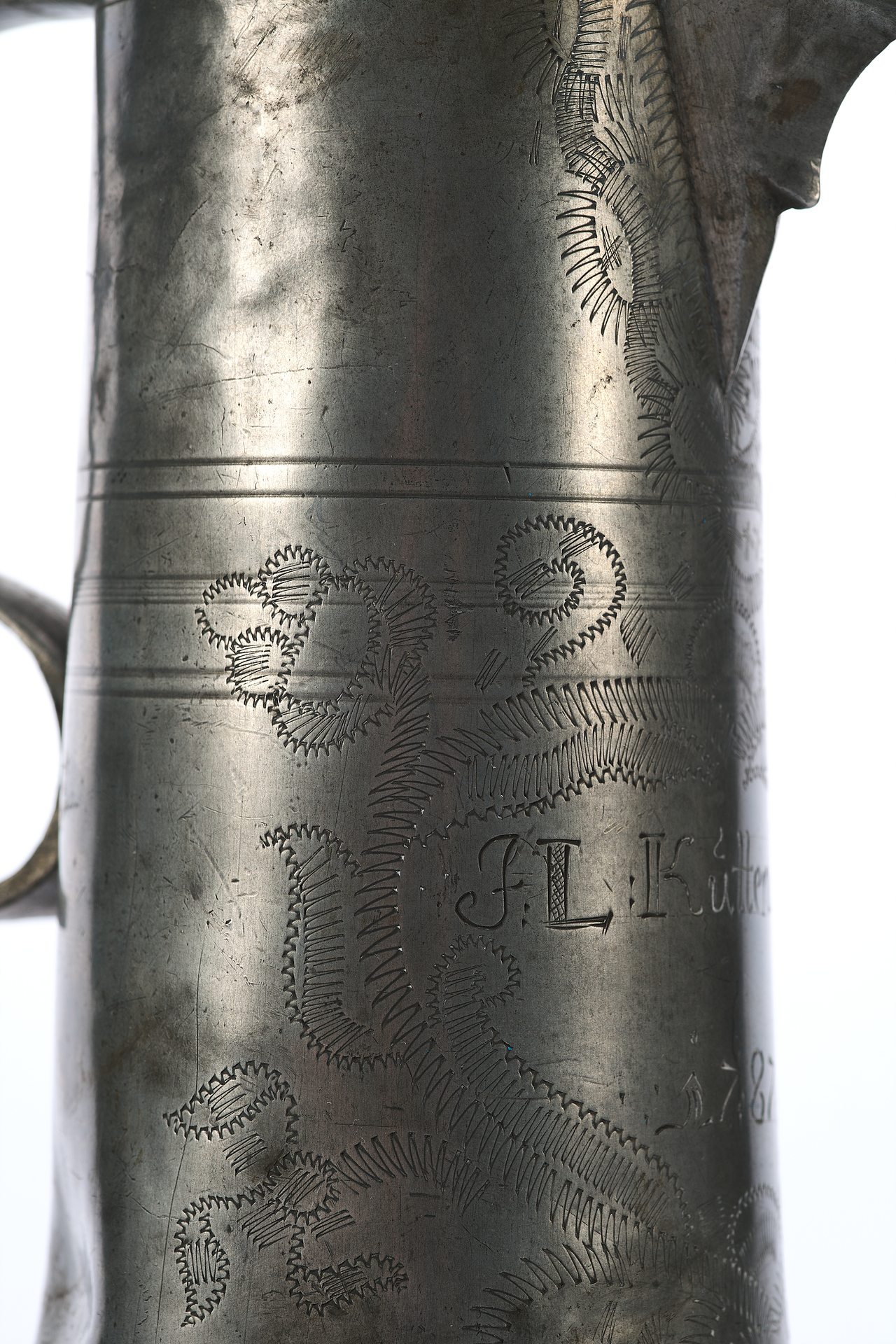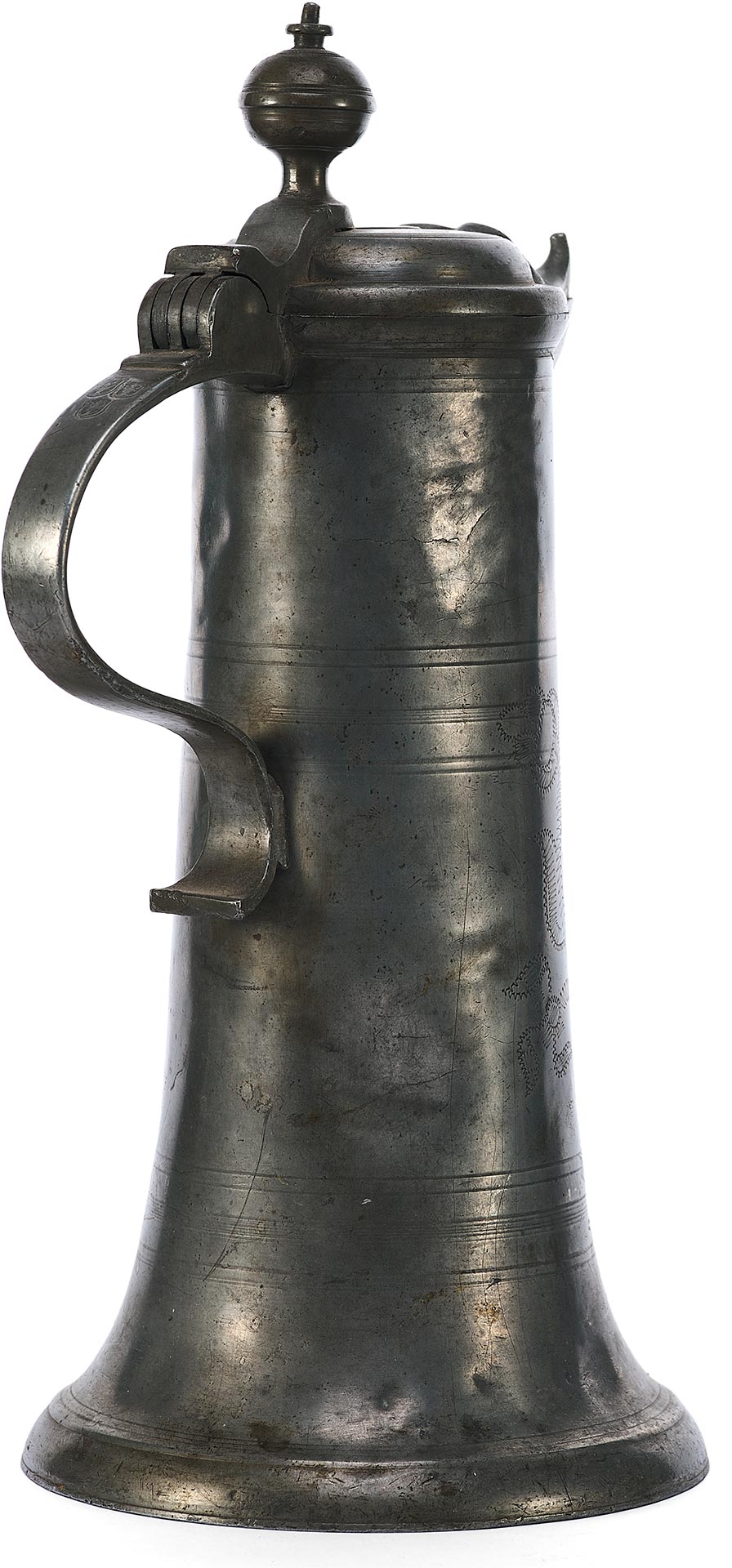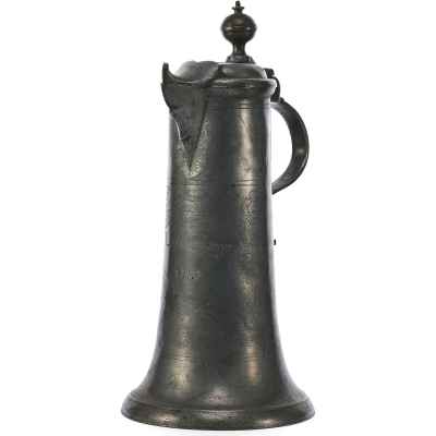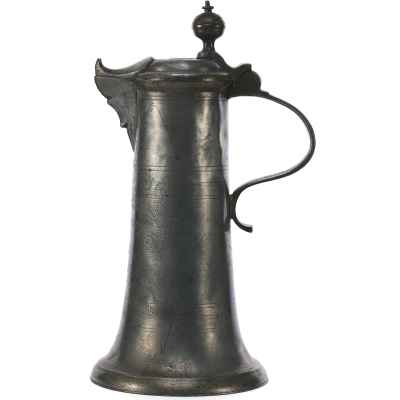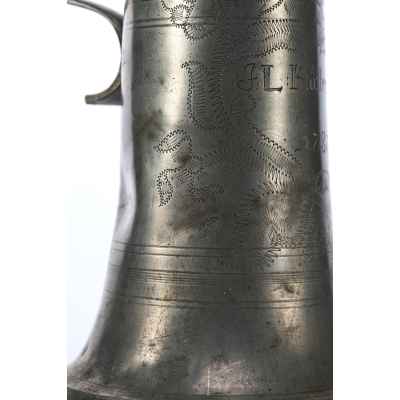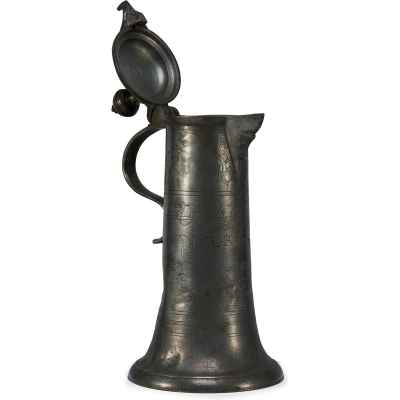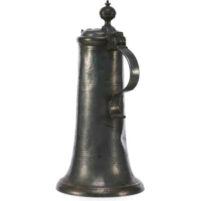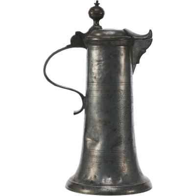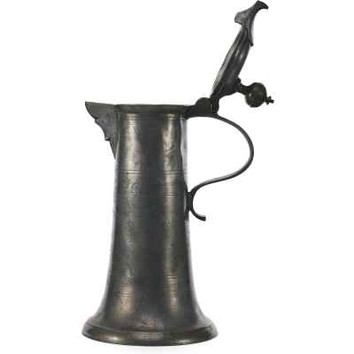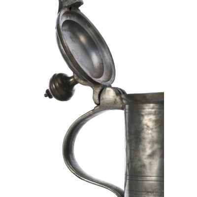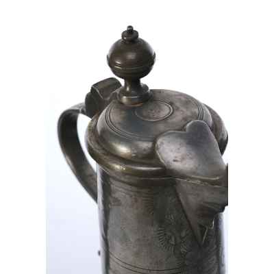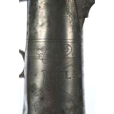 Перед нами антикварная оловянная кружка-кувшин с откидной крышкой, изготовленная в Южной Германии, что подтверждается гравированной надписью на корпусе: "J.L. Kuttenberger 1787". Этот тип сосудов известен под немецким названием Standkrug, что дословно переводится как «устойчивая кружка», и отличается высокой, вытянутой формой, плавным переходом корпуса в крышку и широкой устойчивой основой.