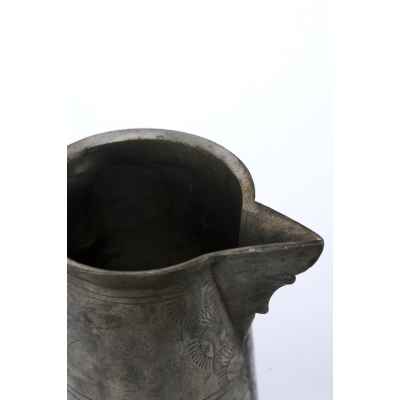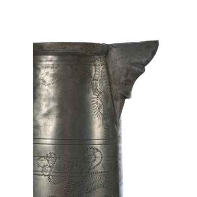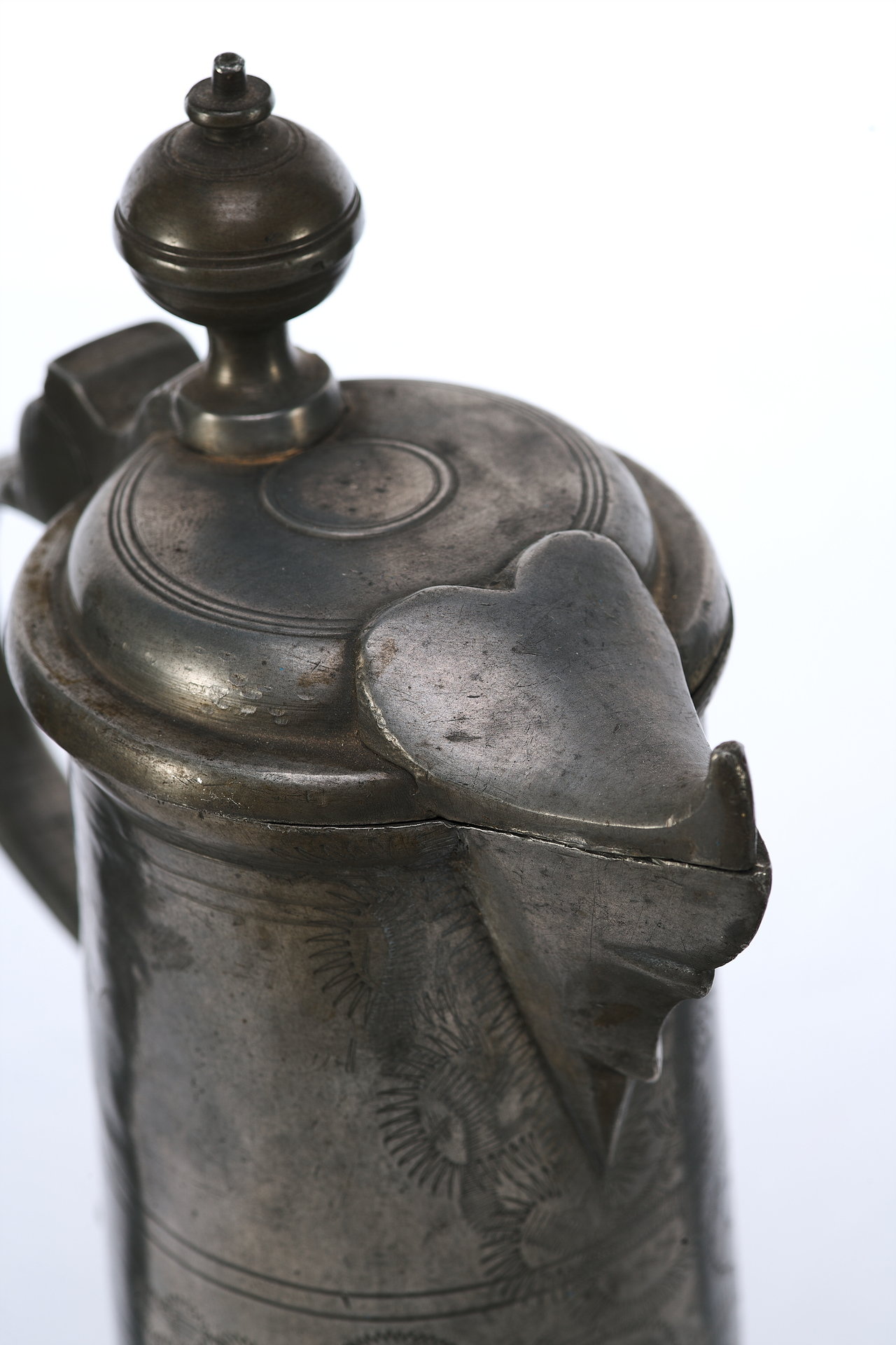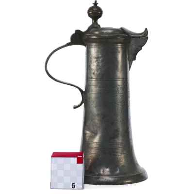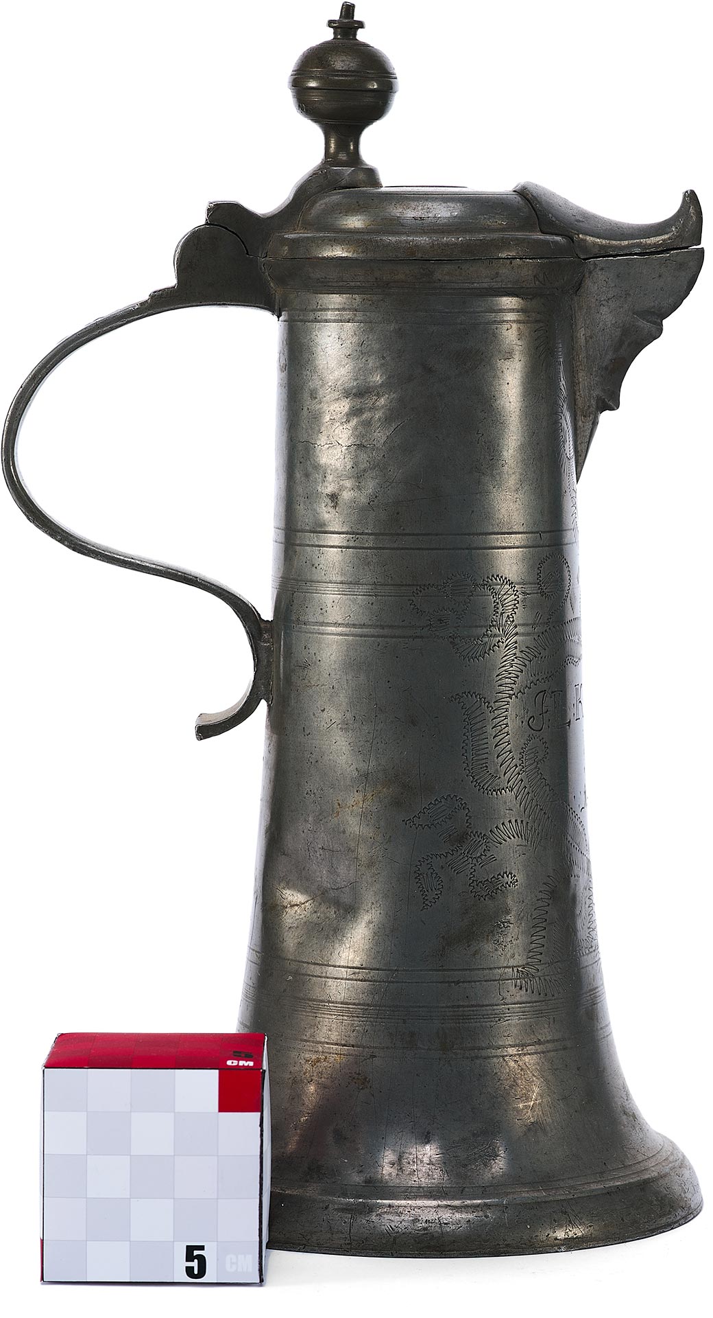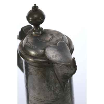 Перед нами антикварная оловянная кружка-кувшин с откидной крышкой, изготовленная в Южной Германии, что подтверждается гравированной надписью на корпусе: "J.L. Kuttenberger 1787". Этот тип сосудов известен под немецким названием Standkrug, что дословно переводится как «устойчивая кружка», и отличается высокой, вытянутой формой, плавным переходом корпуса в крышку и широкой устойчивой основой.