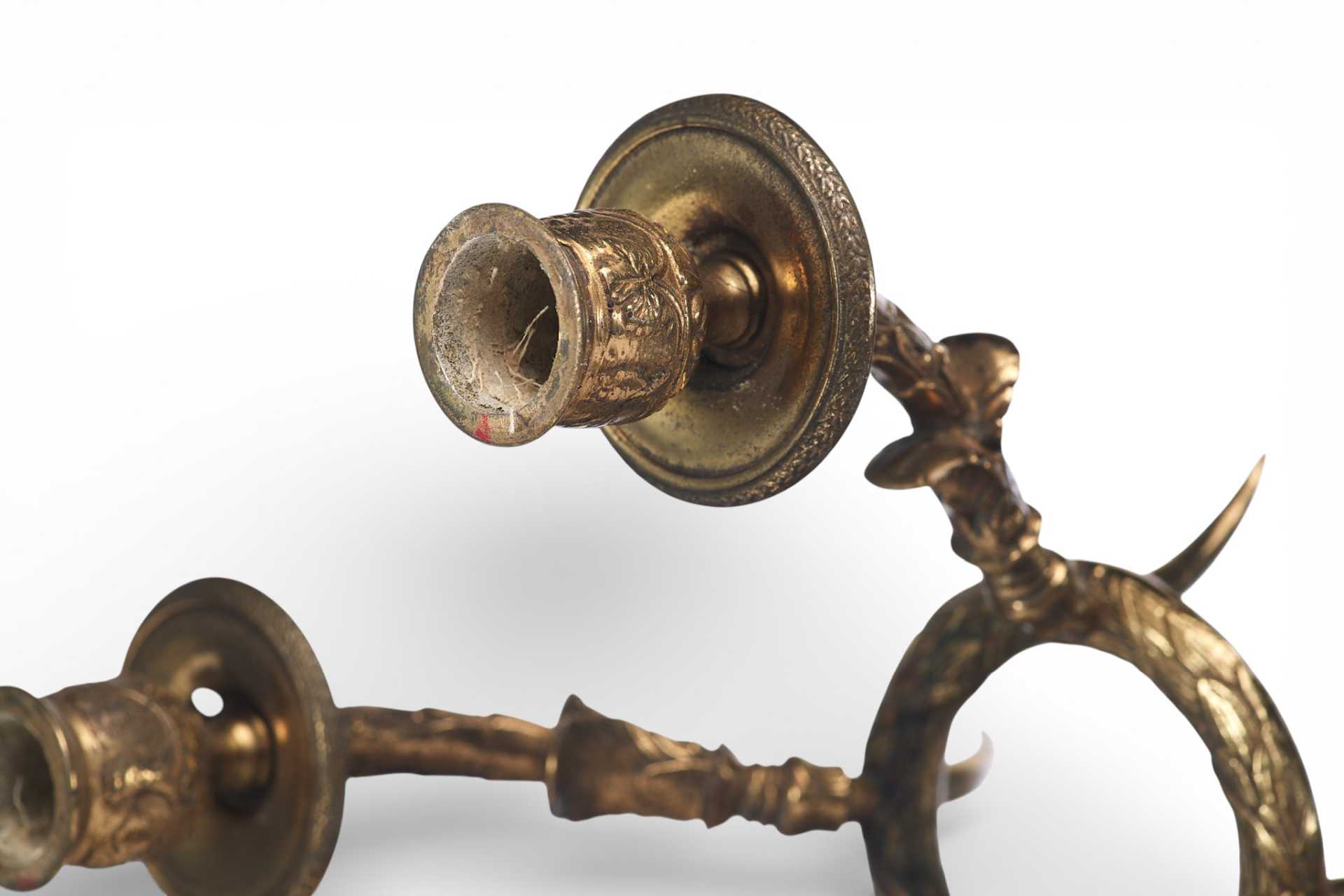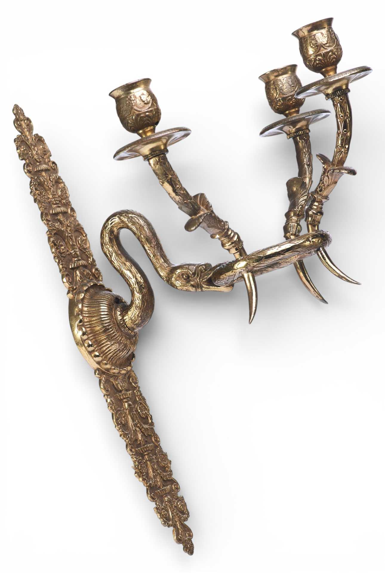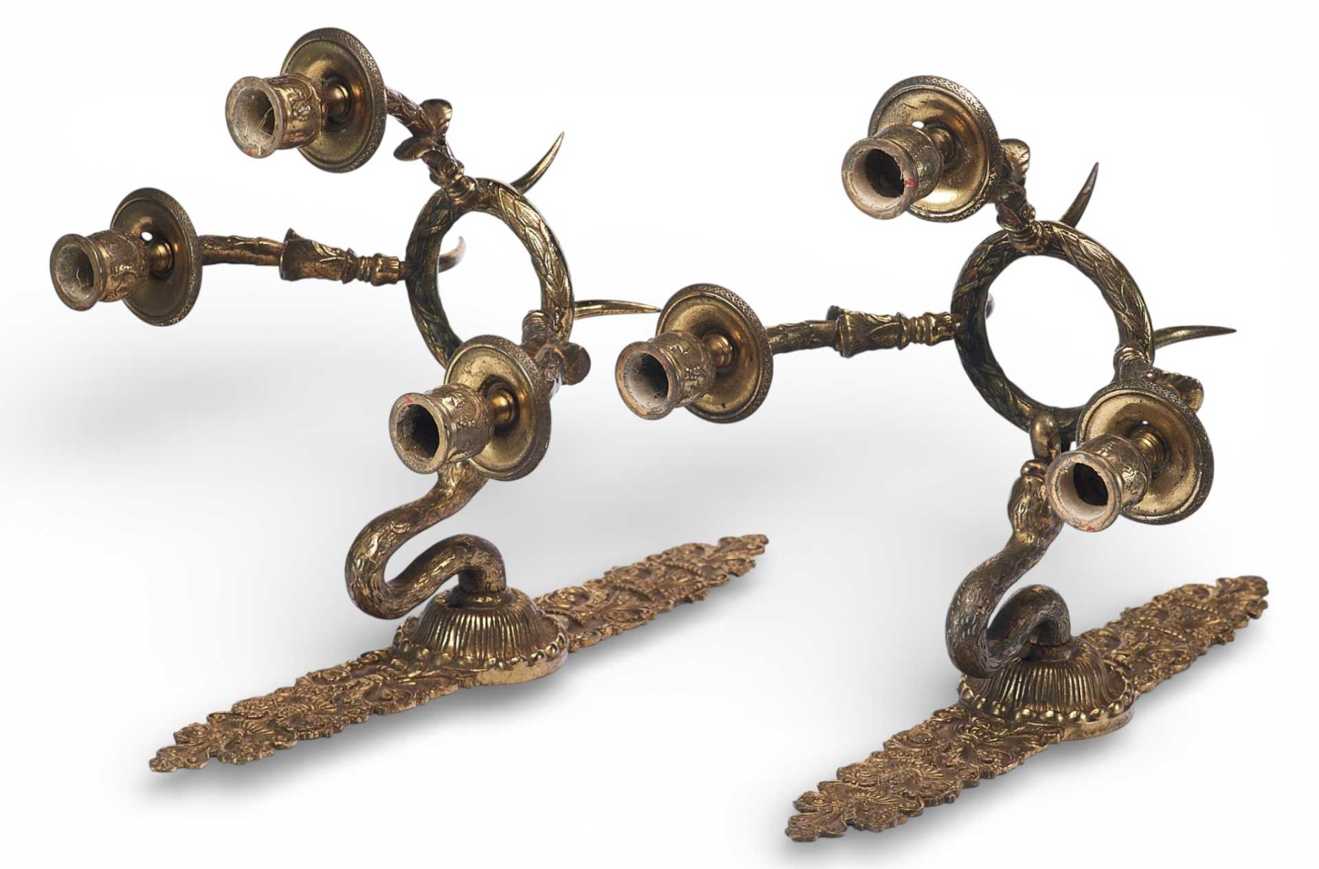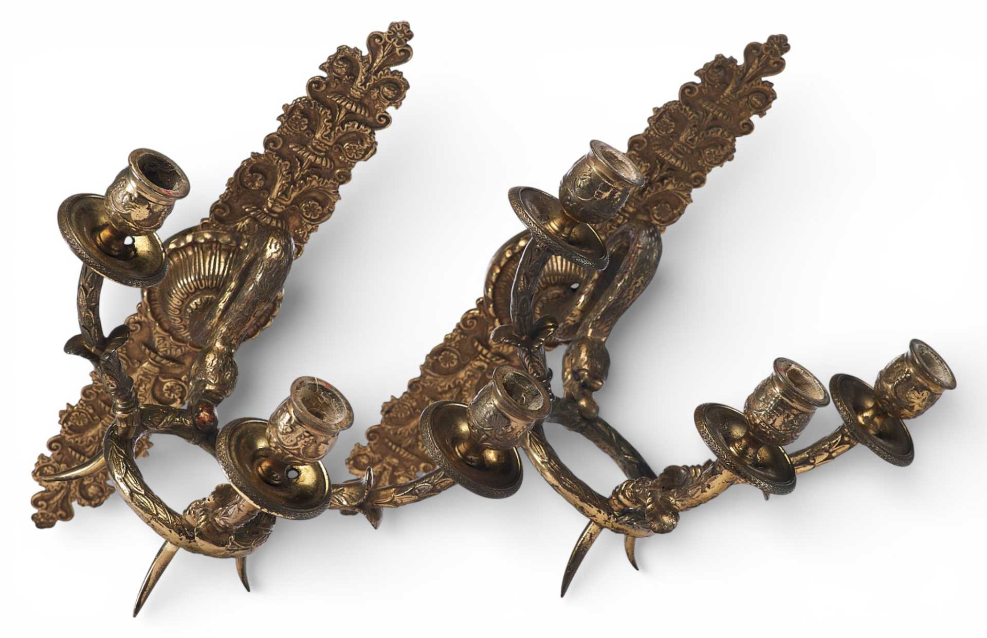 Парные бронзовые настенные бра с тремя рожками. Декоративное оформление предметов представляет собой смешение