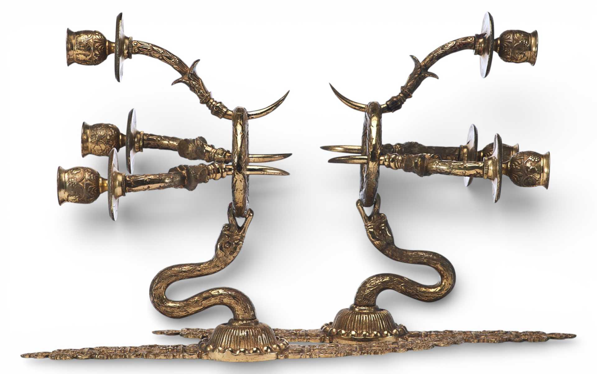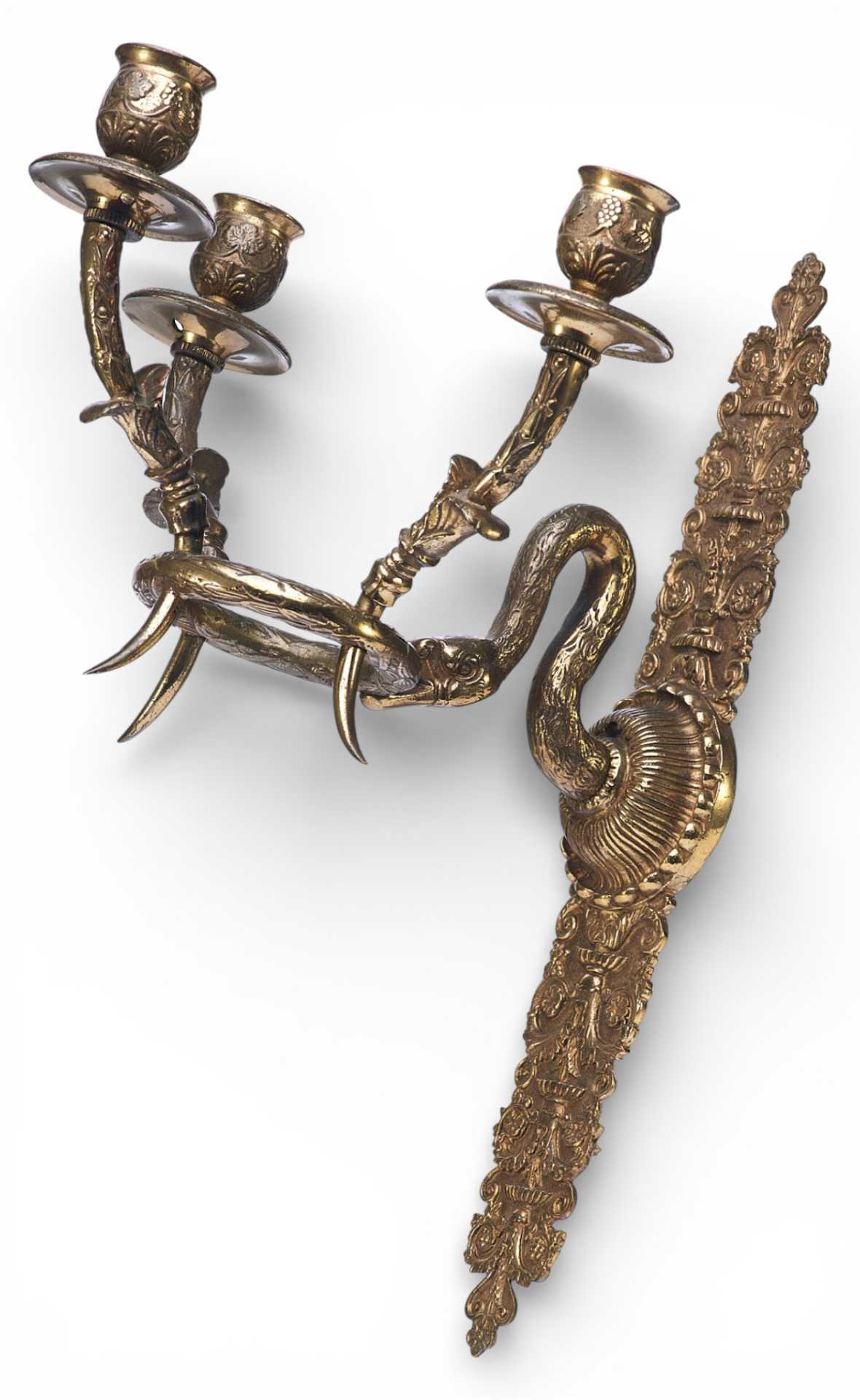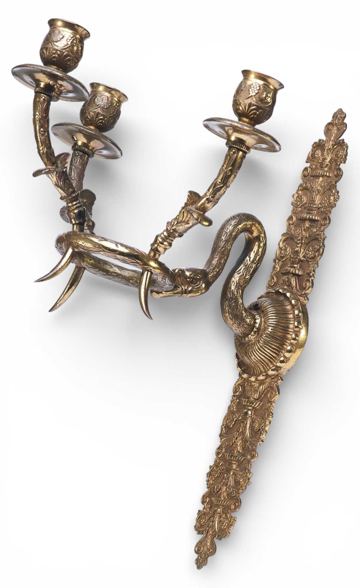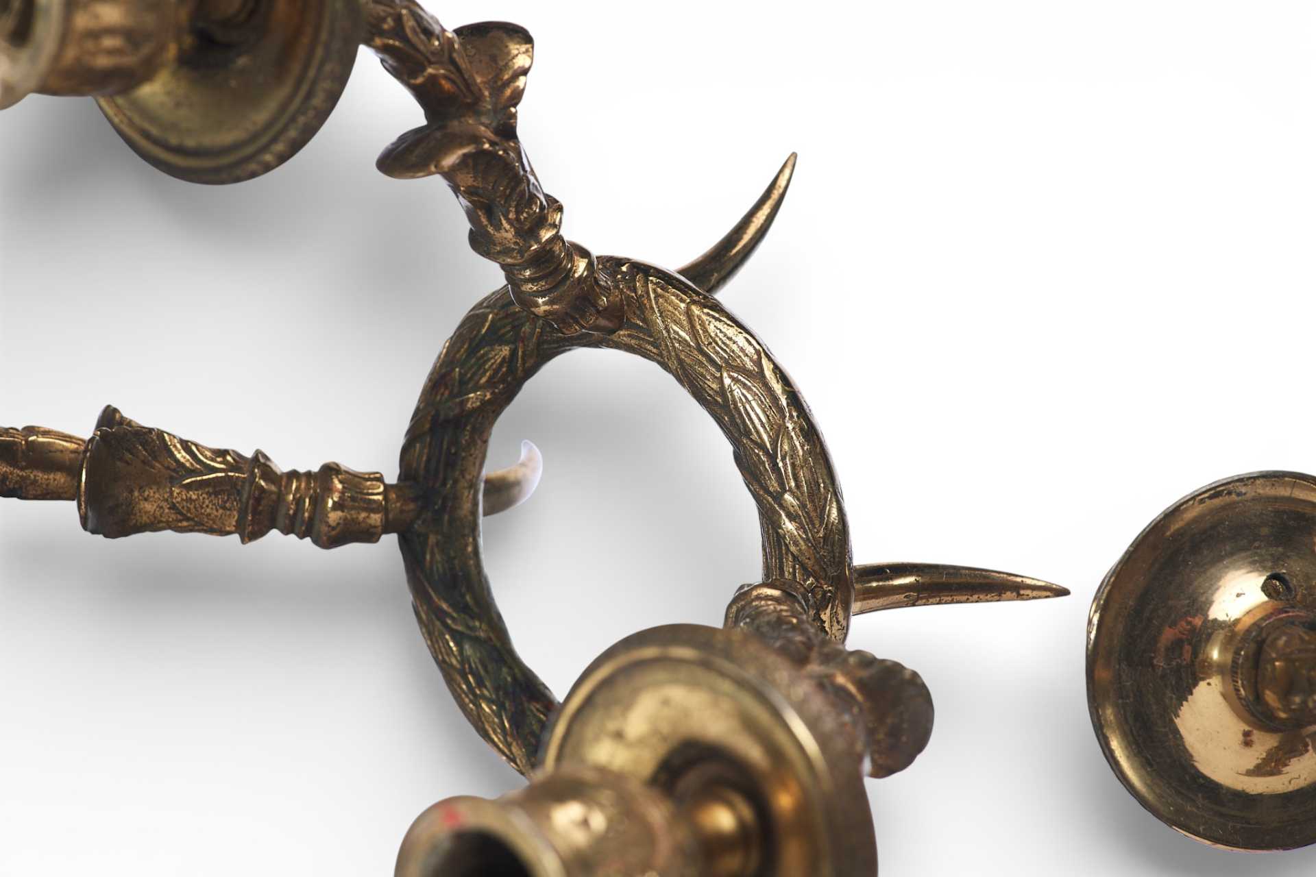 Парные бронзовые настенные бра с тремя рожками. Декоративное оформление предметов представляет собой смешение