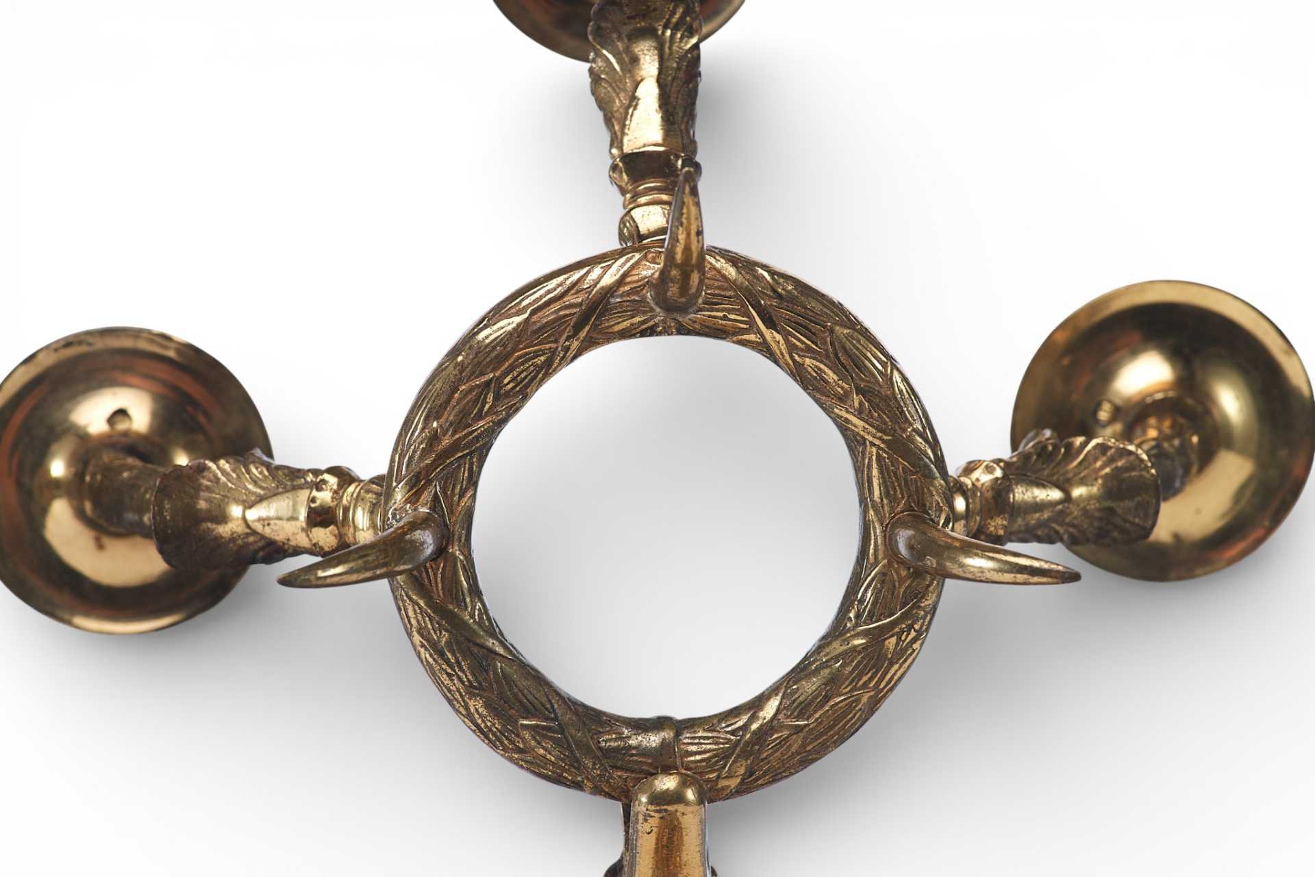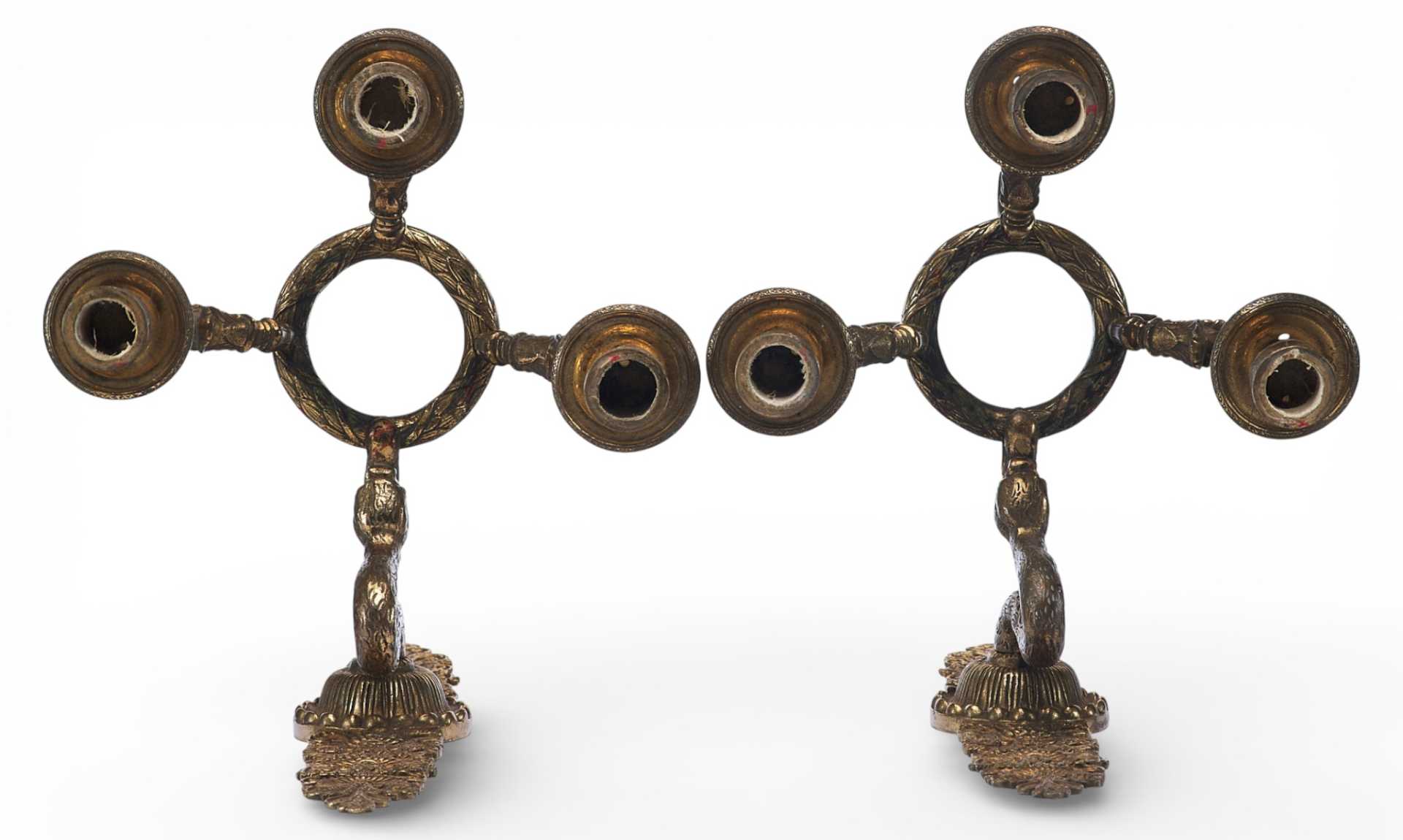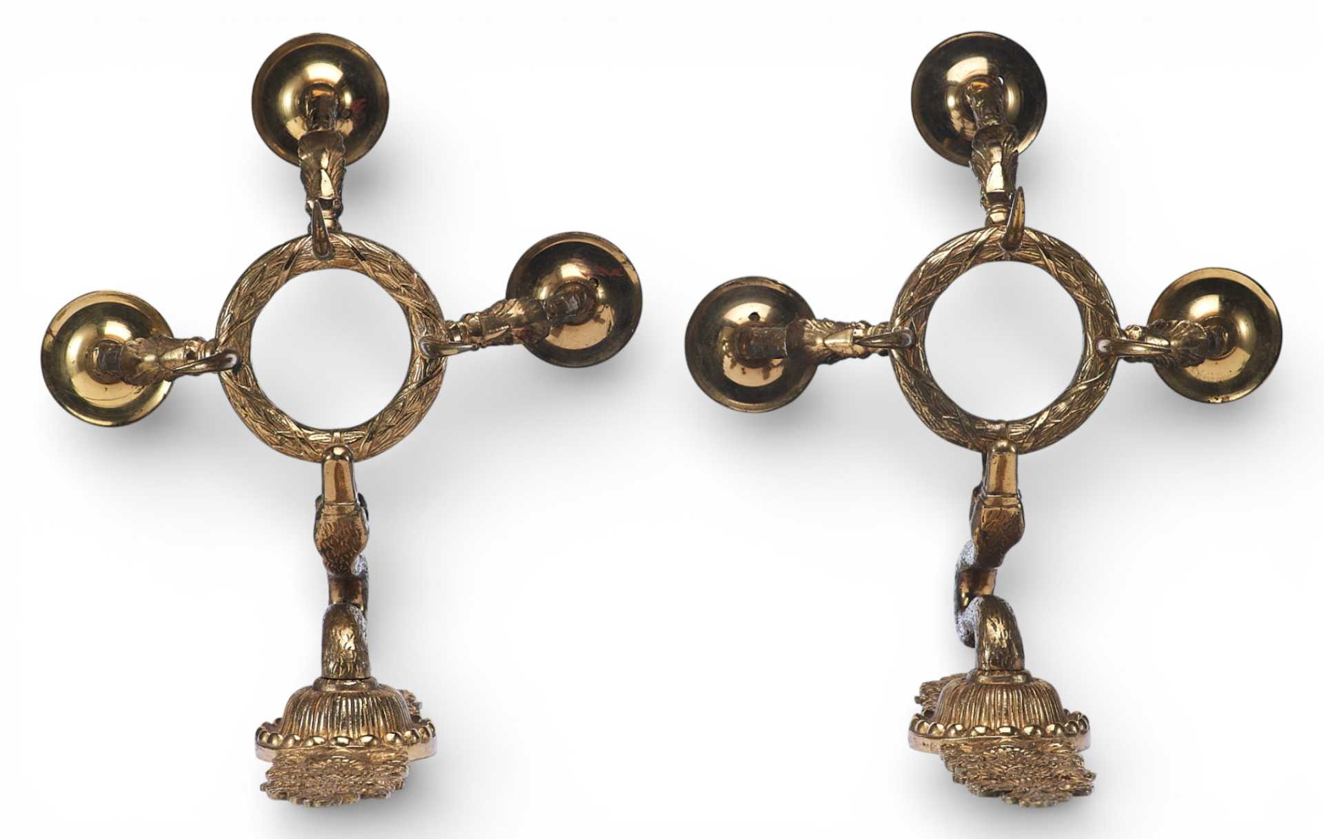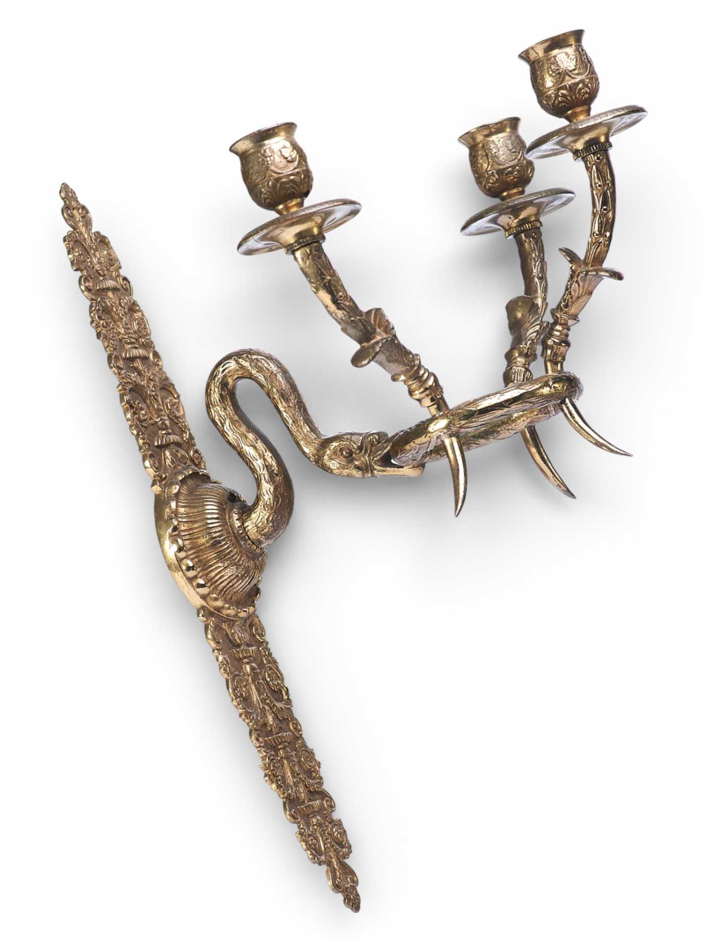 Парные бронзовые настенные бра с тремя рожками. Декоративное оформление предметов представляет собой смешение