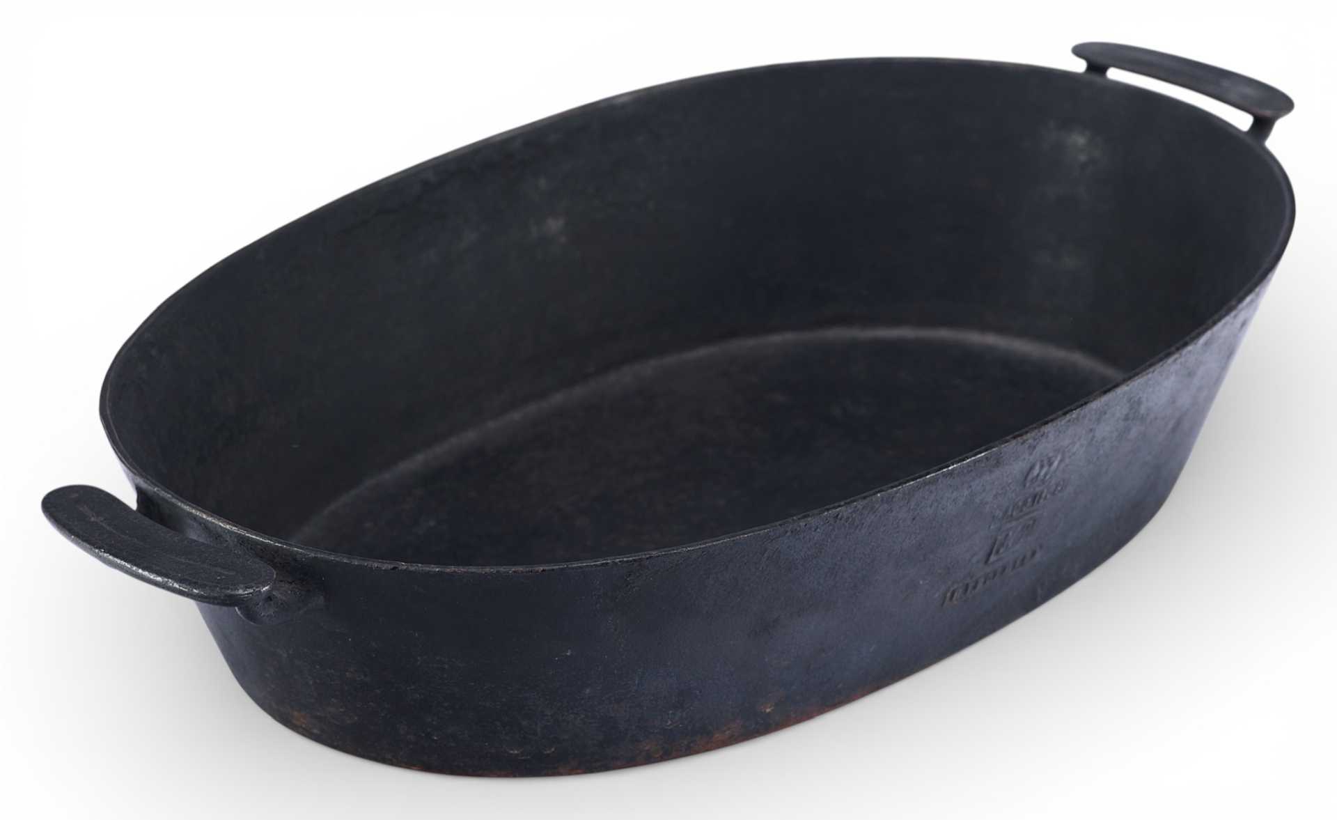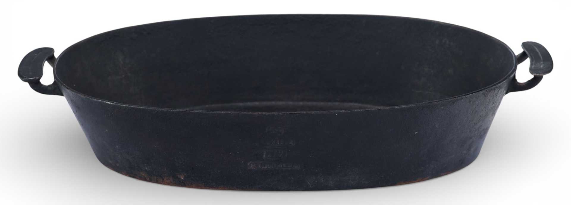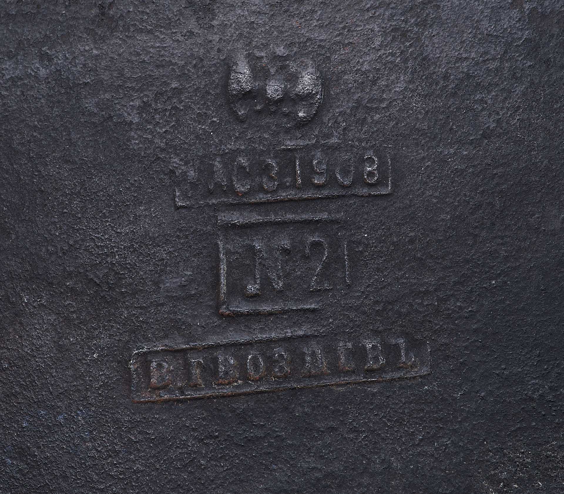 Гусятница с ручками. На краю стенок утятницы клеймо: двуглавый орел - герб Российской империи, «КАС.З. 1908» - клеймо