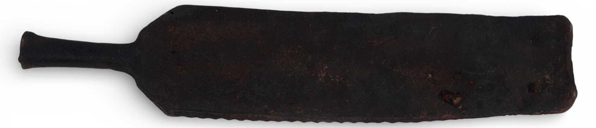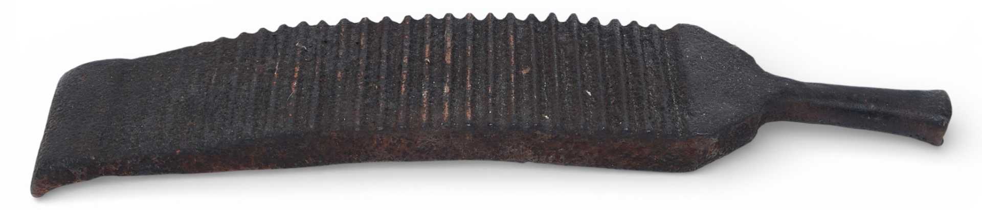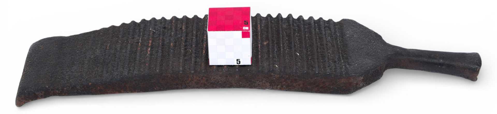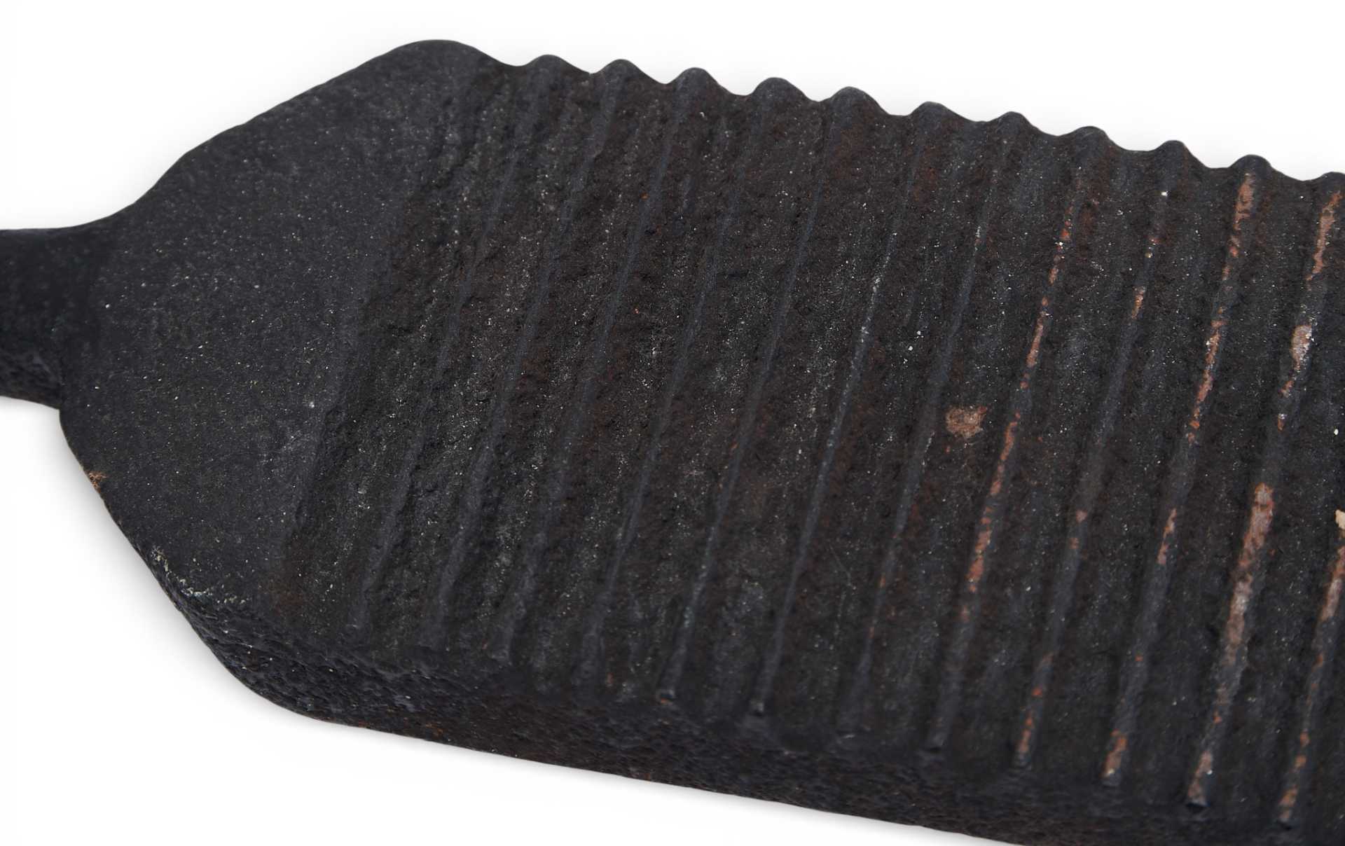 Чугунный рубель с рукоятью; одна из поверхностей рифленая. Рубель - один из ранних прототипов утюга. На Руси довольно
