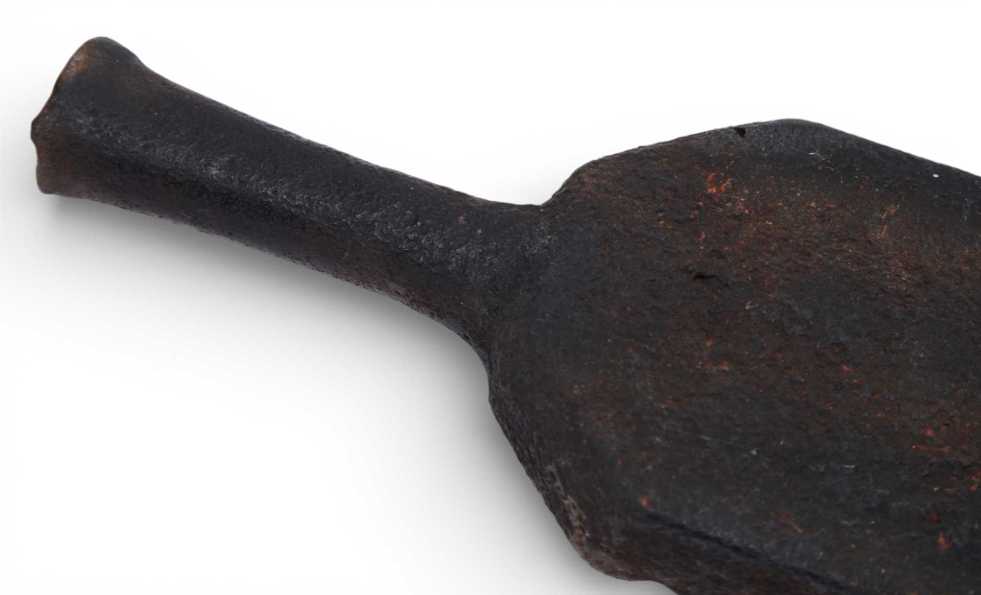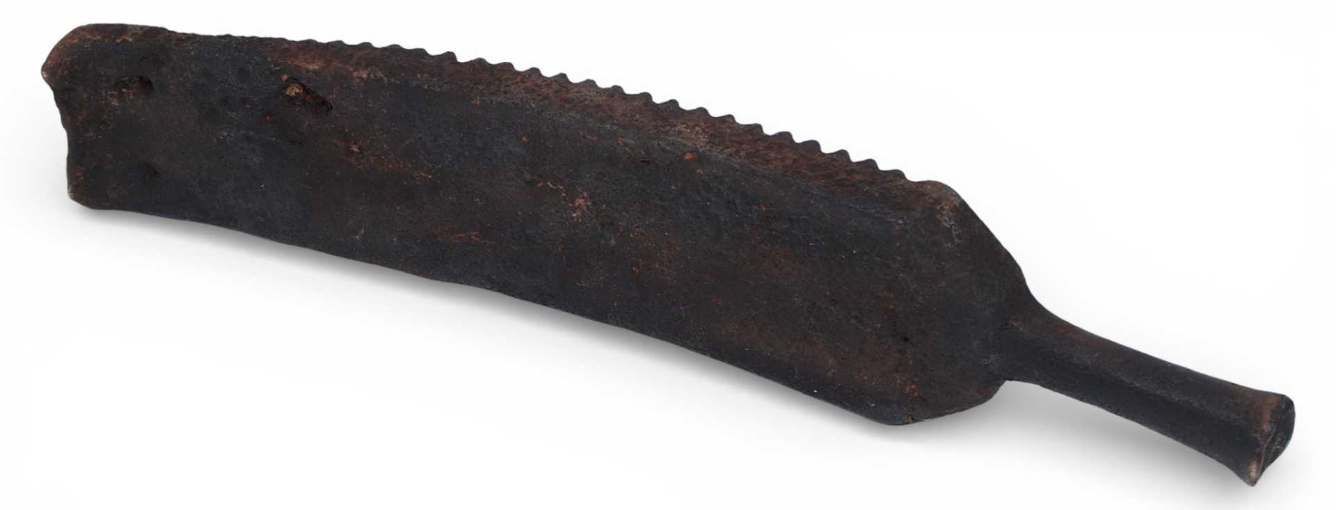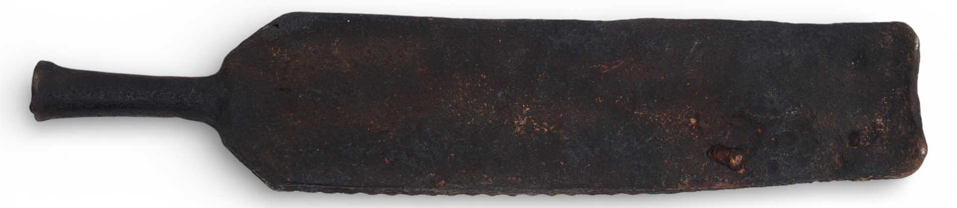 Чугунный рубель с рукоятью; одна из поверхностей рифленая. Рубель - один из ранних прототипов утюга. На Руси довольно