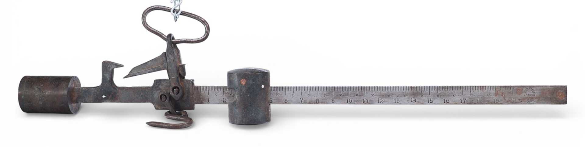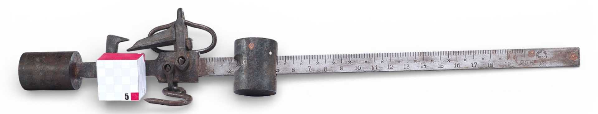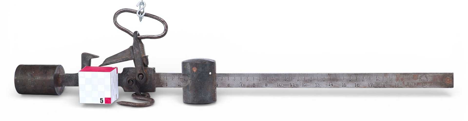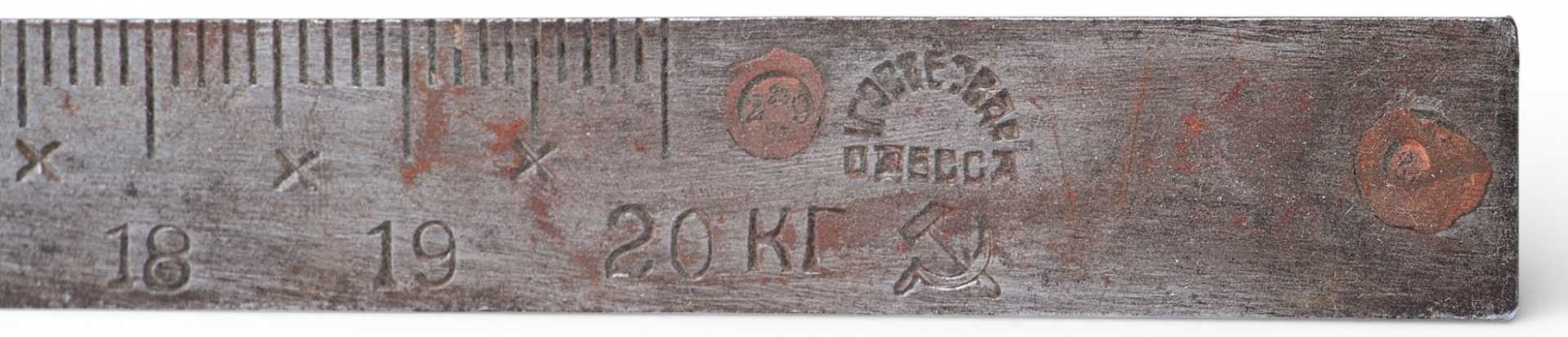 Весы «безмен» советского производства измерением до 20 кг. На линейке измерения клеймо места изготовления - Одесса, серп и молот, производственные штампы, изготовитель - «1ГОСВЕСЗАВ». На обратной стороне выбит номер - 82537.