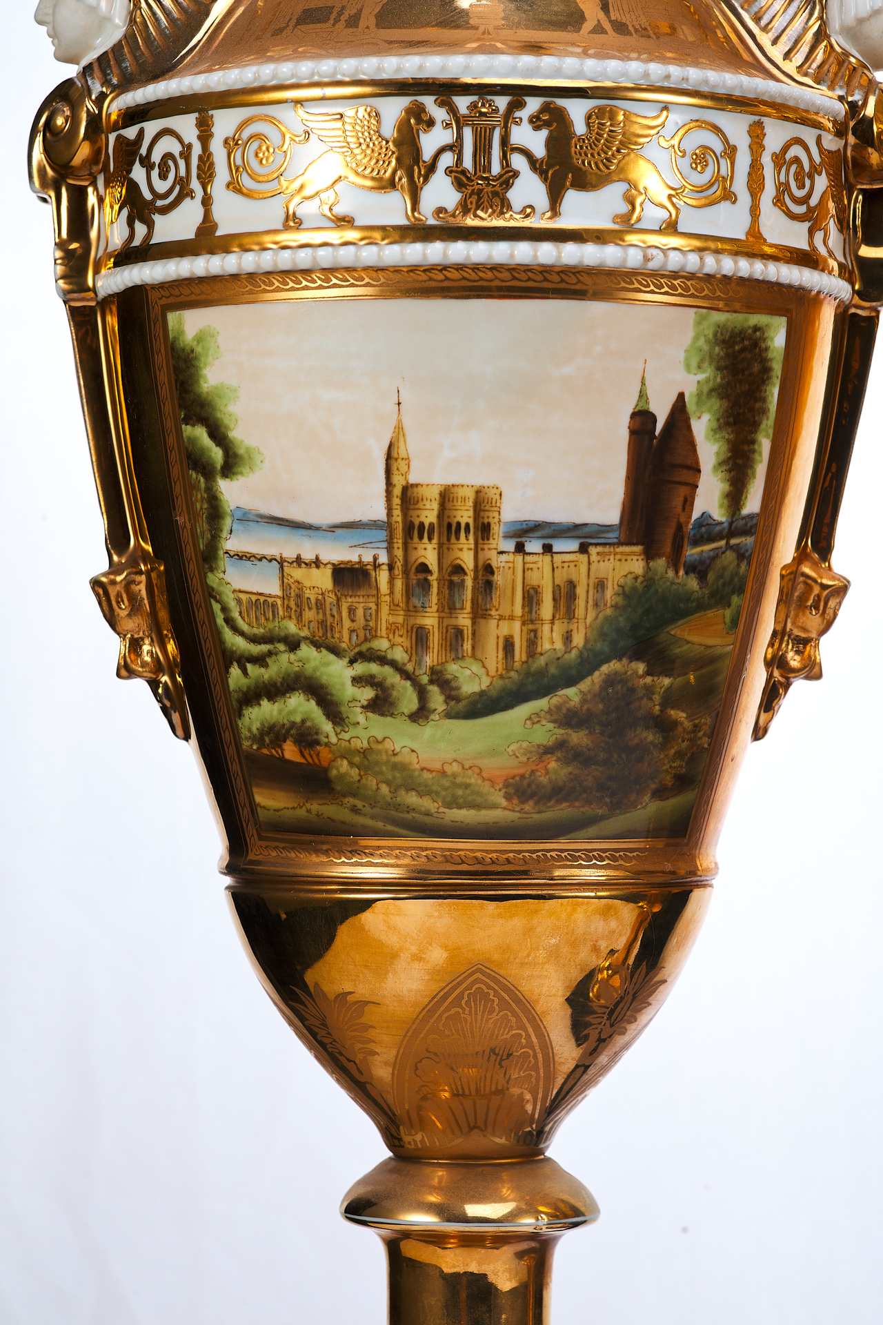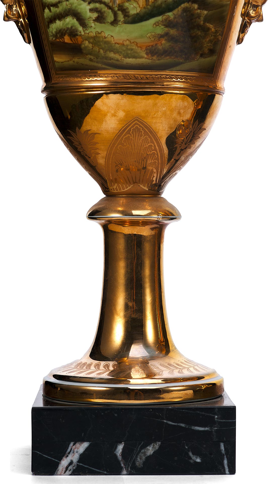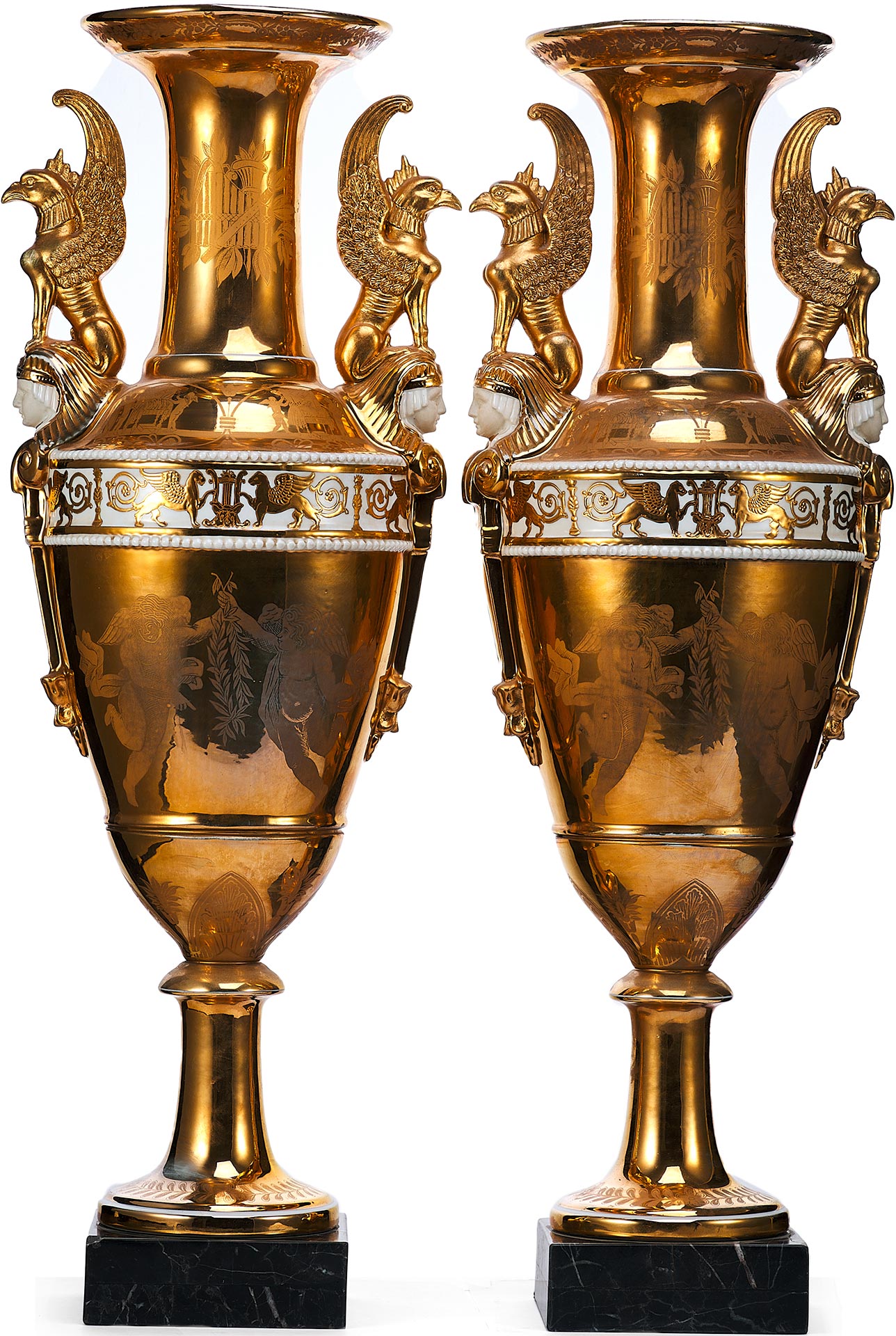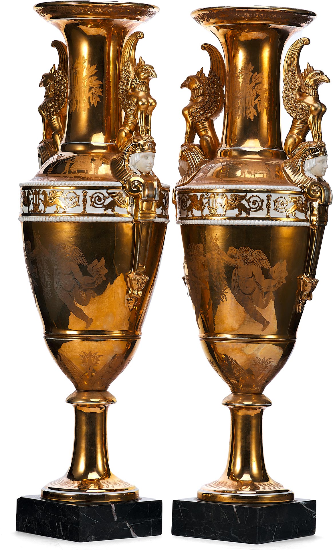 Парные вазы представляют собой великолепный образец сочетания живописи, пластики и функциональности. На вазы нанесен тщательно прорисованный живописный пейзаж с использованием архитектурных элементов. По бокам вазы декорированы стилизованными скульптурными изображениями мифических животных грифонов и юношеским лицом в головном уборе «немее», выполненном по подобию головного убора Тутанхамона. По окружности ваз нанесен позолотой орнамент с использованием тех же элементов. Обращение к египетским мотивам, с легкой их стилизацией под вкусы времени, было характерно для стиля ар-нуво. Также на вазах присутствуют «путти» - маленькие играющие ангелочки, спутники богини любви Венеры. Тончайшая роспись, лаконичное сочетание цветов, сдержанный, но в тоже время богатый и насыщенный декор говорят о высочайшем художественном уровне исполнения.