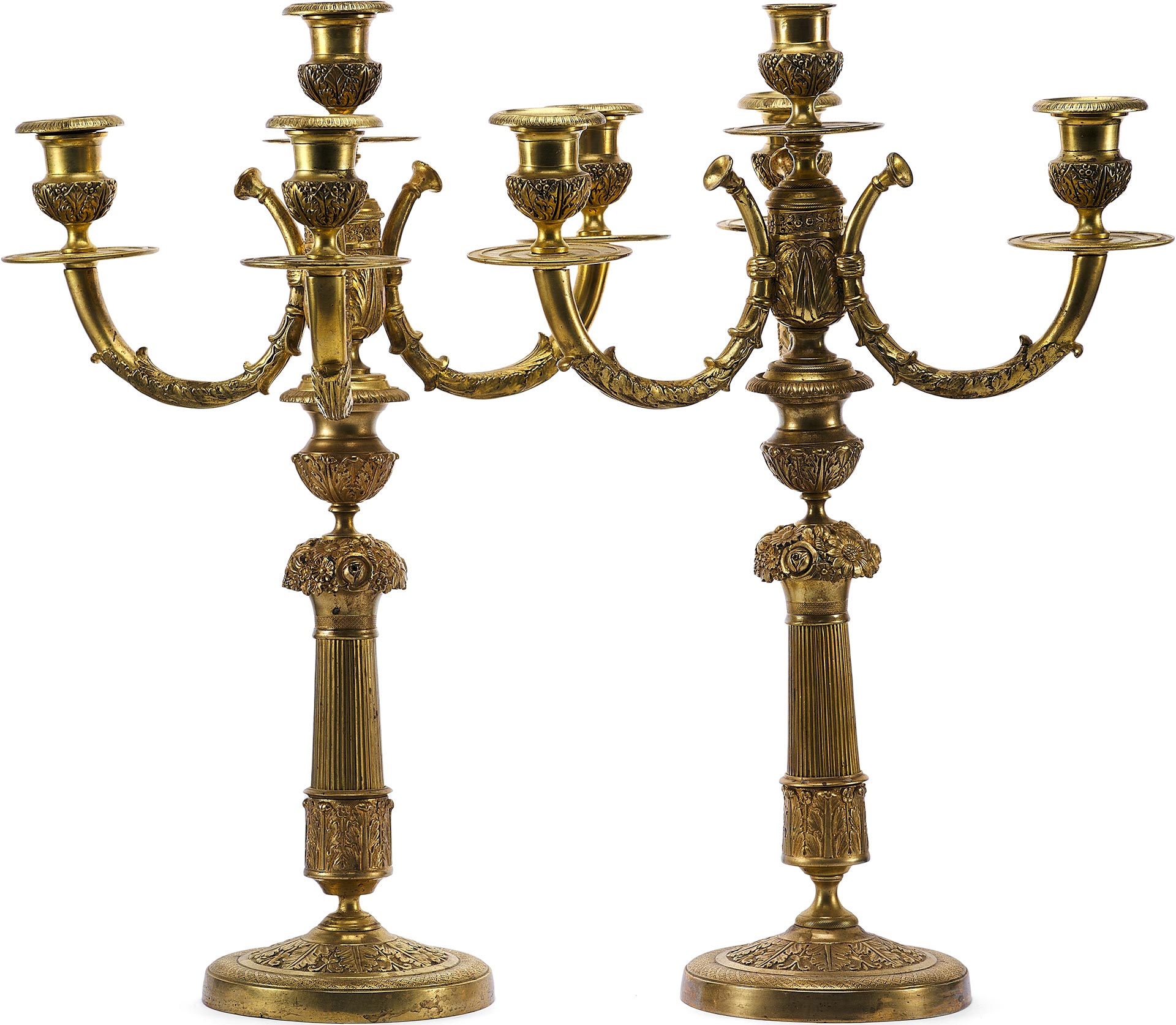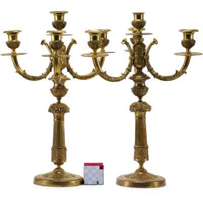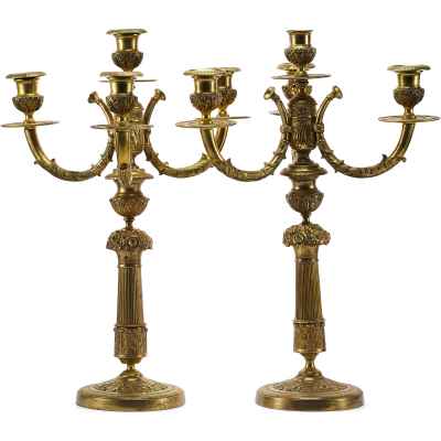 Пара канделябров, выполненная из бронзы, представляет собой изысканный образец неоклассического стиля, характерного для конца XIX века. Они предназначены для размещения четырех свечей и отличаются утонченностью линий и богатством декоративных элементов. Центральная балясина, возвышающаяся на профилированном основании, украшена рельефным орнаментом в виде растительных и цветочных мотивов. Ветви, поддерживающие свечные чаши, изогнуты в элегантной S-образной форме, что придаёт конструкции гармоничность и динамику.
