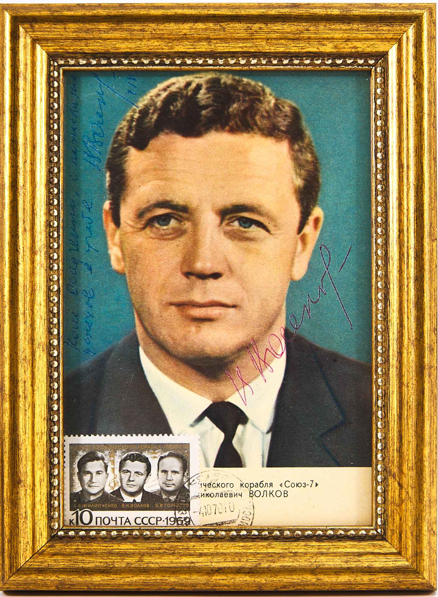 Почтовая карточка с изображением летчика космонавта В.Н. Волкова налечатата в московском издательстве “Правда” в 1969 году. Слева внизу маркапочтыСССР со спецгашением почтамта города Москвы.