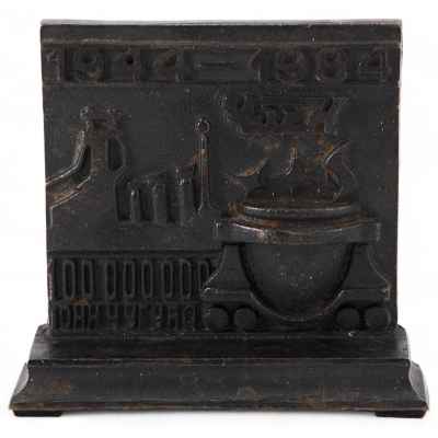 Изделие отлито из чугуна методом художественного литья, с последующей покраской, что характерно для продукции Каслинского машиностроительного завода. На внутренней стороне подставки отчётливо видны литые клейма: «Касли 1968», «Сделано в СССР» и табельный номер формовщика «46», что подтверждает подлинность и заводское происхождение произведения.