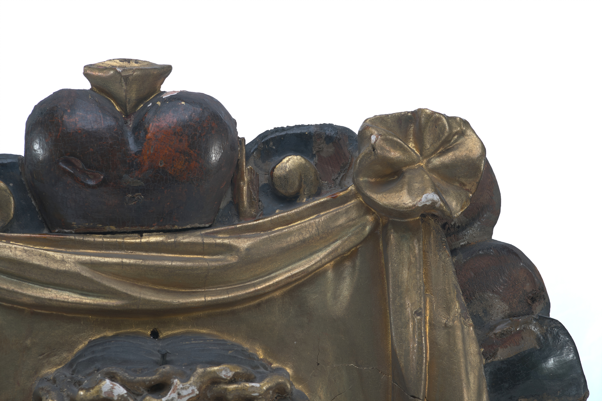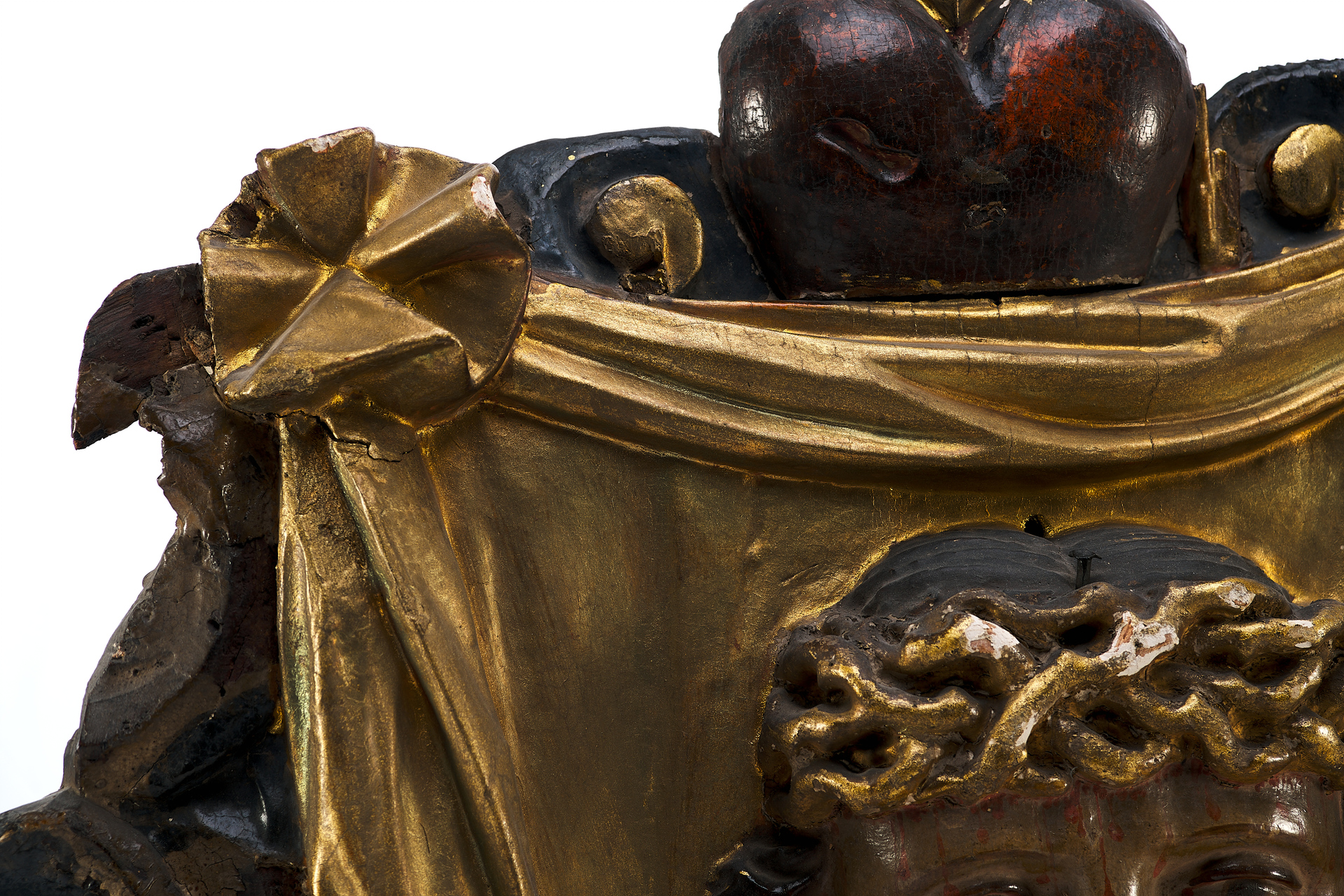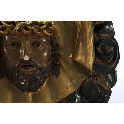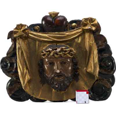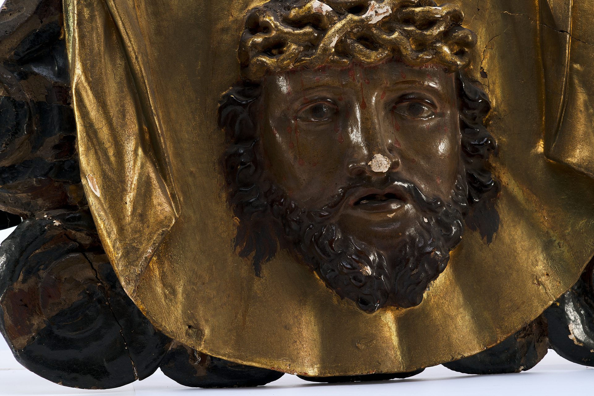 Центром рельефа служит лицевая часть Спасителя, изображённая с открытыми глазами, терновым венцом и кровоточащими следами на челе. Полотно, на котором запечатлён лик, обрамлено складками, тщательно переданными в древесной резьбе. Над убрусом помещена царская корона, что придаёт образу торжественность и подчёркивает божественное достоинство Христа. Всё произведение выполнено из дерева с применением резьбы и полихромной покраски, в том числе золочения, характерного для декоративного убранства религиозных предметов.