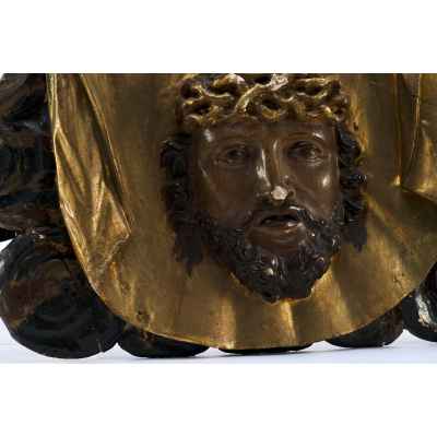 Рельефное изображение «Спас Нерукотворный» представляет собой выразительное произведение христианского сакрального искусства, выполненное во второй половине XIX века в одной из европейских мастерских. Композиция построена вокруг образа страдальческого лика Иисуса Христа, отпечатленного на убрусе — тканевом покрывале, символически воспроизводящем нерукотворный образ, согласно древнему христианскому преданию.