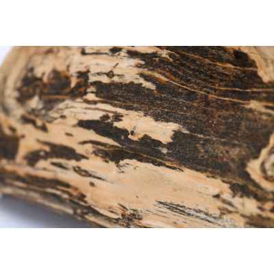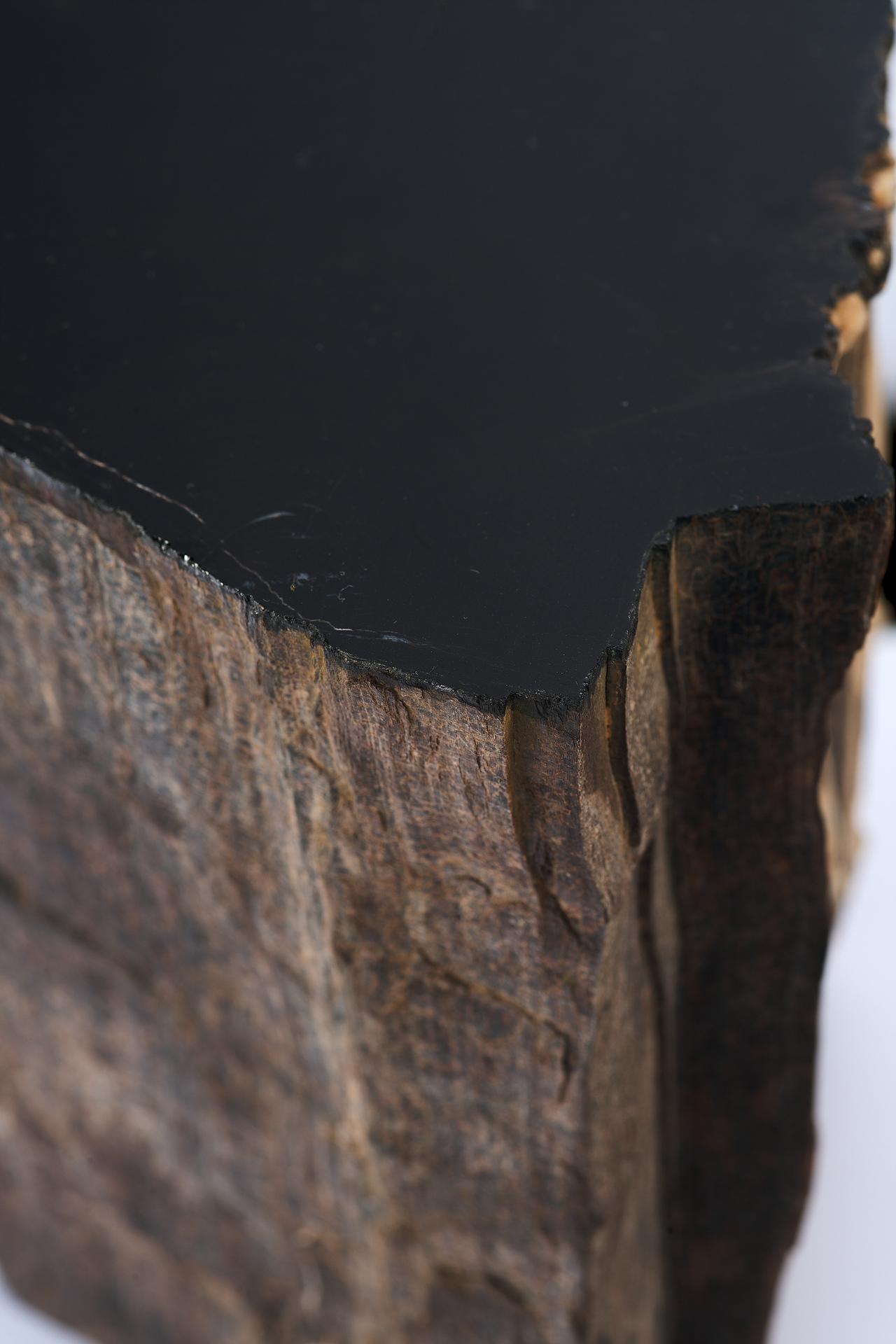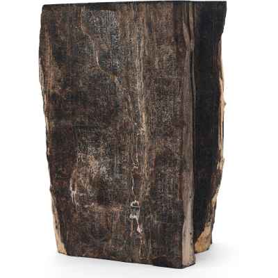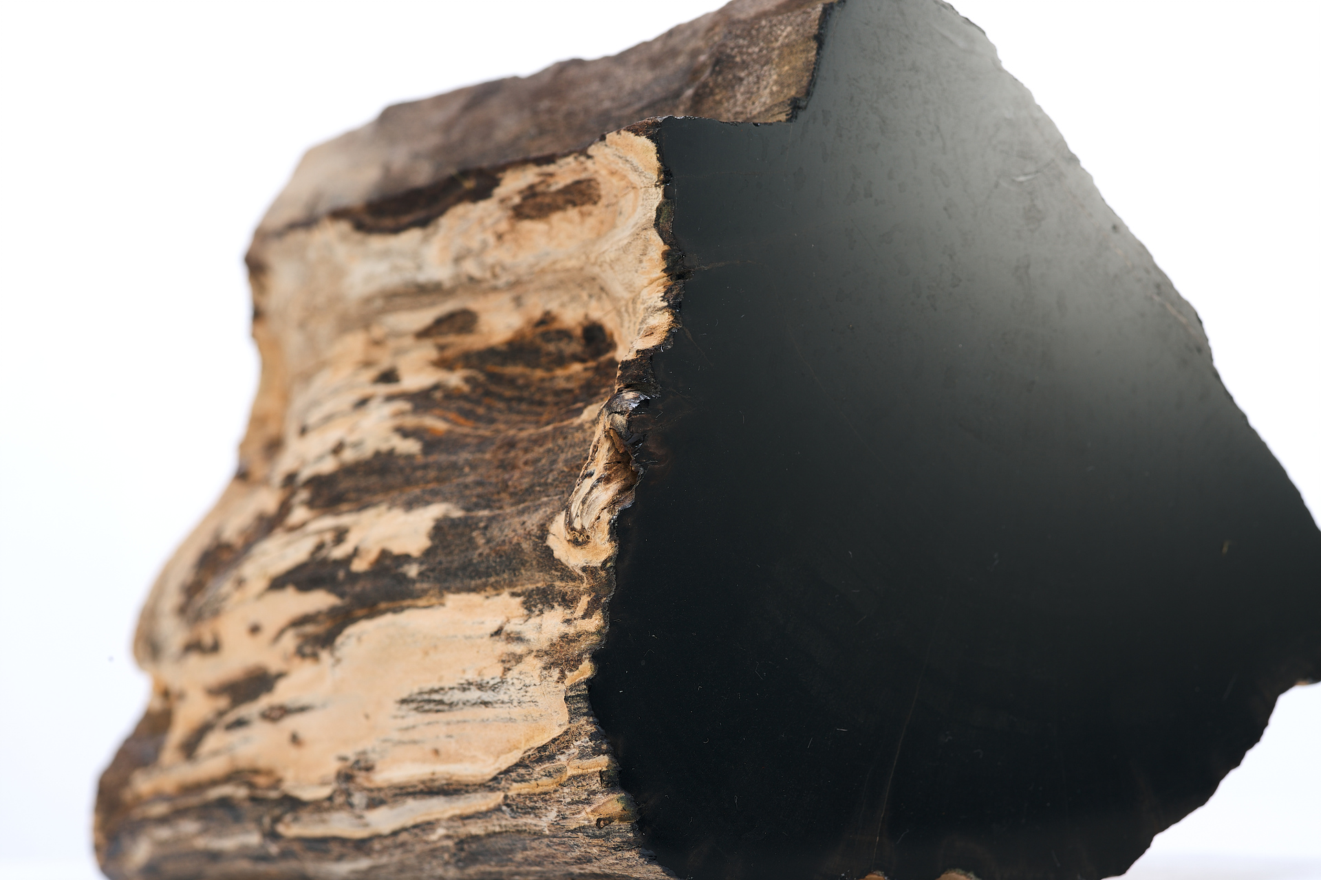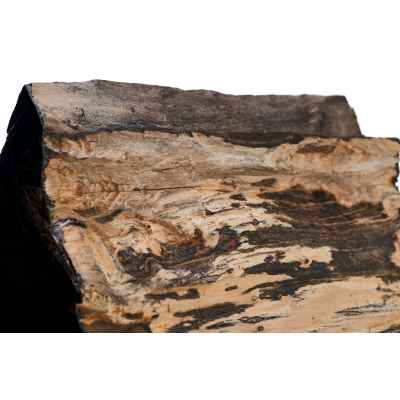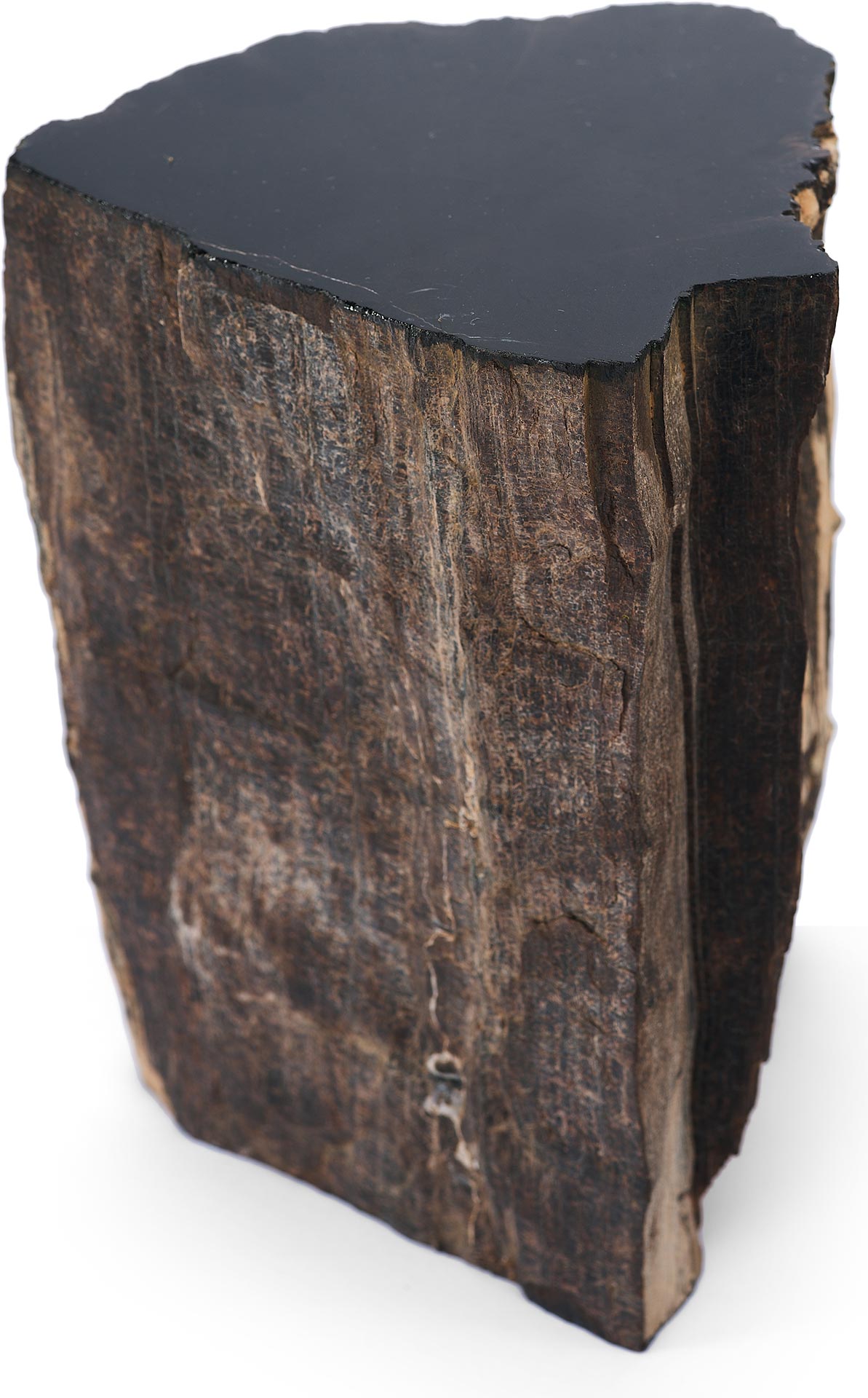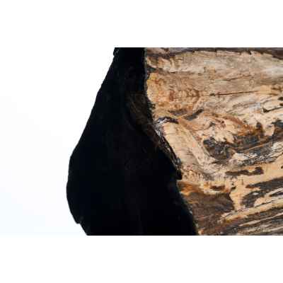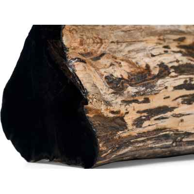 Предмет, представленный на изображении, является фрагментом окаменелого дерева, которое представляет собой минерализованную древесину, сохранившую свою внутреннюю структуру в результате естественных геологических процессов. Данный образец имеет серо-чёрную окраску, обусловленную наличием различных химических примесей, в частности железа и марганца, в среде формирования. Один из срезов фрагмента был полирован до глянцевого блеска, что подчёркивает текстуру материала и делает его особенно выразительным.