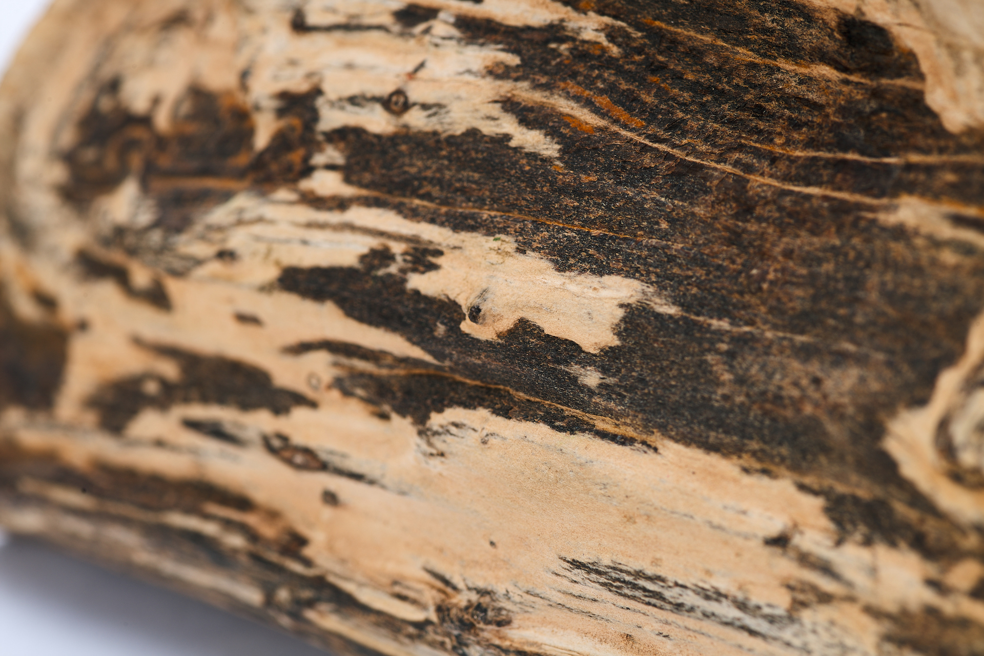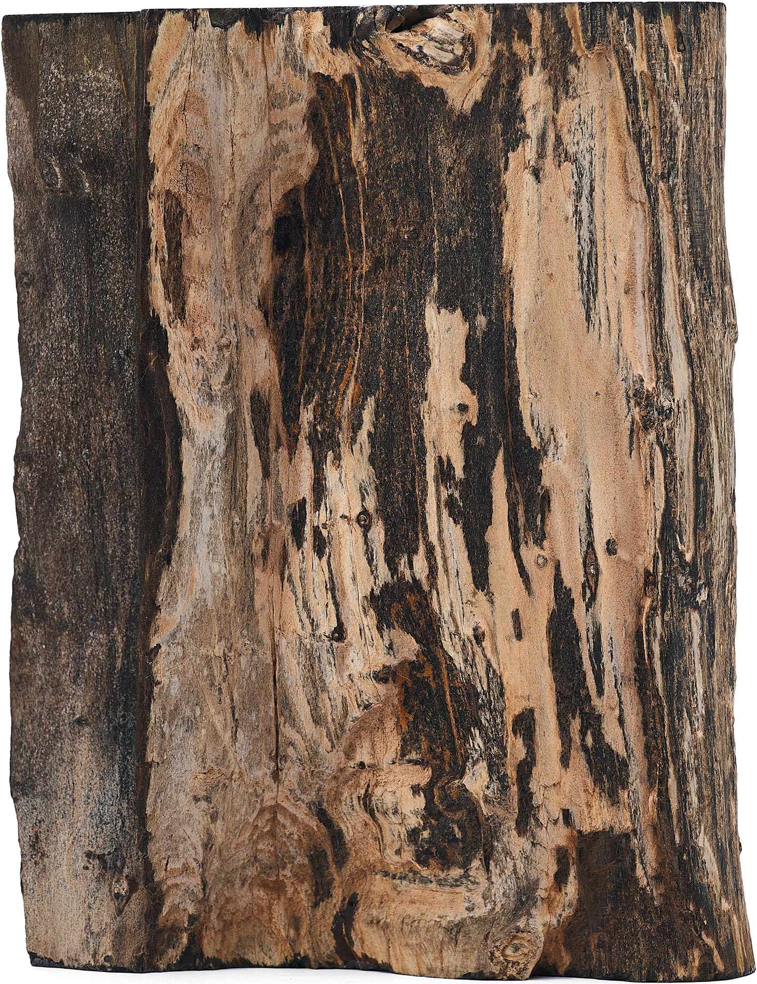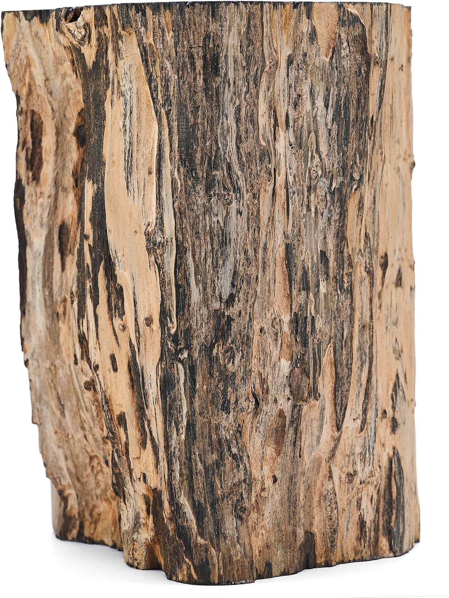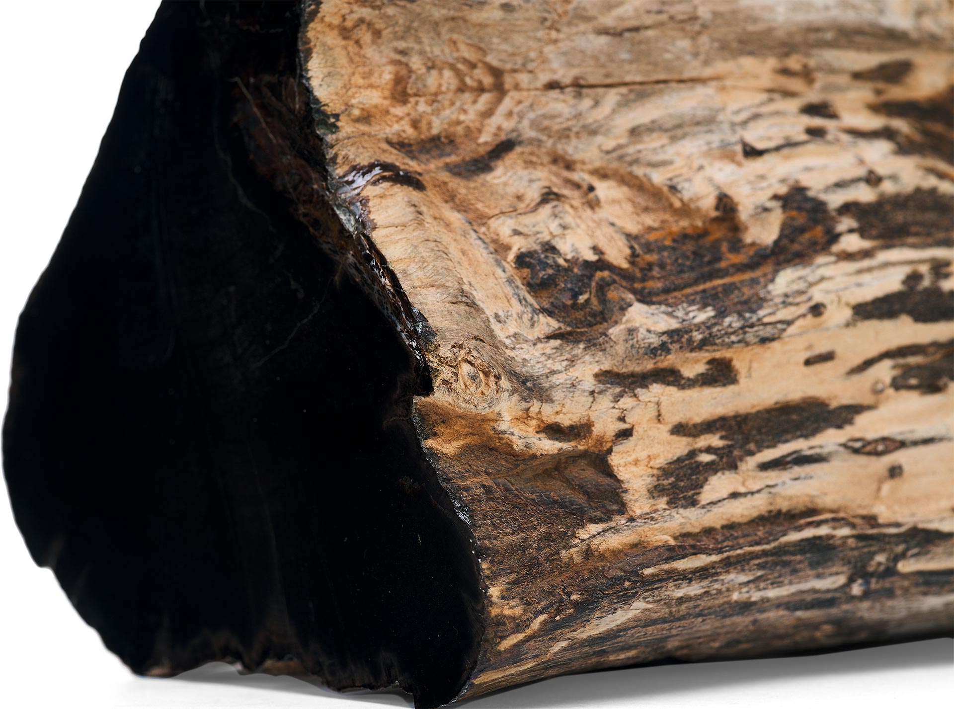 Предмет, представленный на изображении, является фрагментом окаменелого дерева, которое представляет собой минерализованную древесину, сохранившую свою внутреннюю структуру в результате естественных геологических процессов. Данный образец имеет серо-чёрную окраску, обусловленную наличием различных химических примесей, в частности железа и марганца, в среде формирования. Один из срезов фрагмента был полирован до глянцевого блеска, что подчёркивает текстуру материала и делает его особенно выразительным.