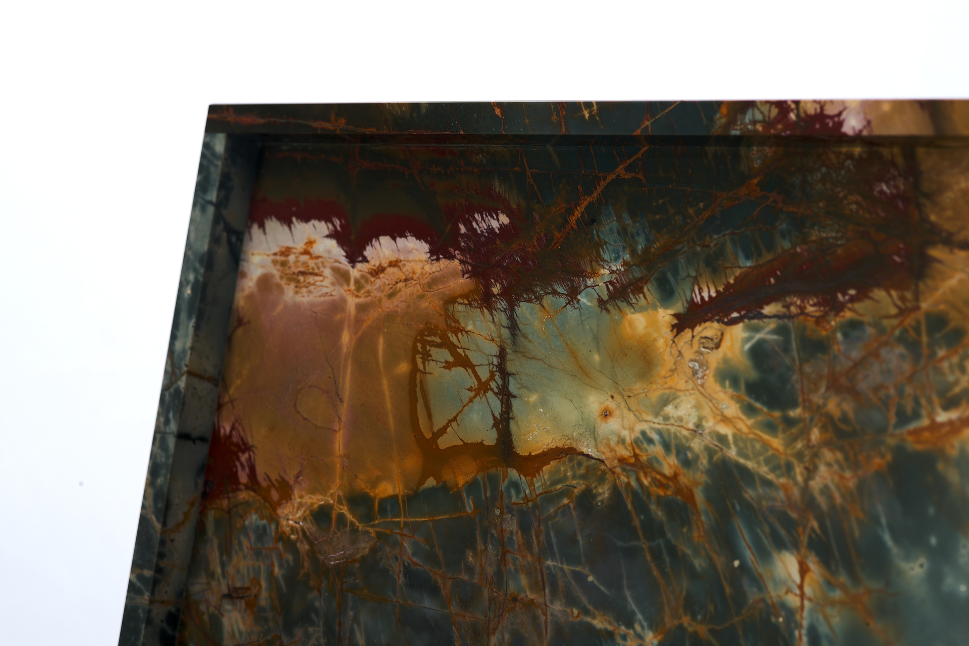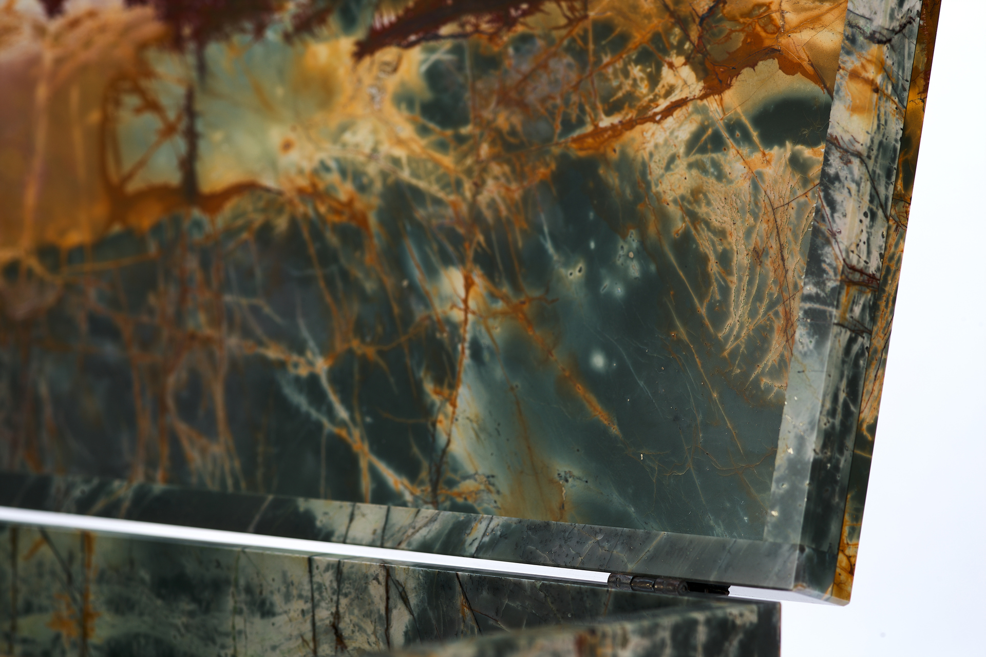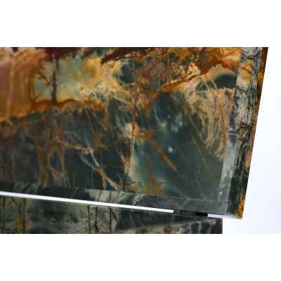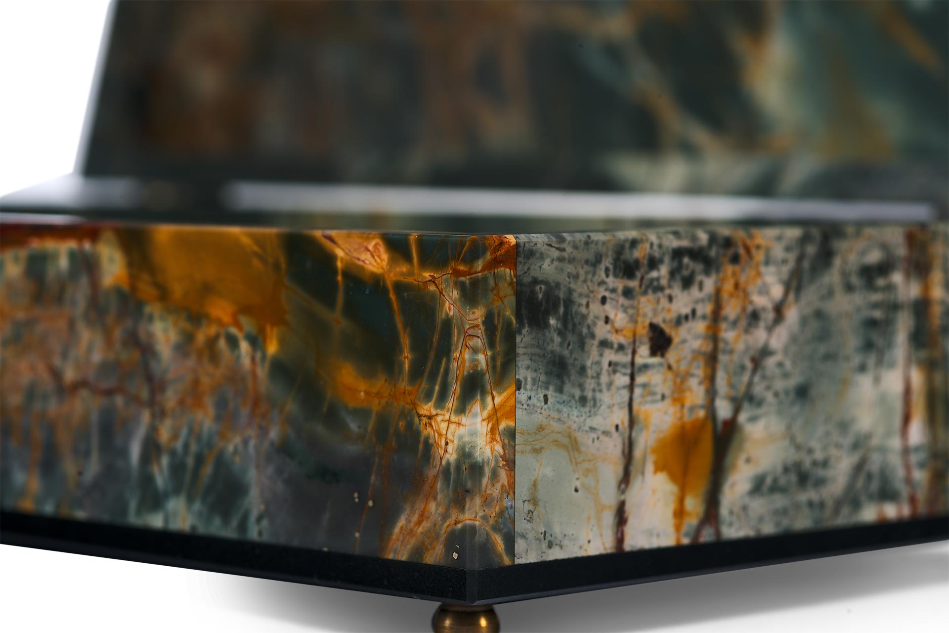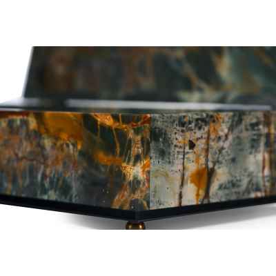 В качестве основного материала использована яшма Пикассо — разновидность полудрагоценного камня, известная своими необычными цветовыми переходами и линейными узорами, напоминающими абстрактные картины Пикассо. Этот вид яшмы ценится не только за декоративные свойства, но и за природное многоцветие, возникающее в результате заполнения трещин в горной породе другими минералами под воздействием геотермального давления.