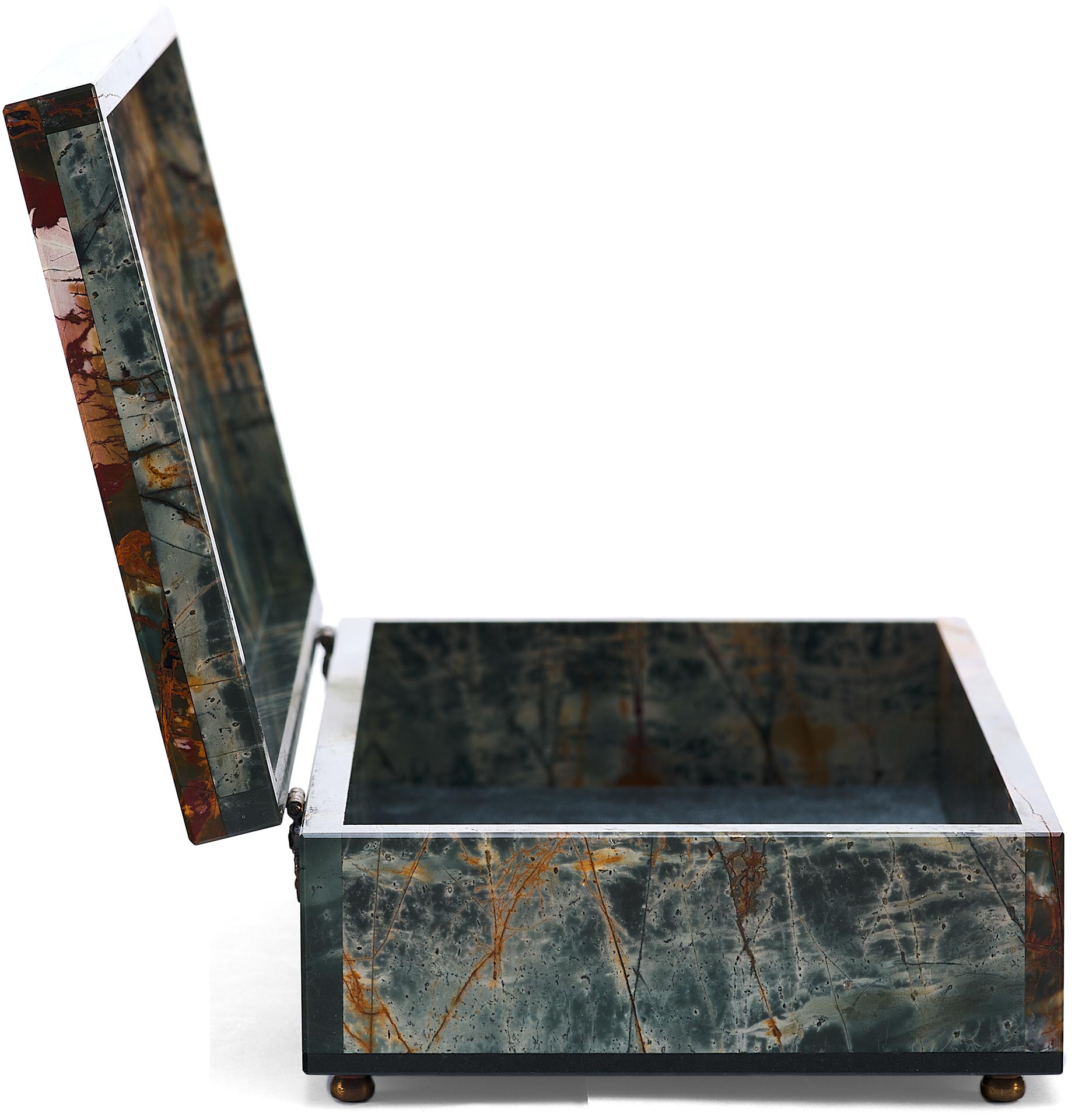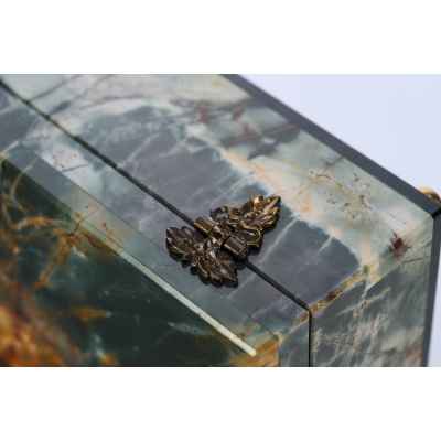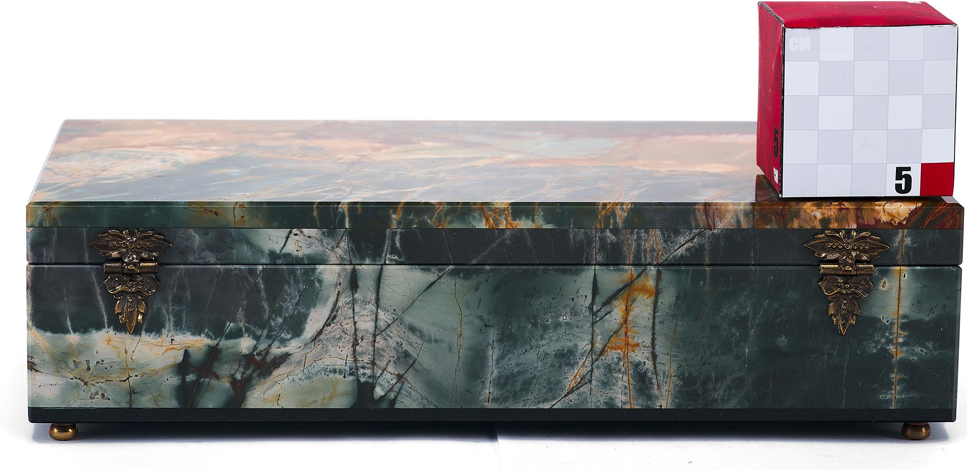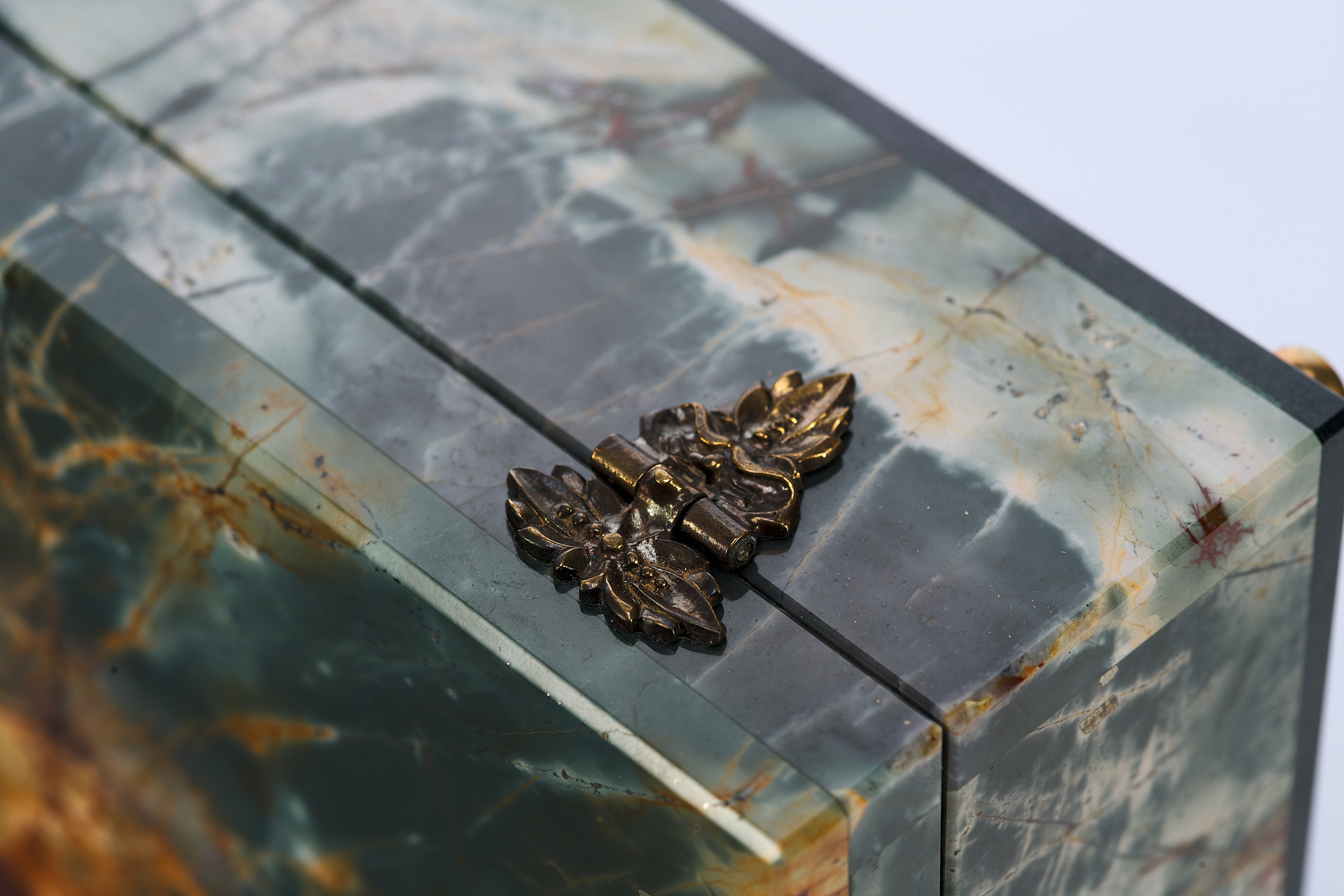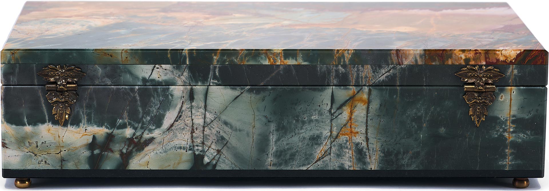 Представленный предмет — шкатулка из яшмы Пикассо, выполненная российским мастером Александром Антоновым. Шкатулка имеет строгую прямоугольную форму, корпус установлен на четырех металлических ножках, что придает ей устойчивость и завершенность. Изделие состоит из основного корпуса и крышки с аккуратной фурнитурой из металла с декоративным тиснением. Поверхность камня тщательно отполирована, что позволяет в полной мере раскрыть природный рисунок яшмы.