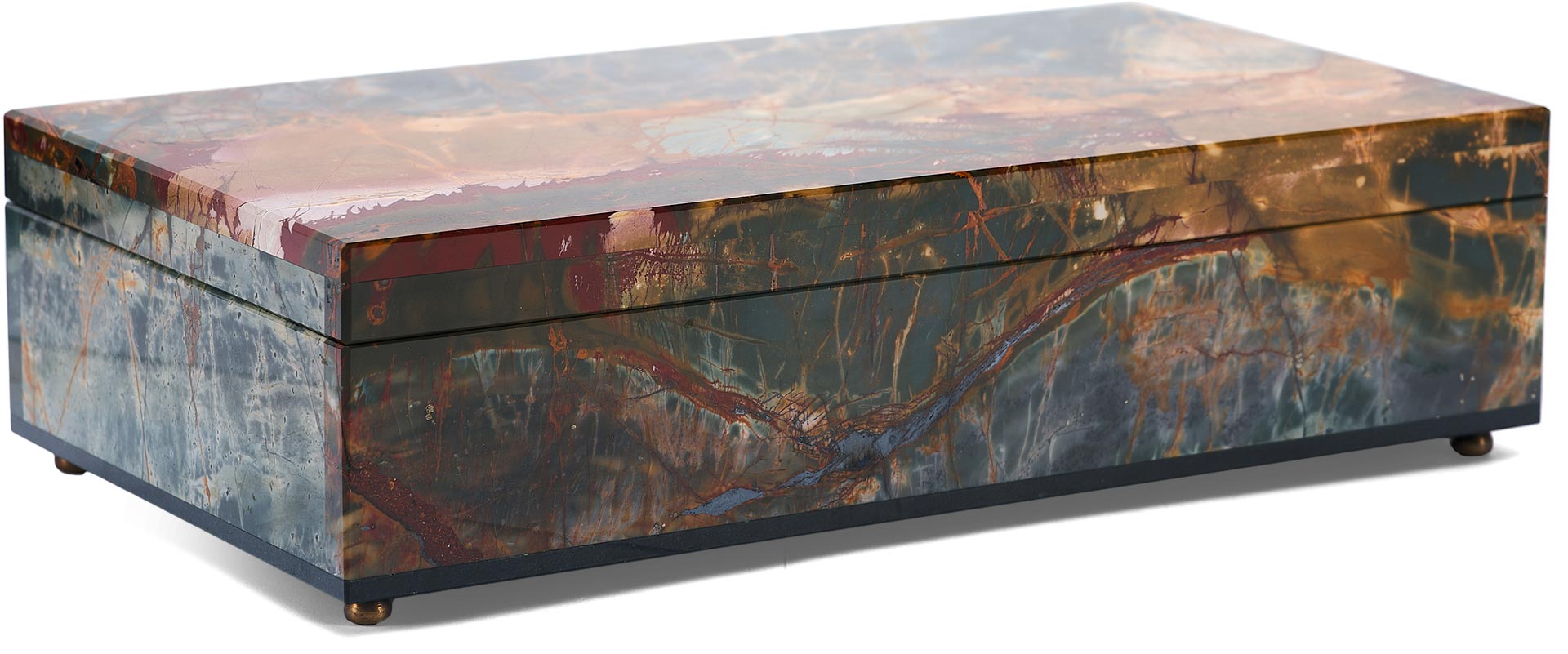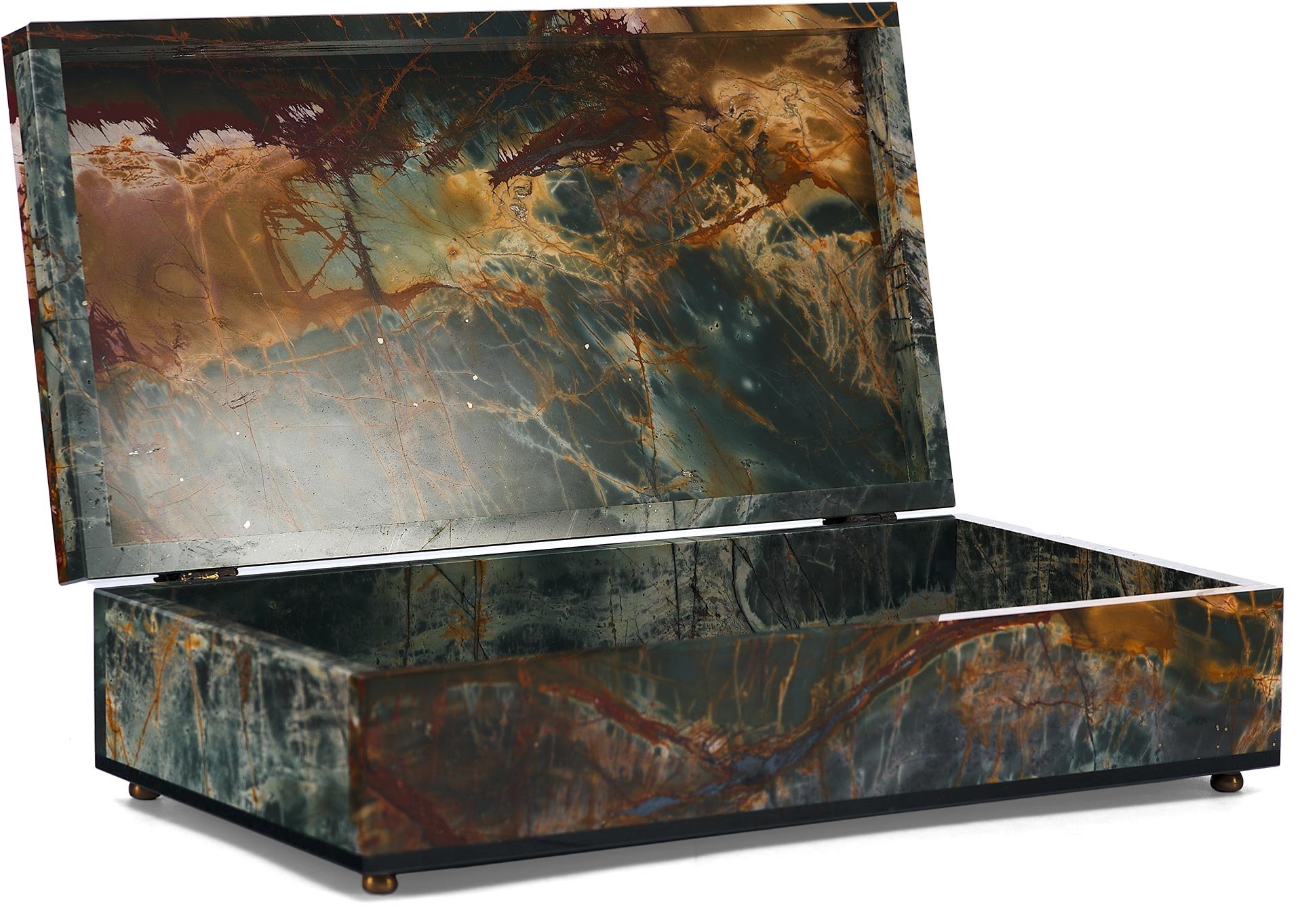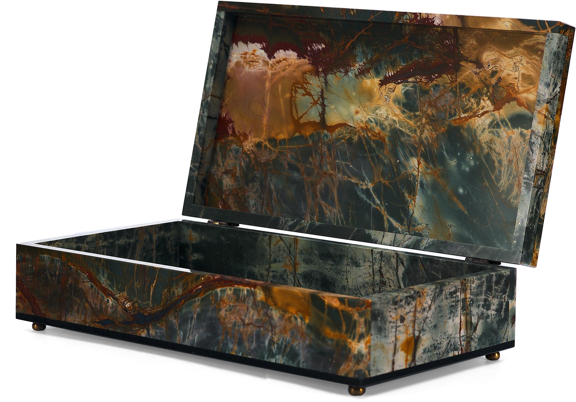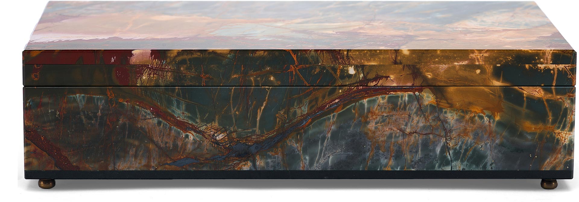 Представленный предмет — шкатулка из яшмы Пикассо, выполненная российским мастером Александром Антоновым. Шкатулка имеет строгую прямоугольную форму, корпус установлен на четырех металлических ножках, что придает ей устойчивость и завершенность. Изделие состоит из основного корпуса и крышки с аккуратной фурнитурой из металла с декоративным тиснением. Поверхность камня тщательно отполирована, что позволяет в полной мере раскрыть природный рисунок яшмы.